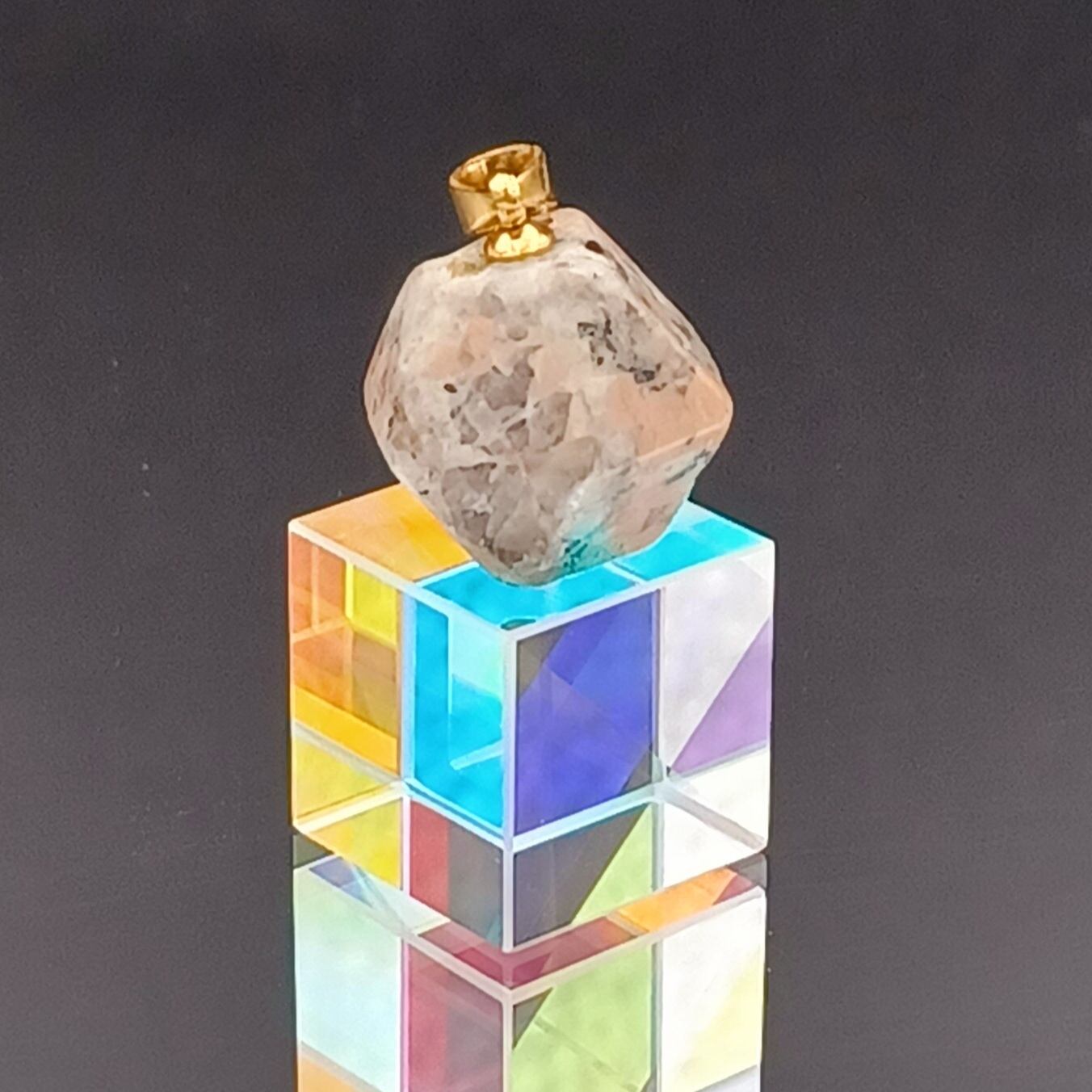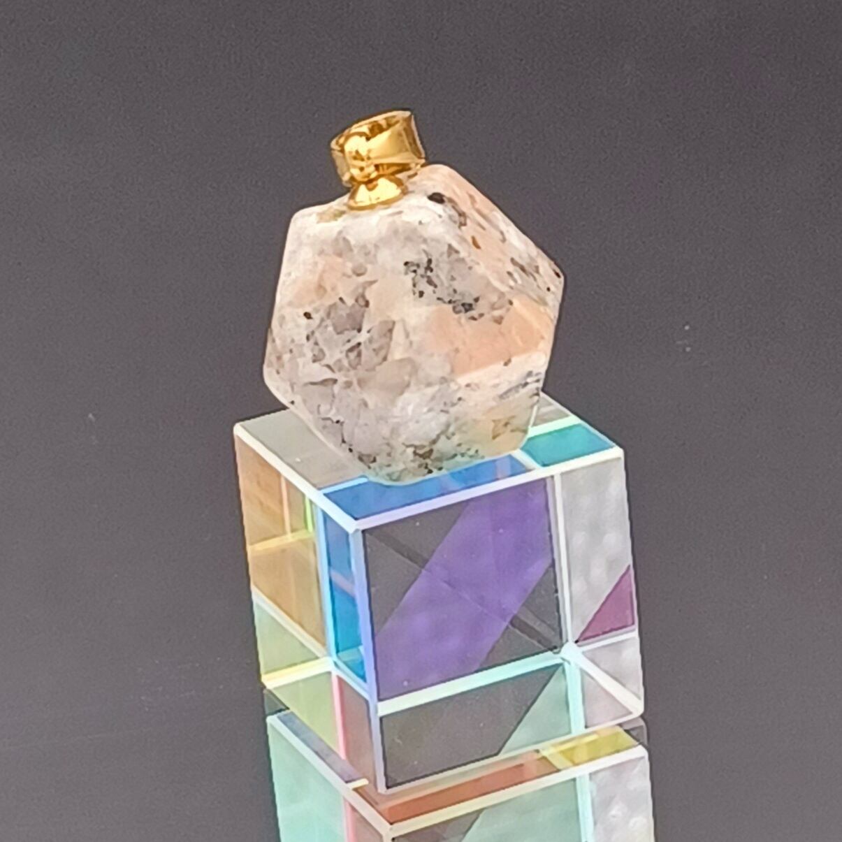 このペンダントは、日本の天然石「万成石(ピンクロイヤルマイカイト)」を使用し、神聖幾何学の「十四面体」に仕上げました。岡山県産の希少な石で、白亜紀後期(約7700~8800万年前)に形成された歴史ある鉱石です。独特のピンク色はカリ長石による発色で、「桃太郎の石」や「龍王石」とも呼ばれています。
