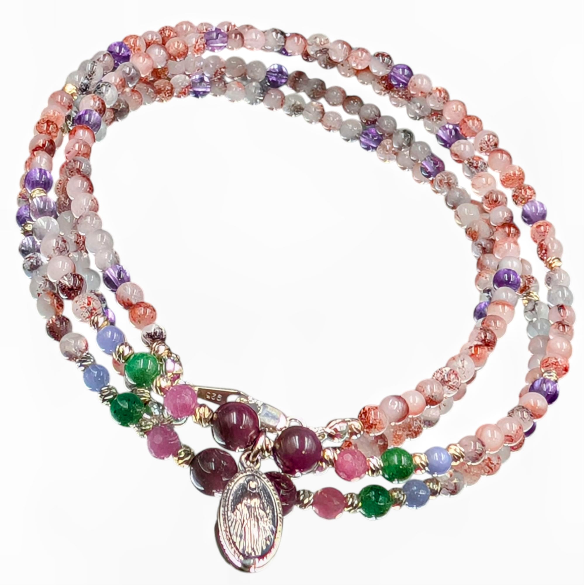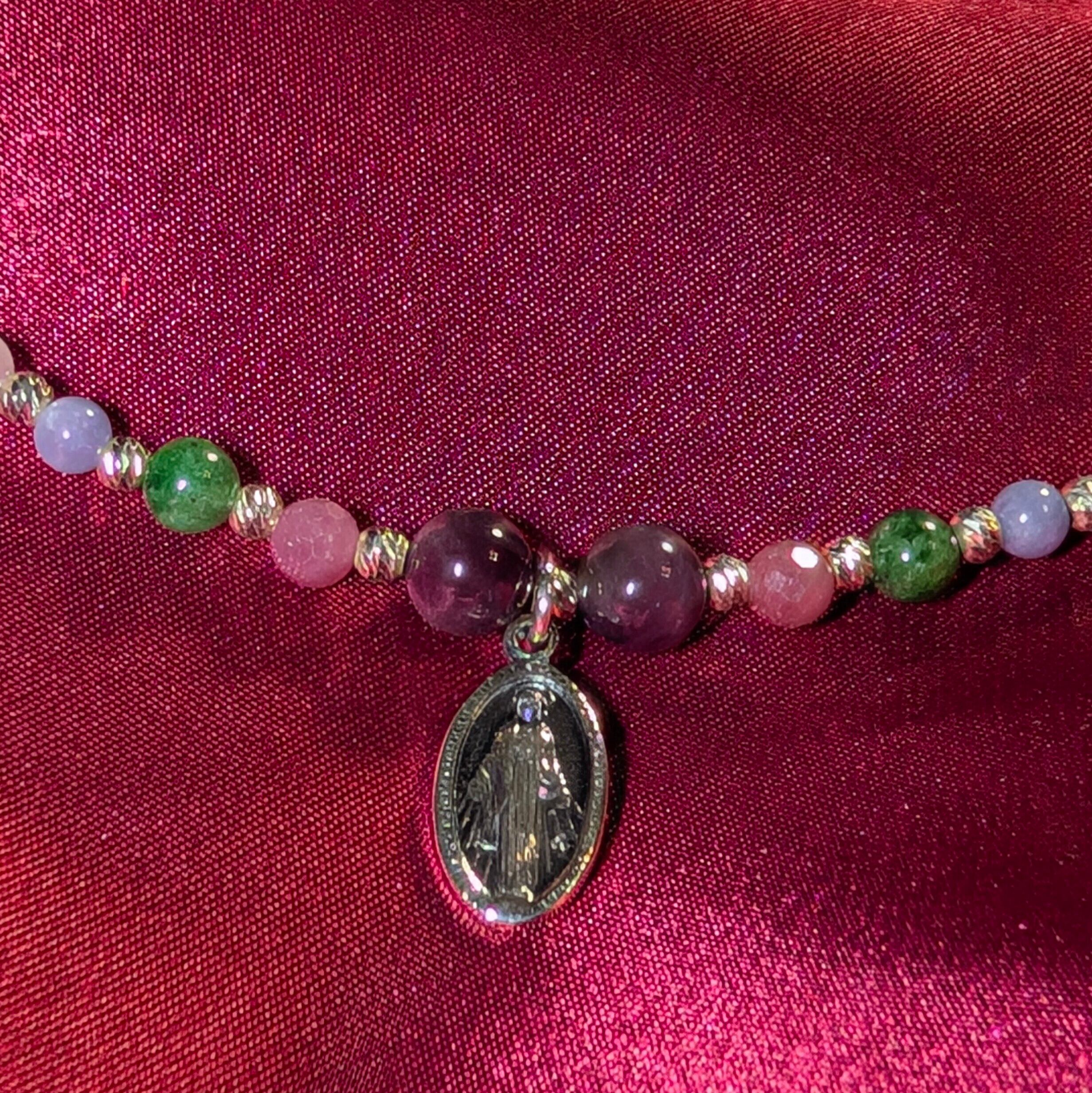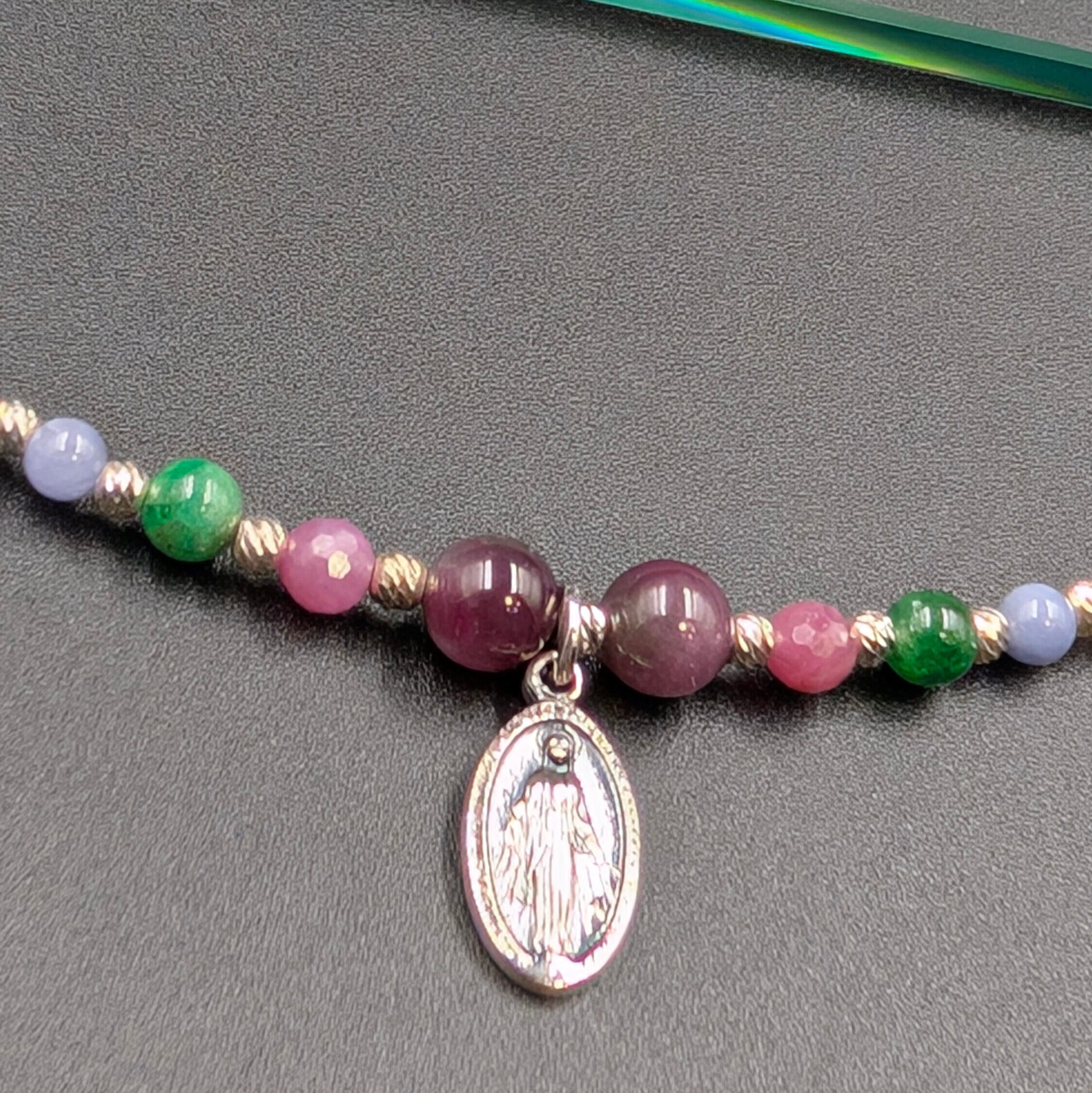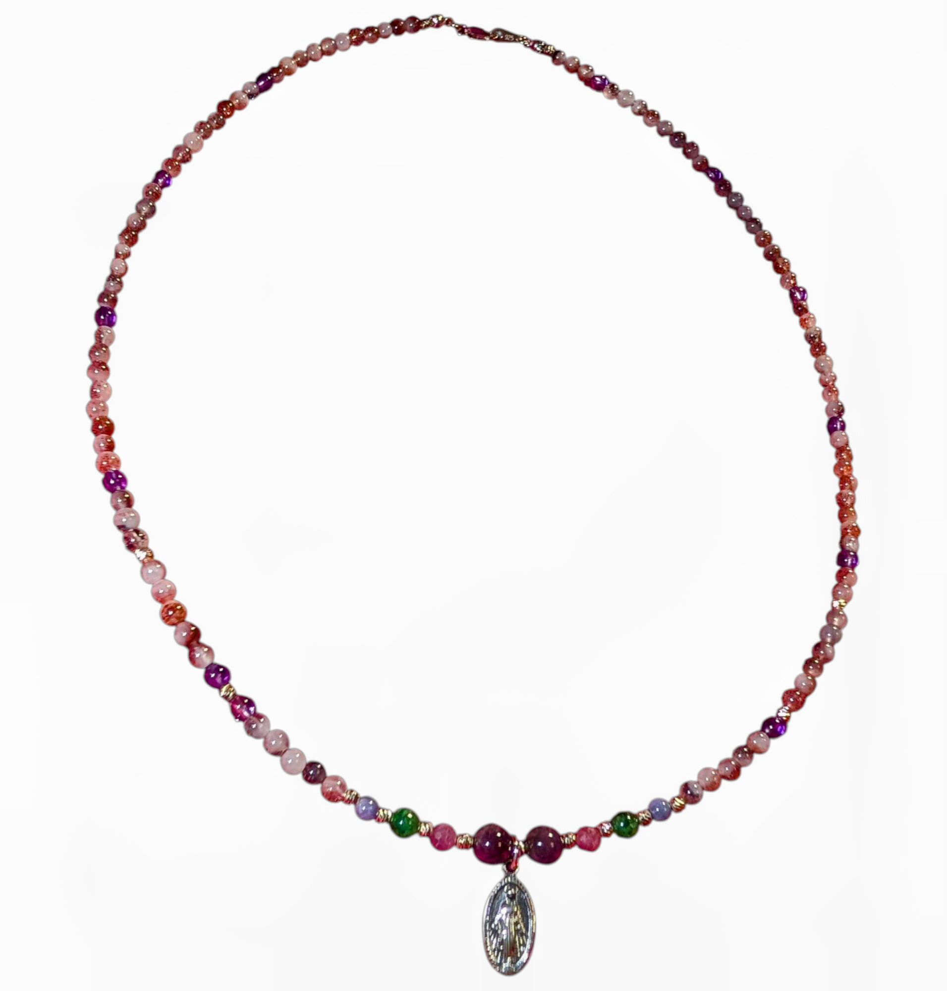 スーパーセブン、ルベライト、エメラルド、ルビー、タンザナイト、銀製の不思議のメダイを組み合わせたネックレス。それぞれの石やシンボルが持つエネルギーから多くの幸運やスピリチュアルな効果のネックレス