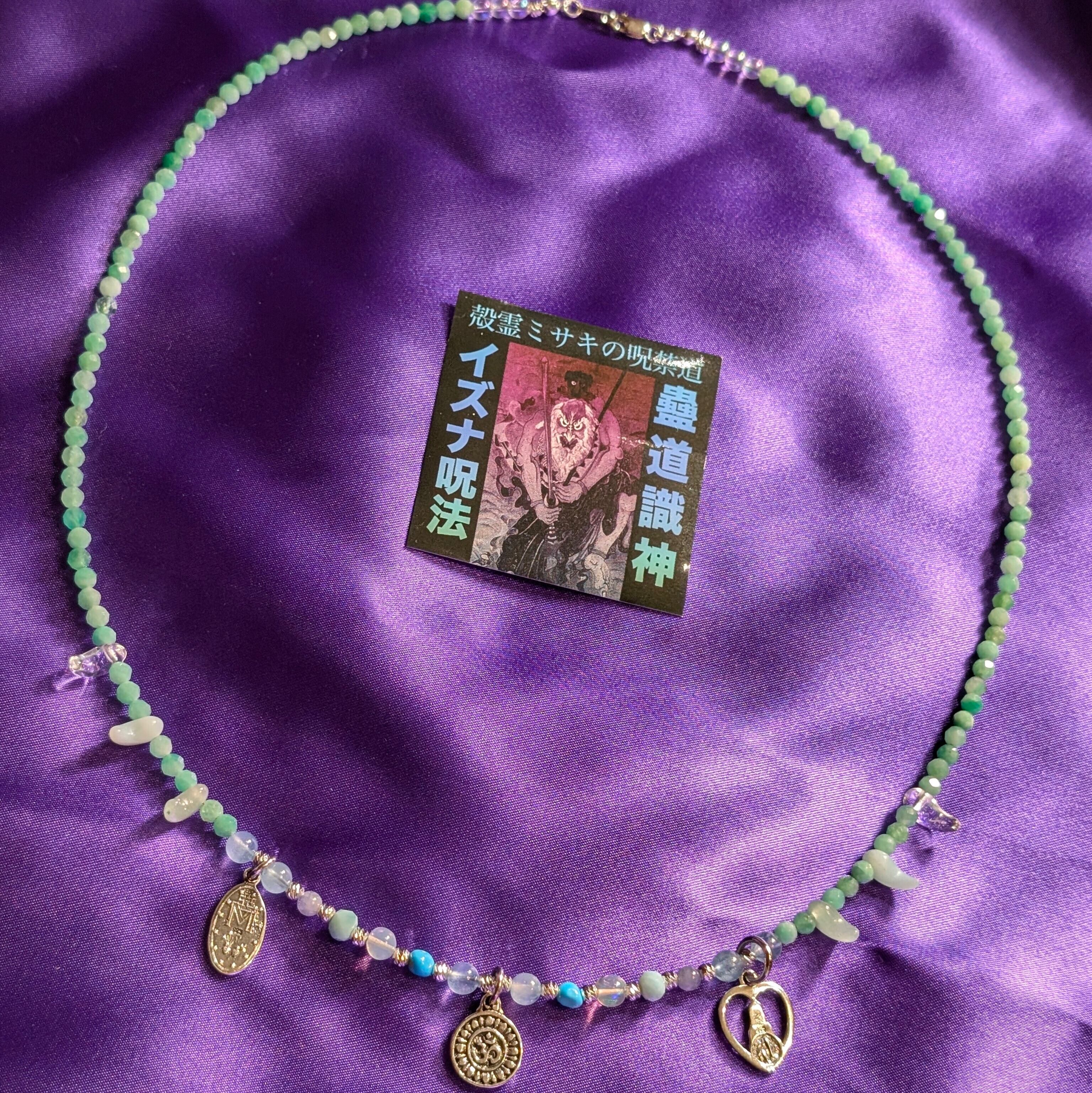 このネックレスは、**「金運」「愛」「癒し」**といった豊かさの象徴エメラルドを中心に、選び抜かれた天然石と聖なる護符を組み合わせた、まるで儀式のように意味と力を帯びたスピリチュアル・ジュエリー
