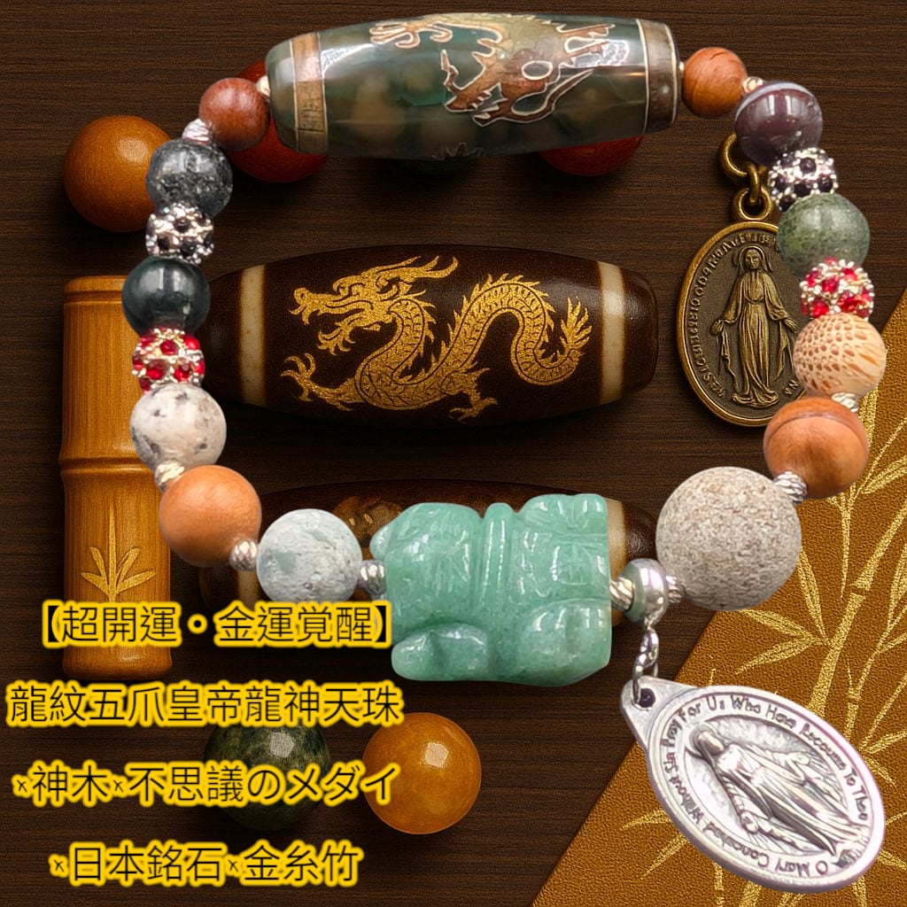 【超開運・金運覚醒】龍紋五爪皇帝龍神天珠×神木×不思議のメダイ×日本銘石×金糸竹