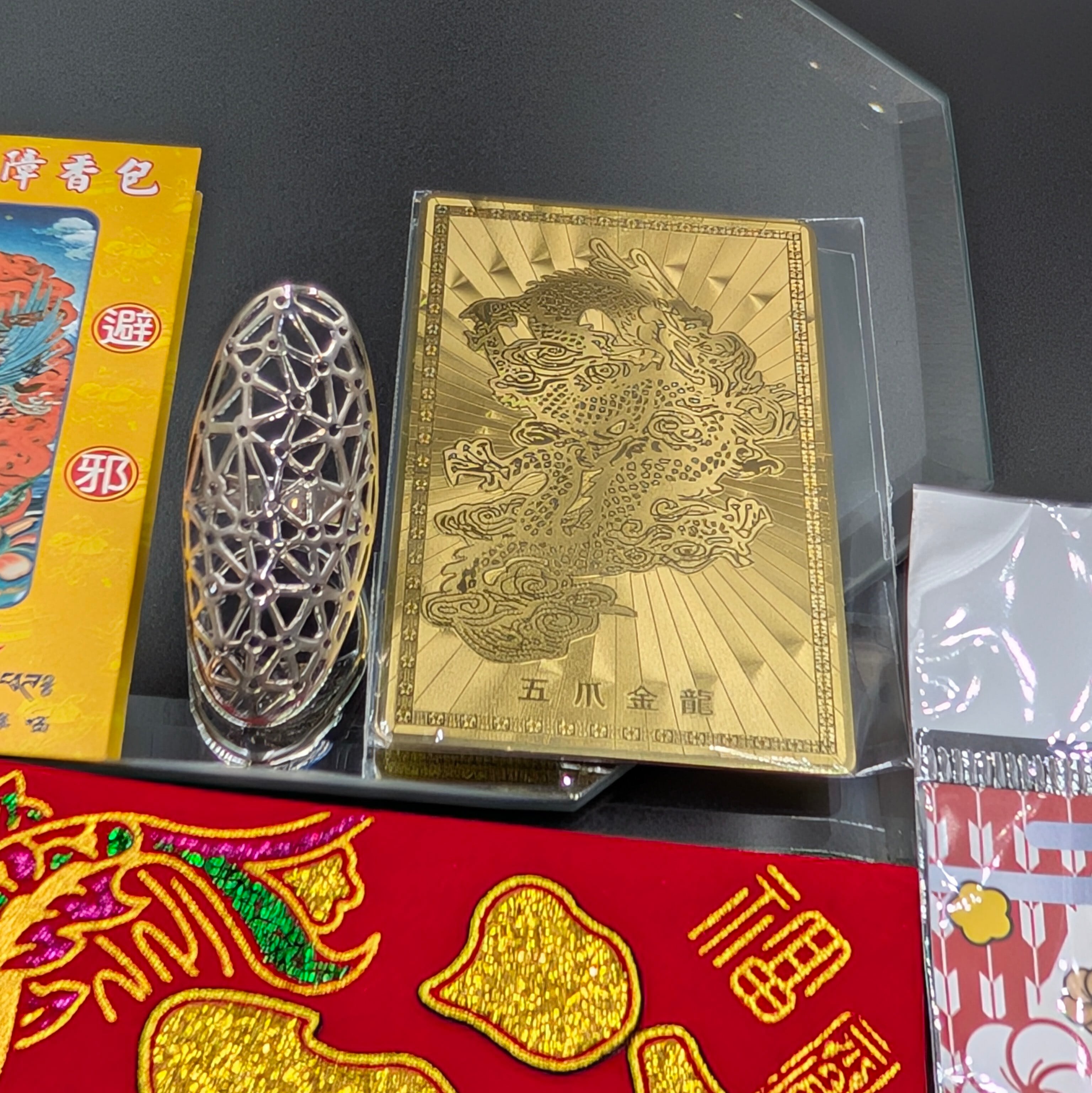 ポケットに入れて持ち歩ける「五爪龍護符」は、裏面に刻まれた大悲心陀羅尼の聖なる波動と相まって、絶対的な守護をもたらします。