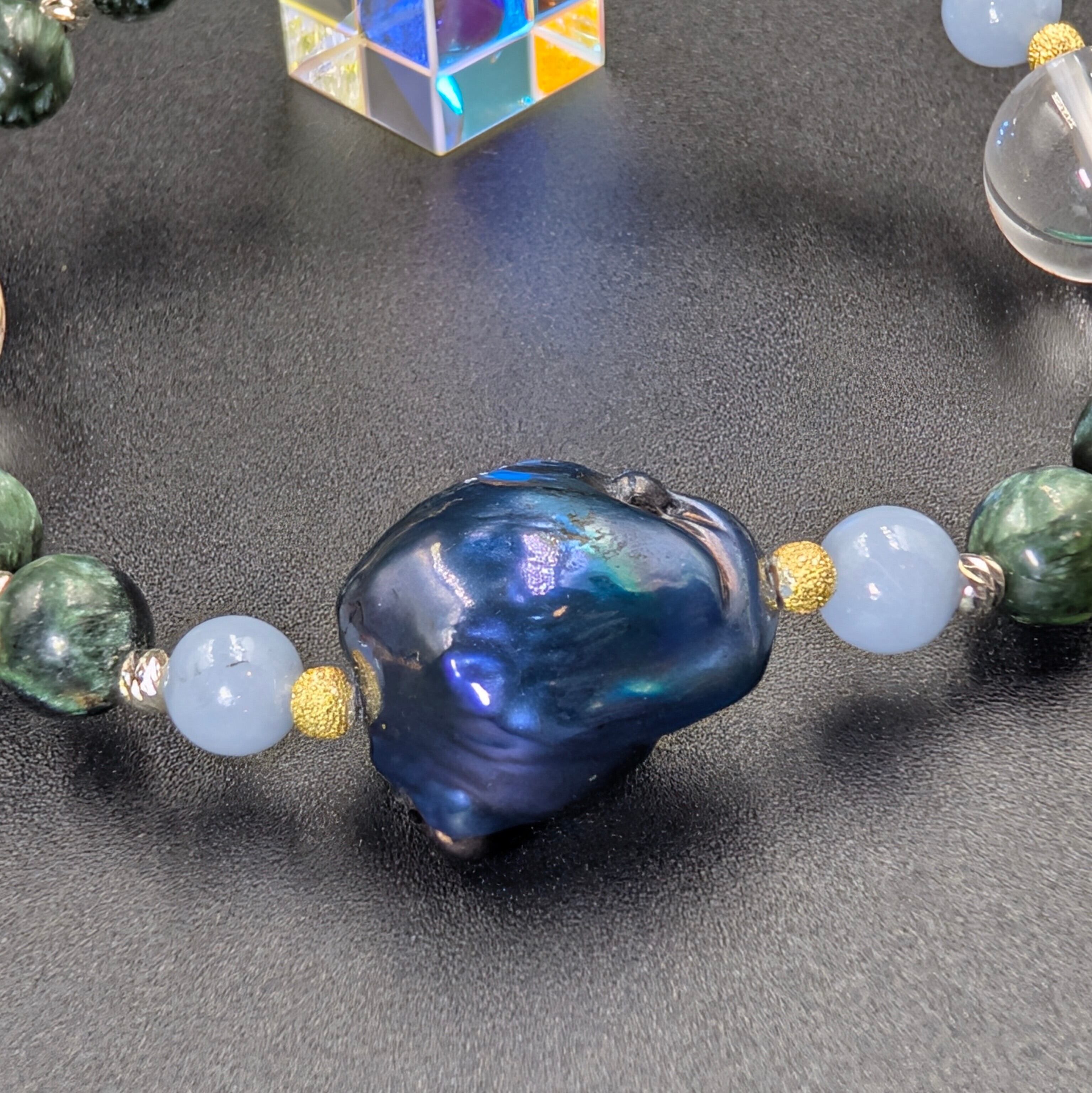 腕輪素材:セラフィナイト、エンジェライト、双天使天然水晶金彫り、セフィロト天然水晶金彫り、神聖幾何学メタトロン天然水晶金彫り、天然ケロンテス、シルバー925ロンデル。重量:約22g、内径:約17cm。