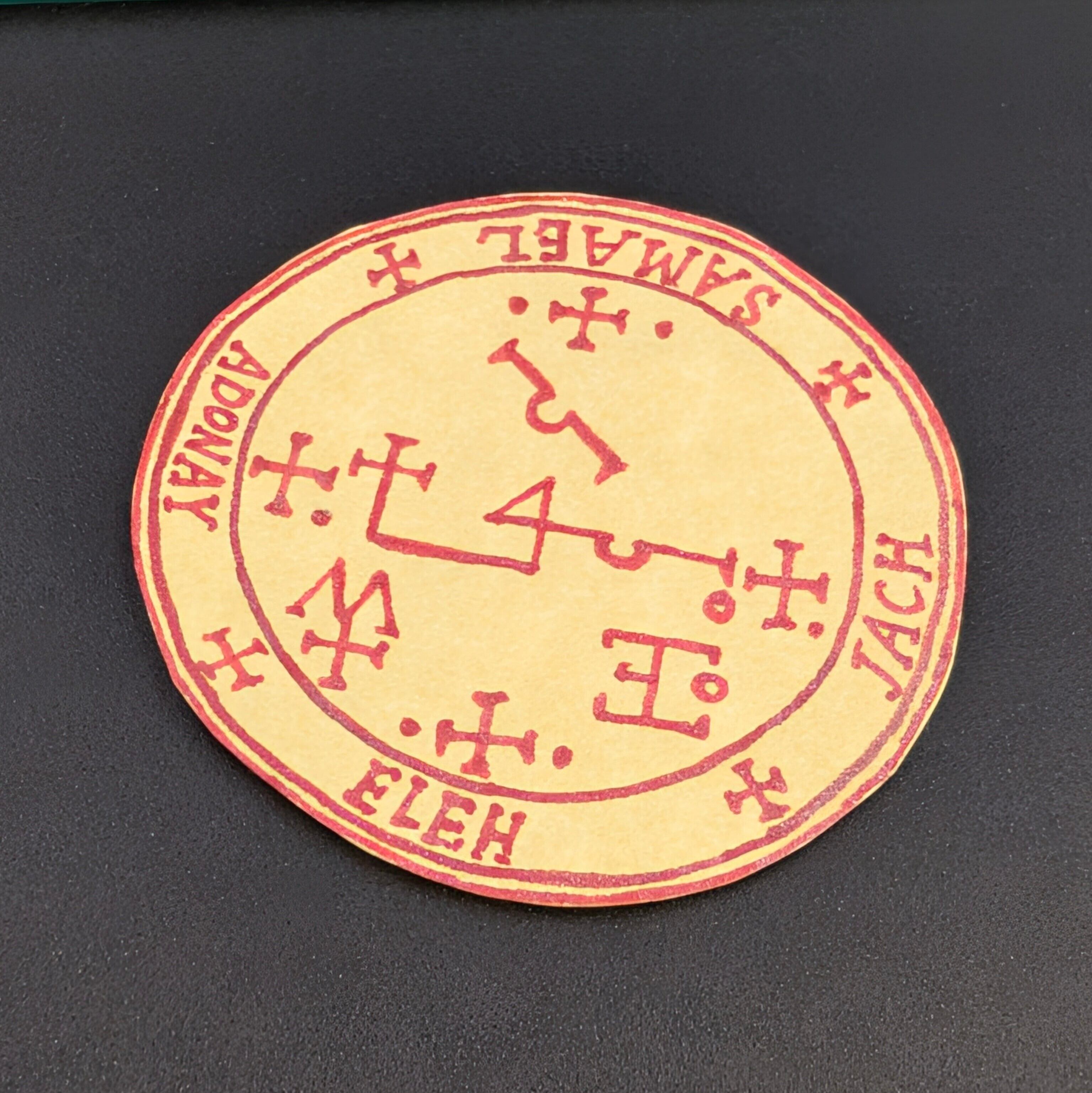 召喚儀式用ペンタクルは羊皮紙に天使カマエルの印章を描写。儀式後に折り畳み、十字架ロケット(牛革紐付)に納めて携帯。