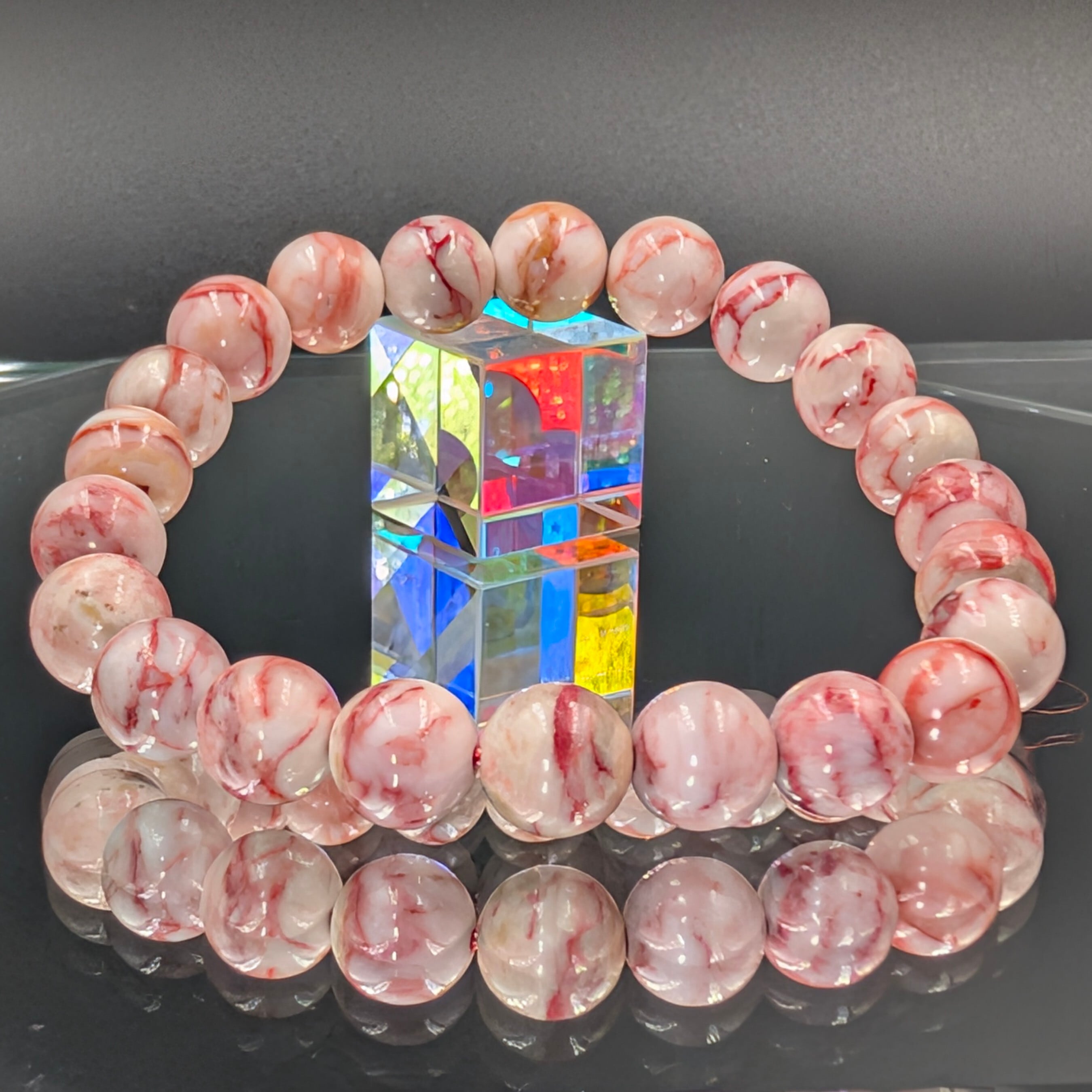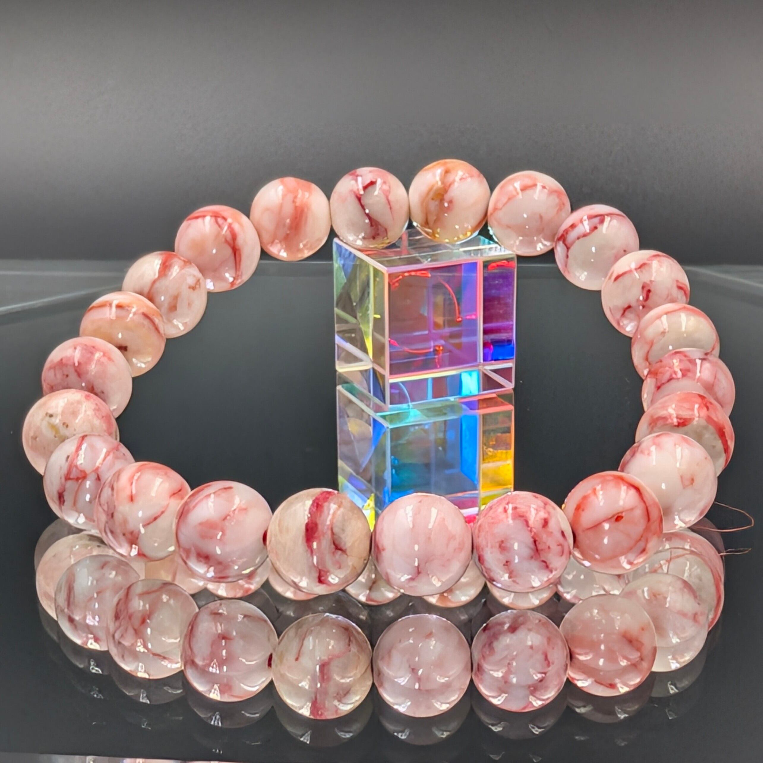 ミルキーピンクの地に赤い辰砂が流れるように刻まれ、その姿はまるで生命の炎が水晶に宿ったかのよう。