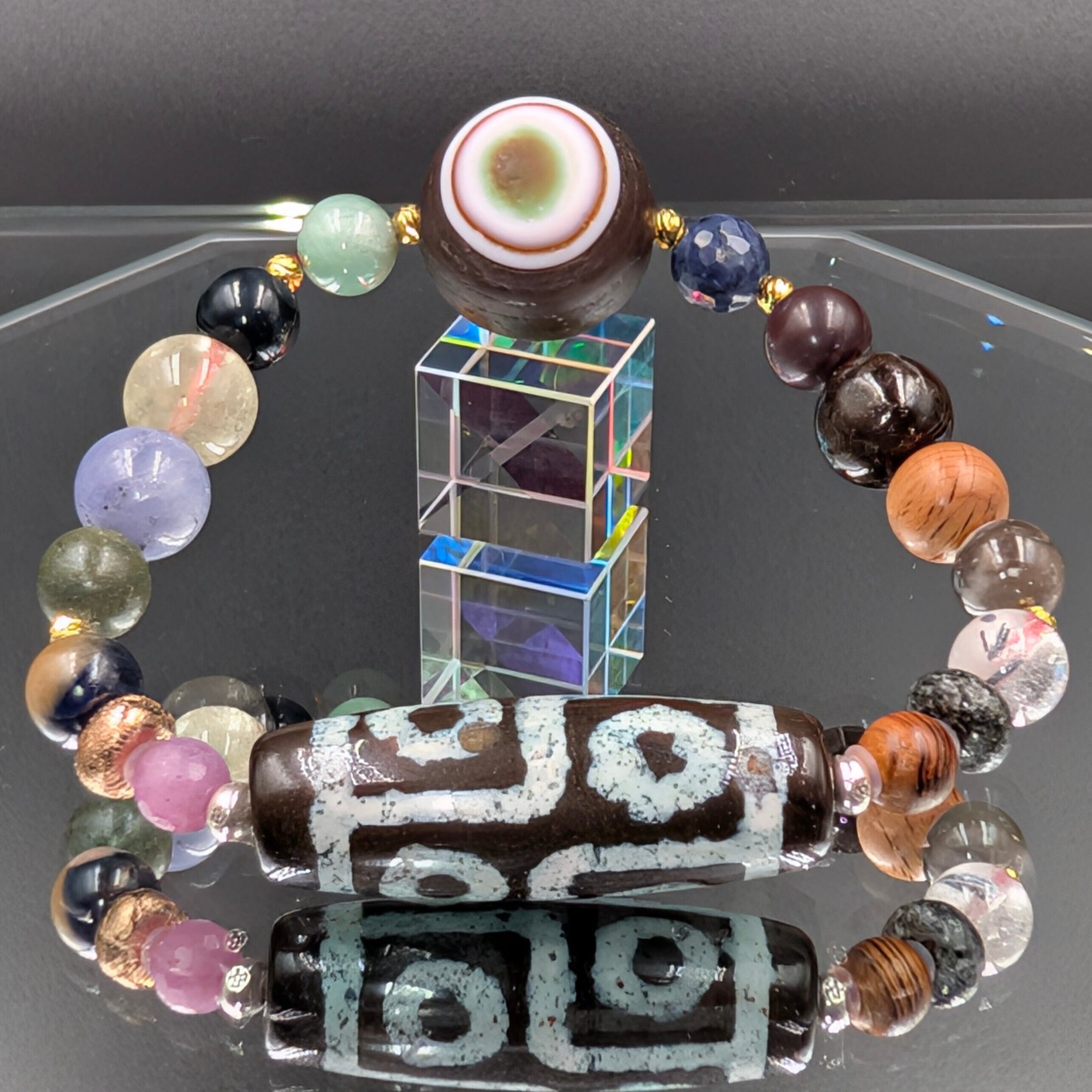 六眼黒朱砂天珠(一部水晶化)と羊眼天珠、さらに伊勢神宮御山杉・神代桜の霊木、そして世界中から集められた選りすぐりの天然石と隕石が融合した、究極の護法童子ブレスレットがここに誕生しました。