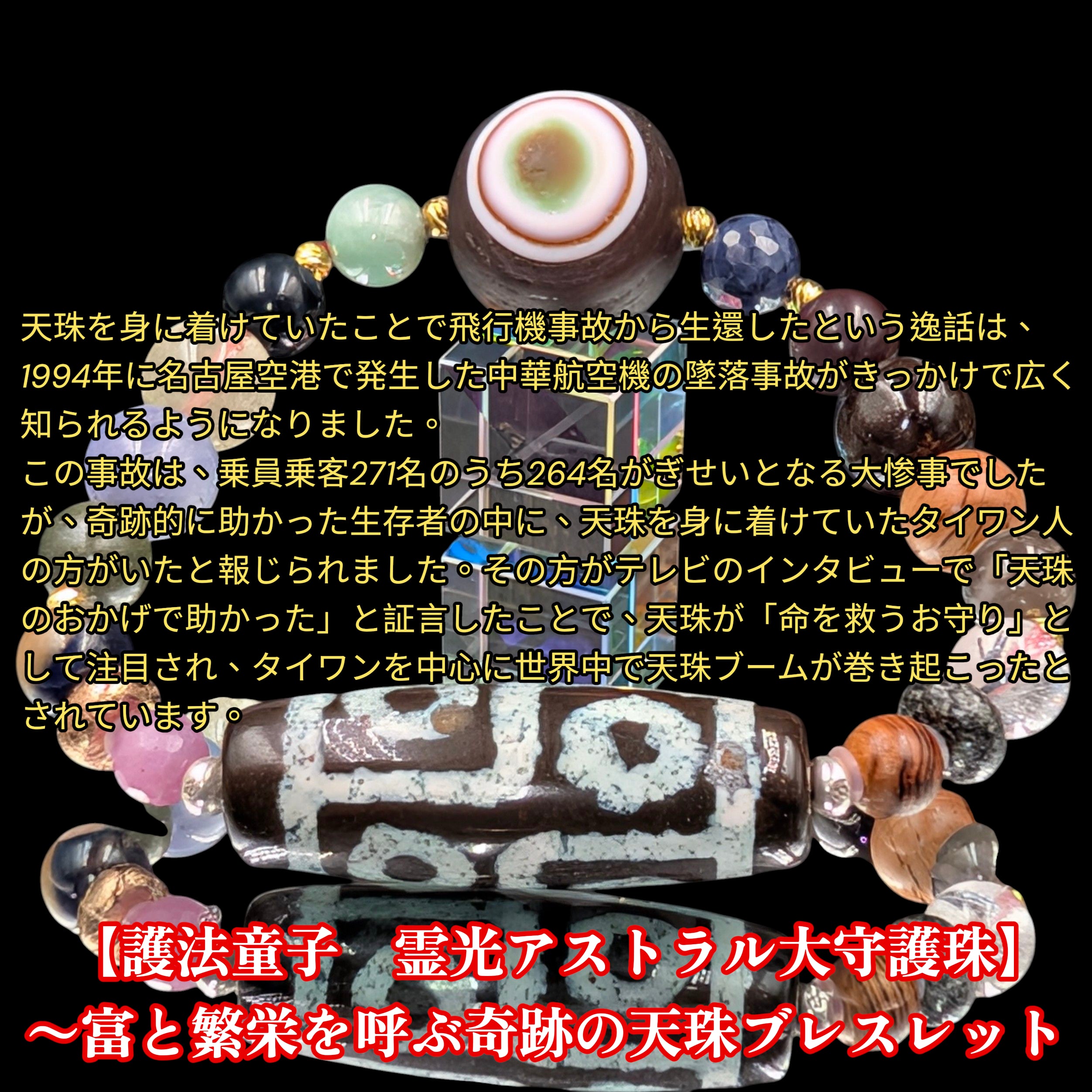 天珠には奇跡の逸話があります。1994年、中華航空機墜落事故において、天珠を身につけていた生存者が「天珠のおかげで助かった」と証言したことで、世界的に命を救う守護石としての信仰が広まりました。