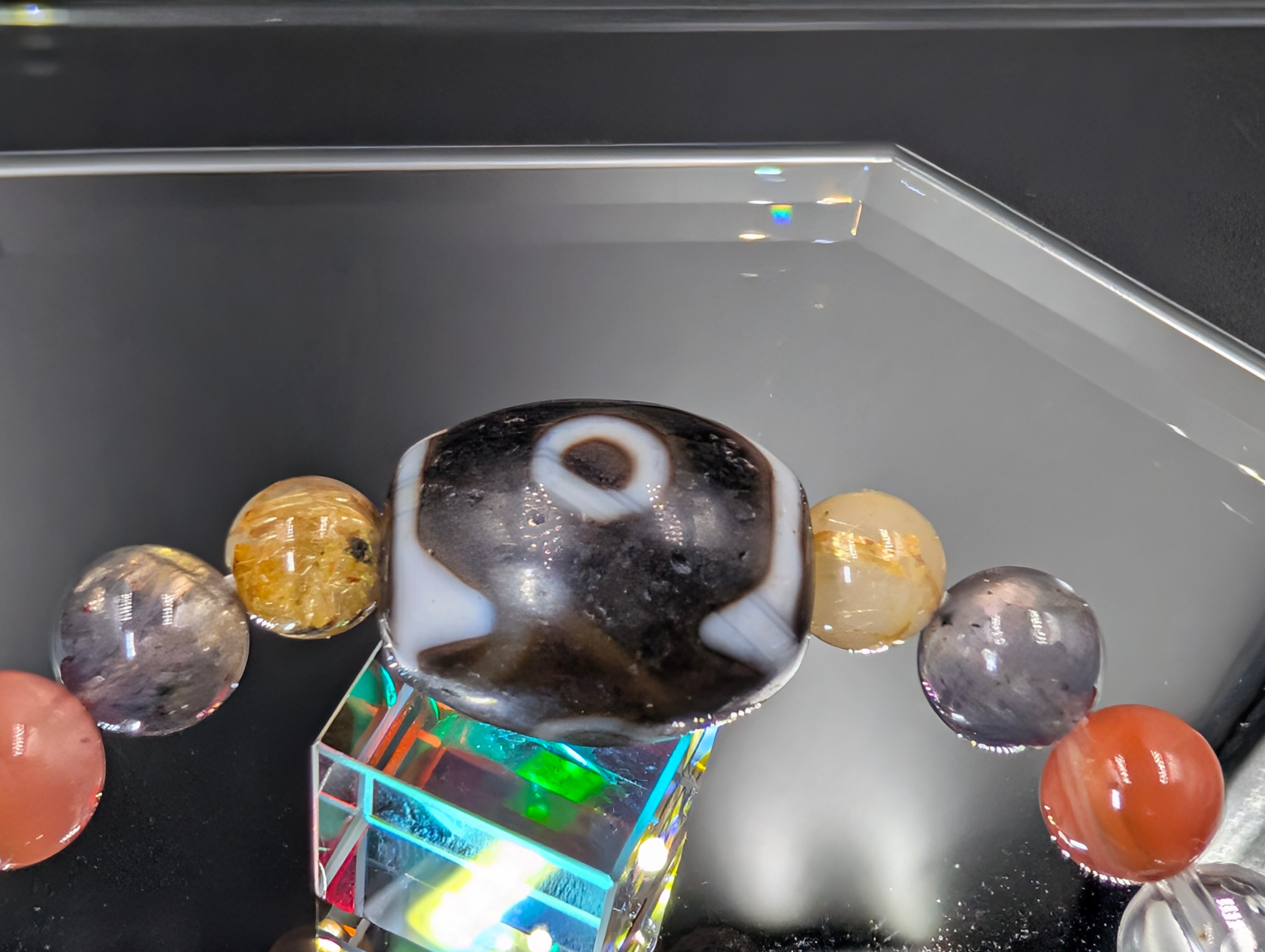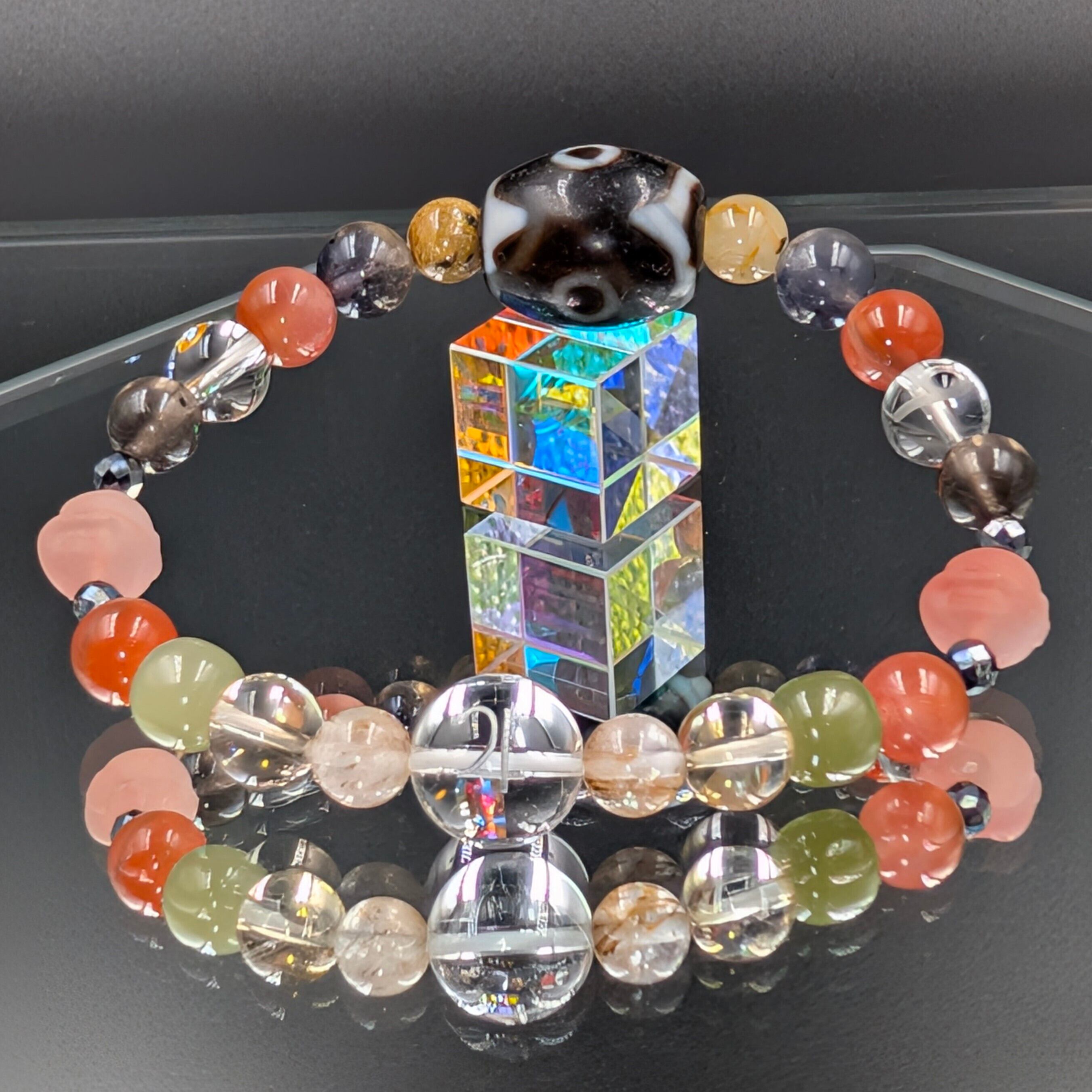 本作は古代より商売繁盛や福徳円満の象徴とされる【三眼天珠・馬蹄痕】を中核に据え、多彩な霊石を配した究極の開運呪具腕輪です