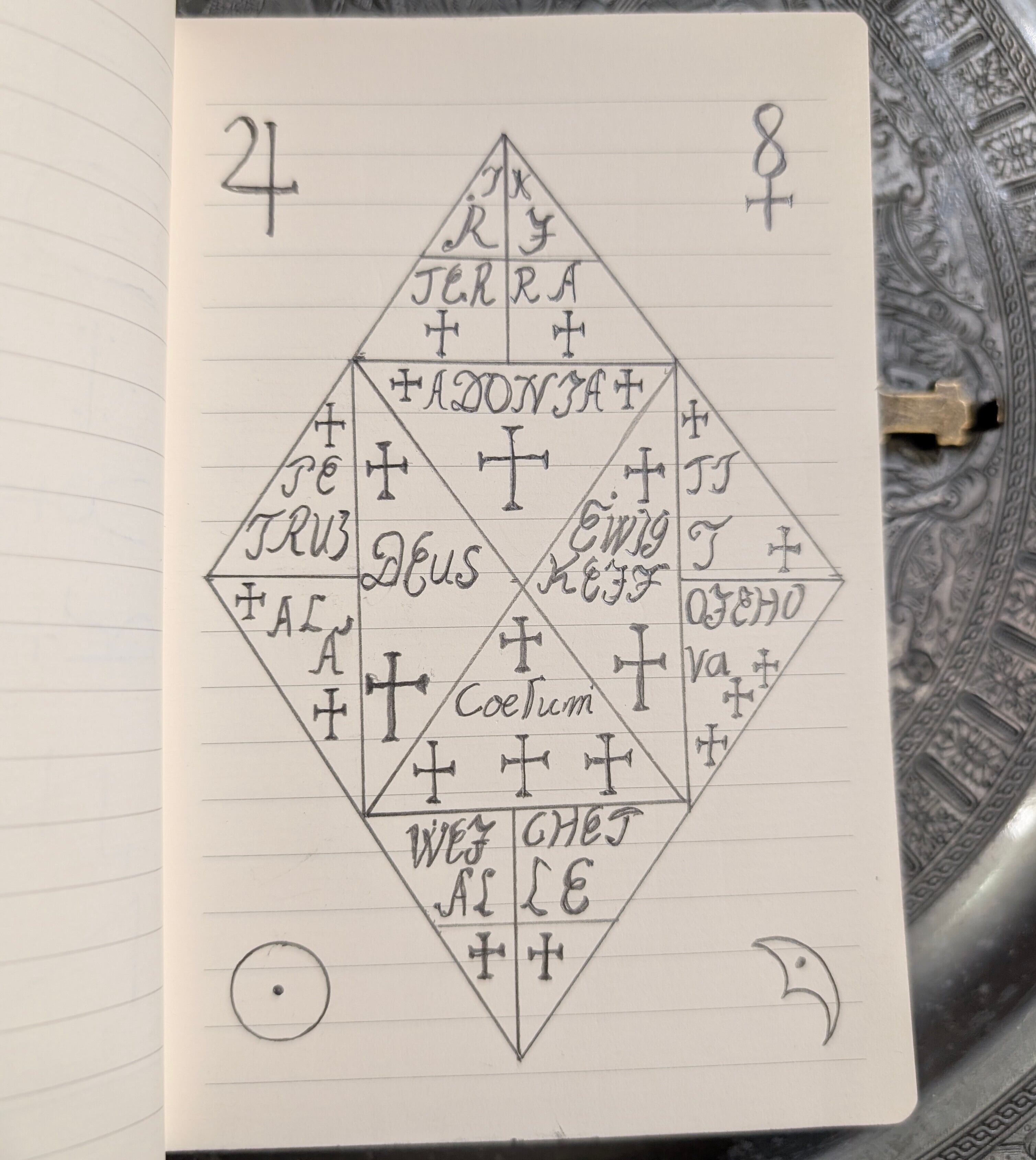 この図を真夜中に準備し、幽霊が埋葬されている場所に置くと、彼らは直ちに道を譲り、埋められた宝物を解放すると伝えられている。幽霊や精霊が眠る場所でこの図を用いることで、隠された財宝を発見できるという民間伝承が残っており、古くから魔術儀式に取り入れられてきた。描かれた魔法陣は極めて複雑であり、その中心にはラテン語で、これは大地と天、すなわち宇宙全体を象徴すると考えられる。