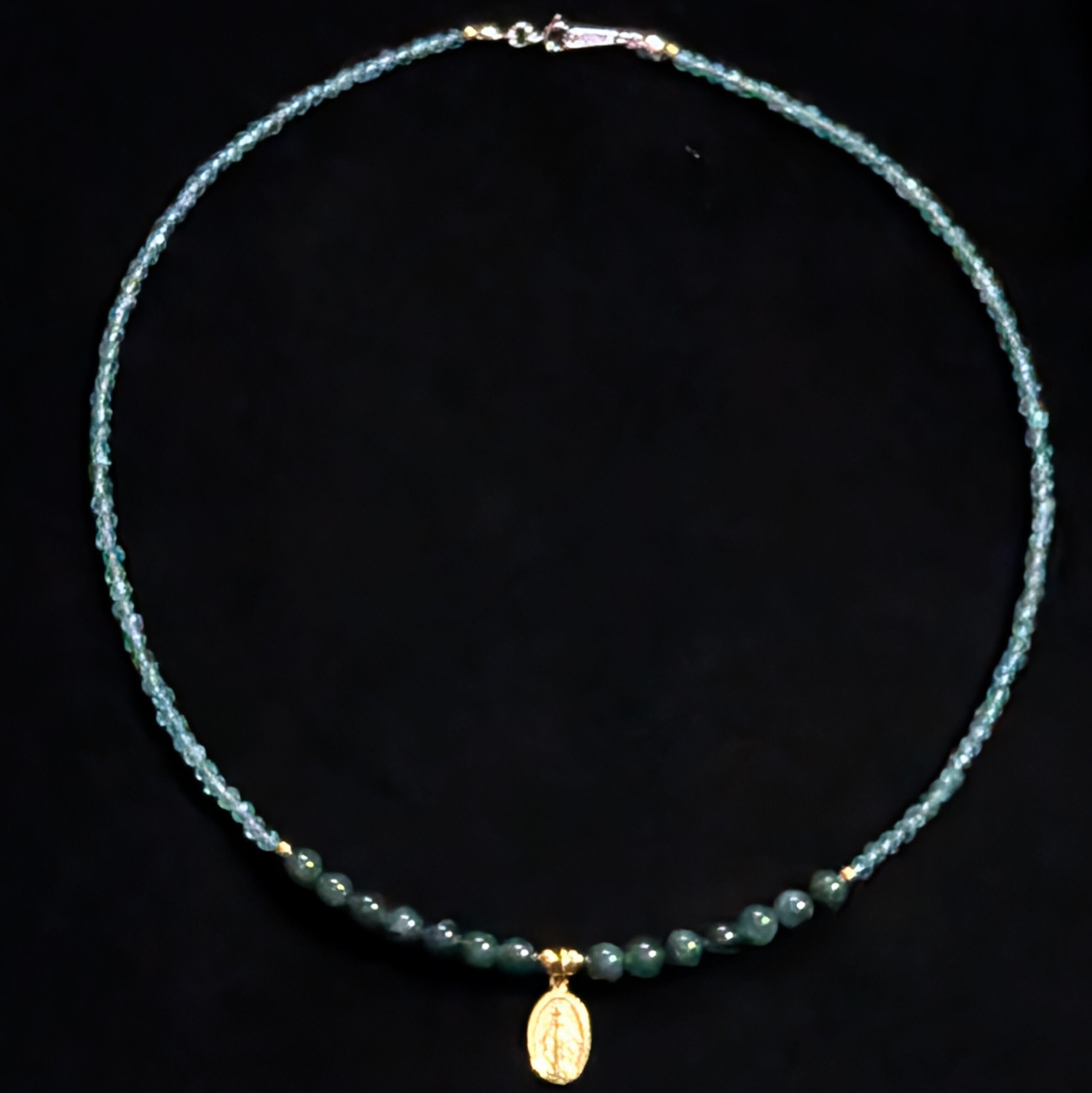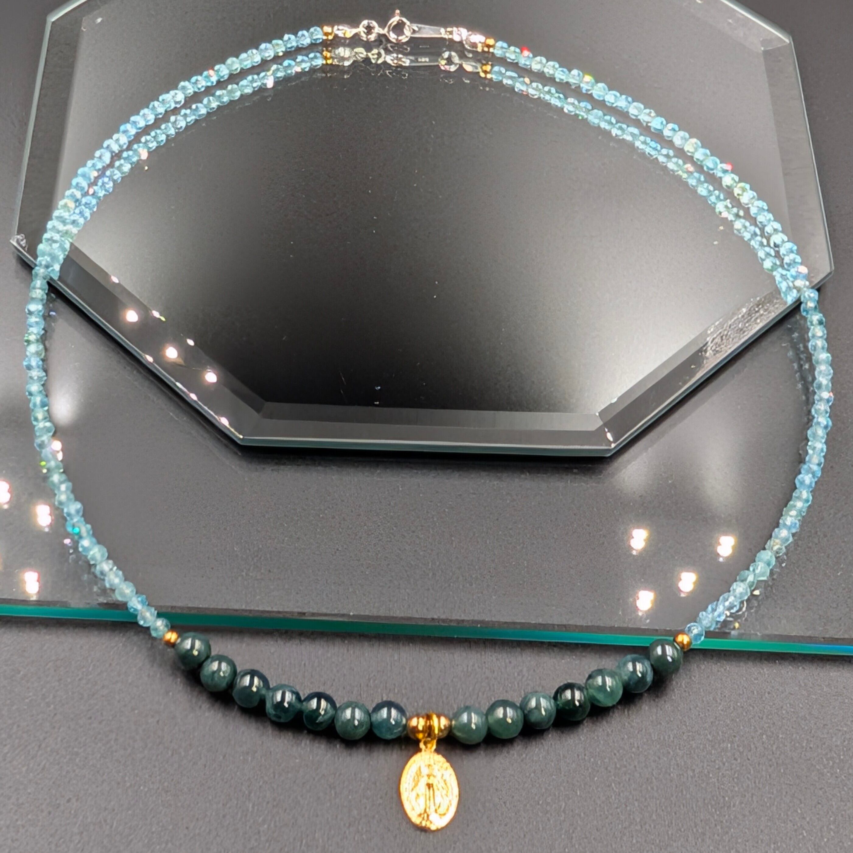 このネックレスは、希少なマンサーノ翡翠と霊的覚醒のブルーアパタイト、不思議のメダイの神秘が一体となり、身につける者に聖なる守護と奇跡を授けます。
