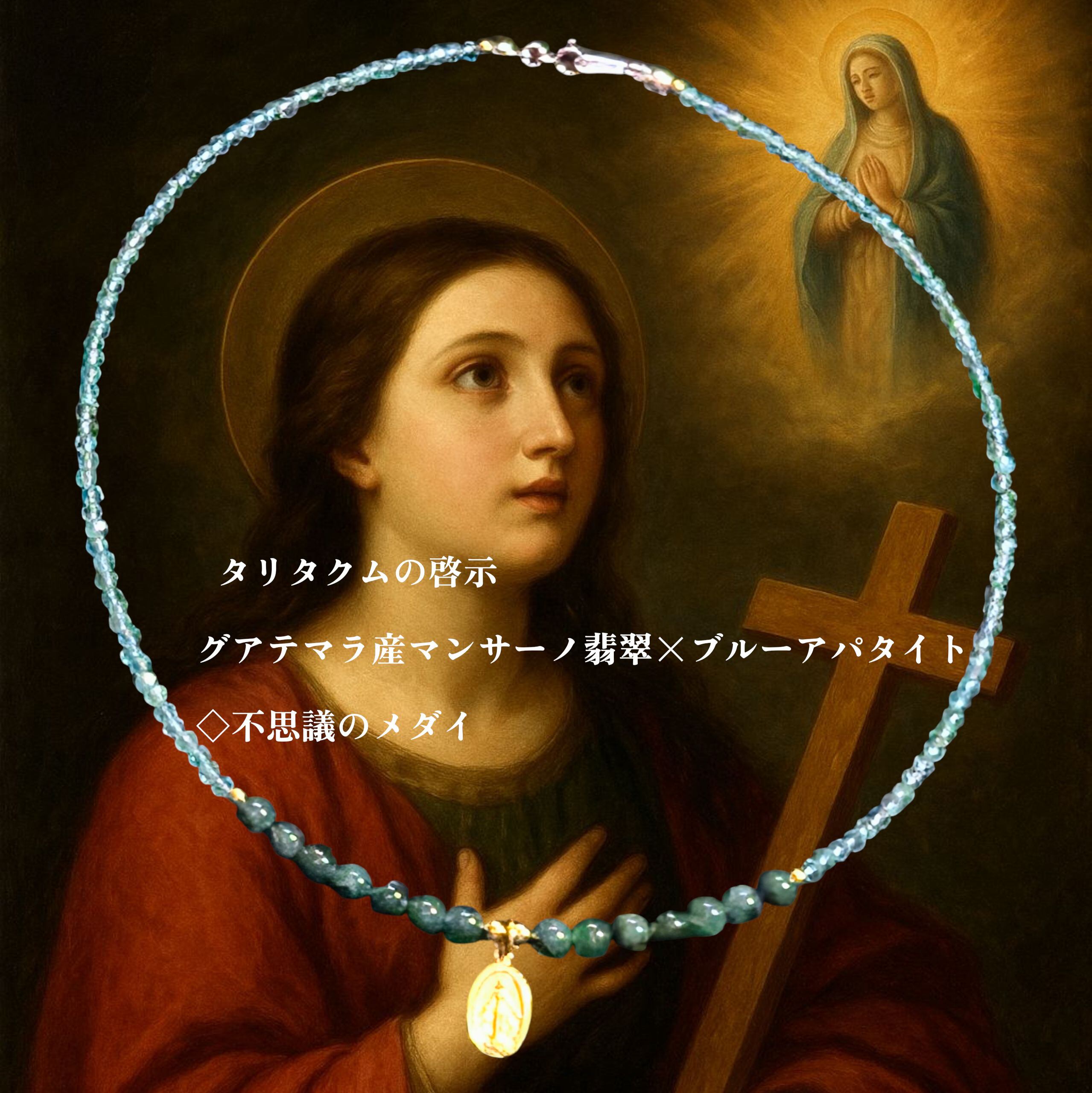 その名を冠した本作は、聖母マリアの加護を宿す「不思議のメダイ」と、希少価値の極めて高いグアテマラ産マンサーノ翡翠、さらに霊性を活性化させるブルーアパタイトを結び合わせた、魂の再生を象徴する究極の聖なる護符ネックレスです。
