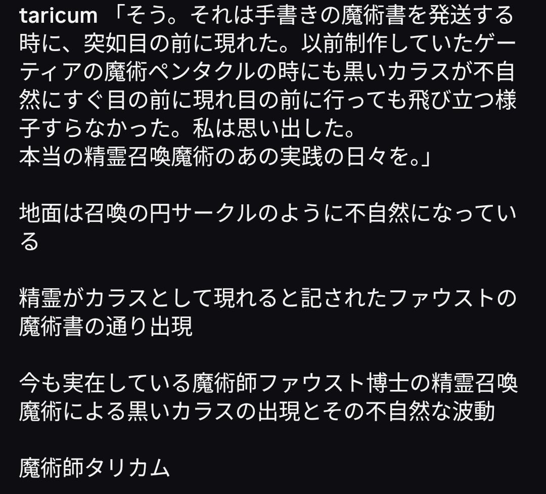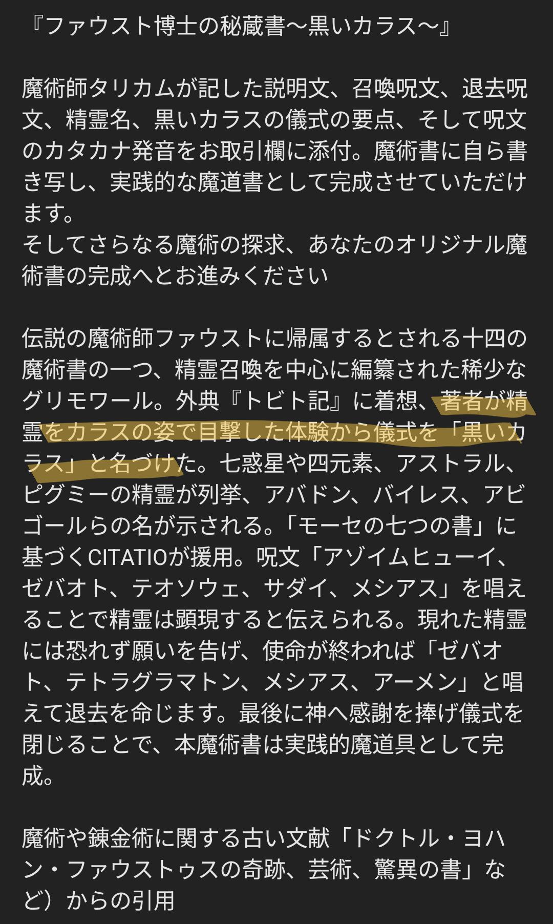 魔術師タリカムが記した説明文、召喚呪文、退去呪文、精霊名、黒いカラスの儀式の要点、そして呪文のカタカナ発音をお取引欄に添付。魔術書に自ら書き写し、実践的な魔道書として完成させていただけます。