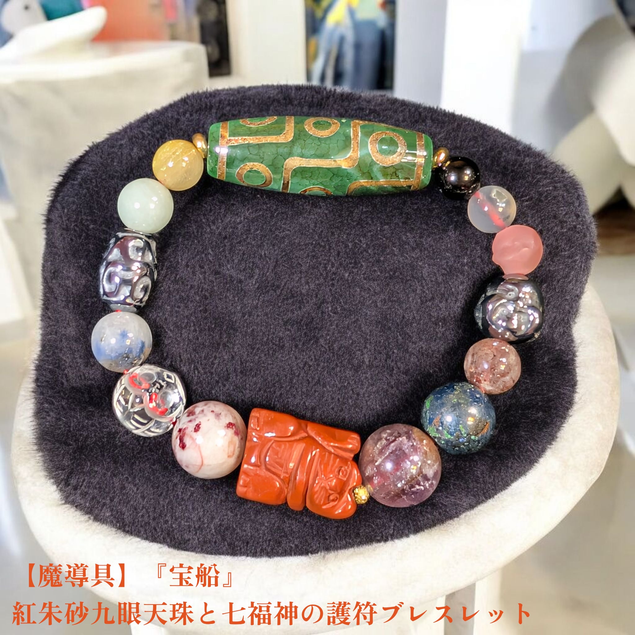 ⑦※一点物【魔導具】『宝船』紅朱砂九眼天珠と七福神の護符ブレスレット