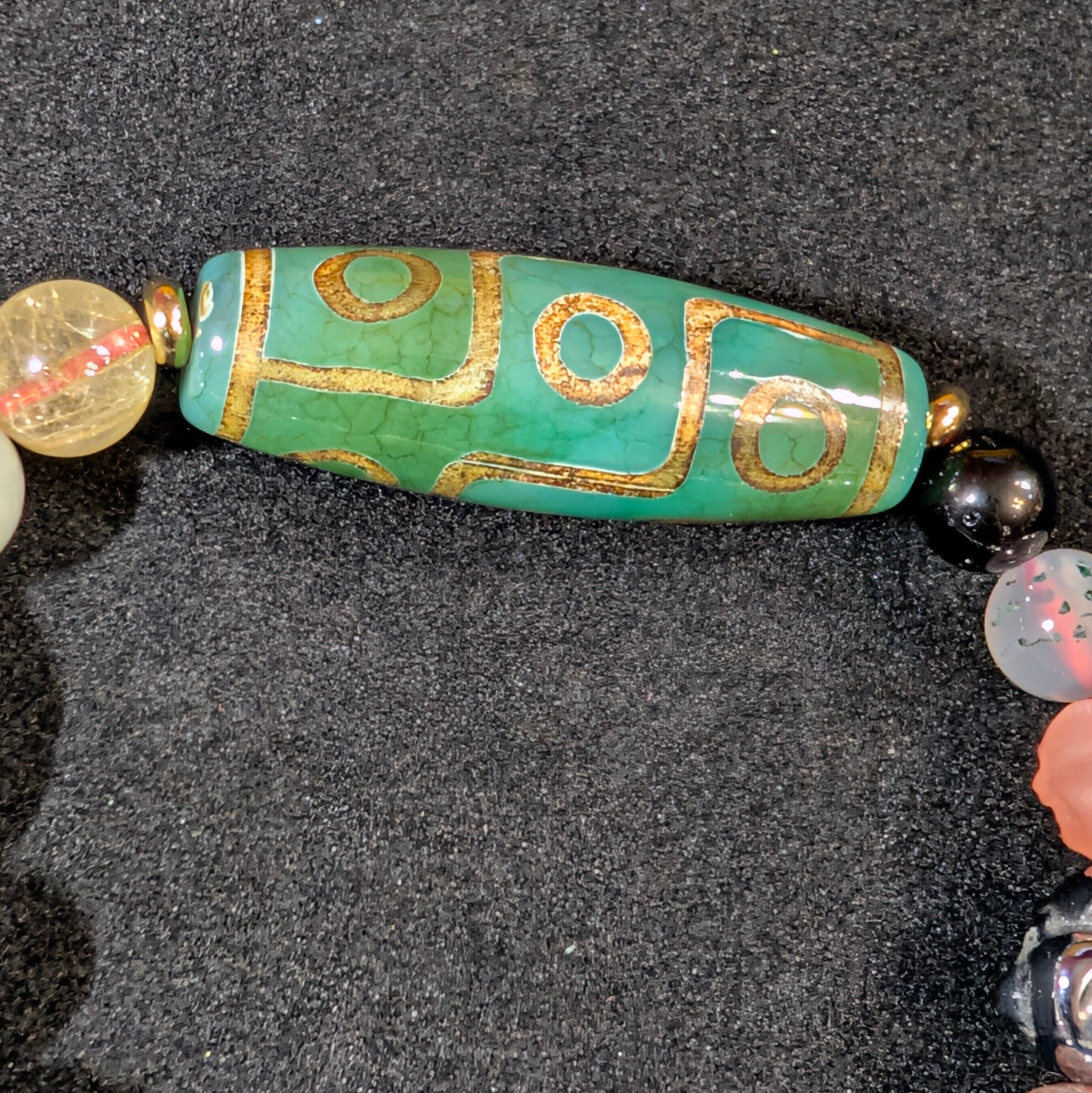 本作は、紅朱砂天珠を中心に、七福神の加護石を巡らせた特別な護符ブレスレット