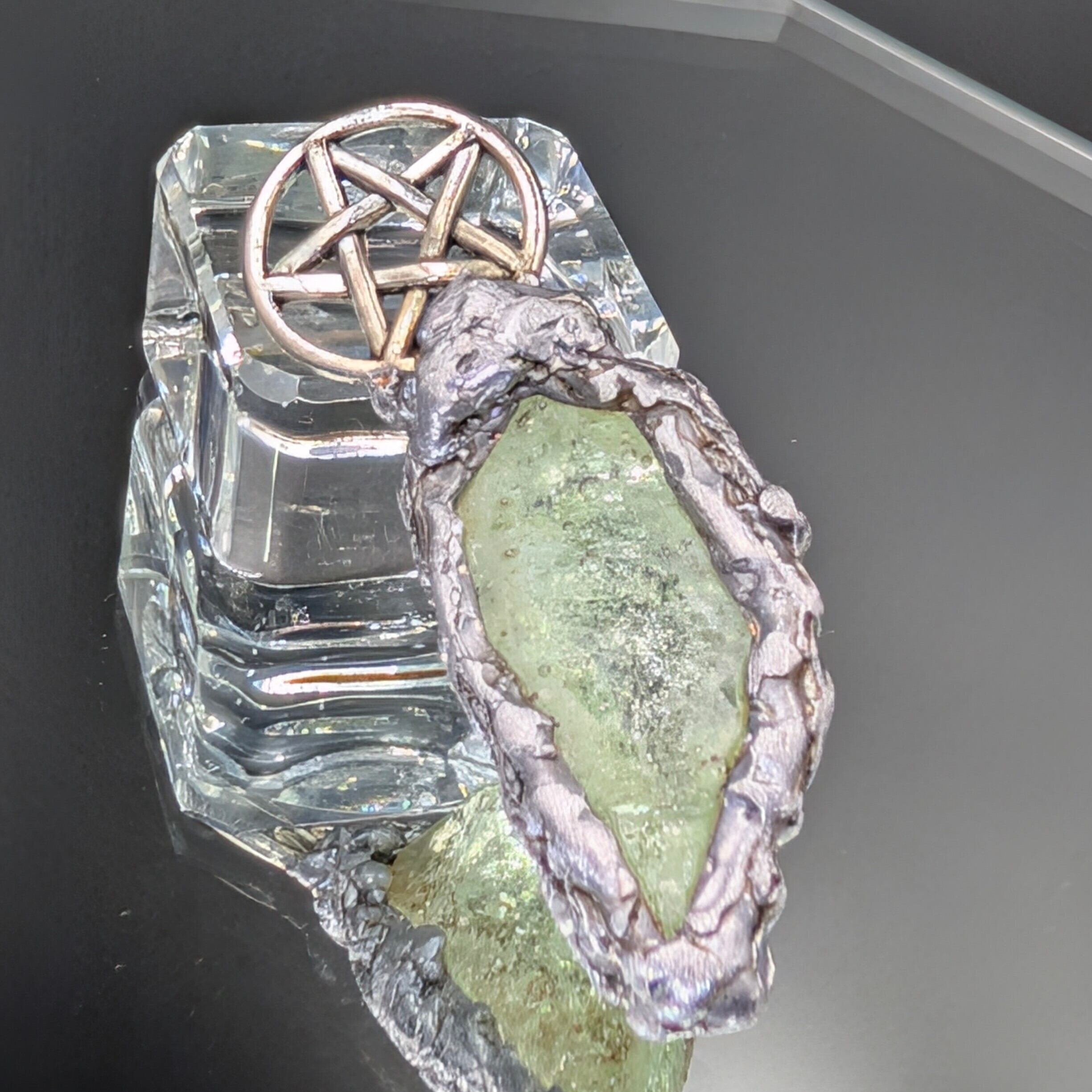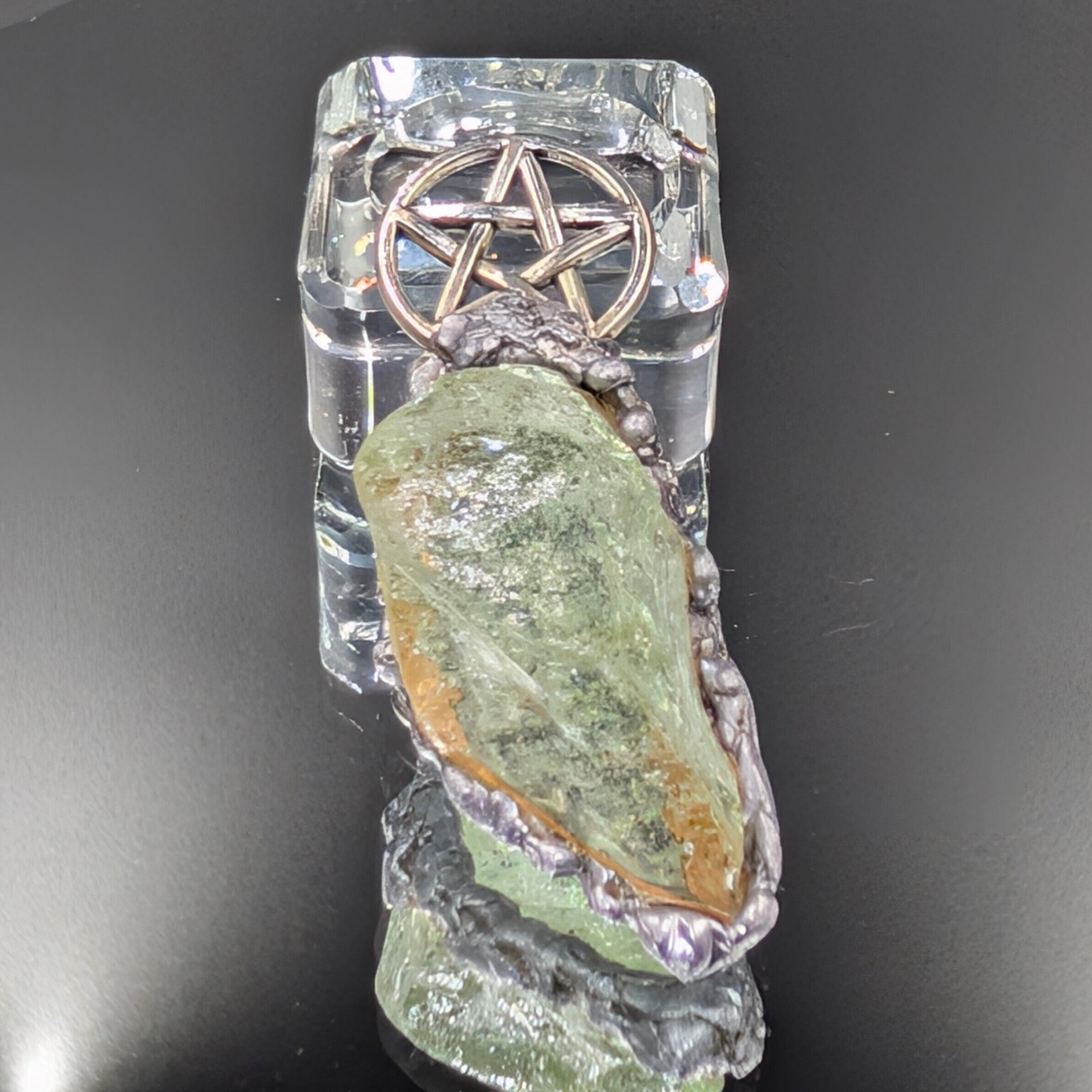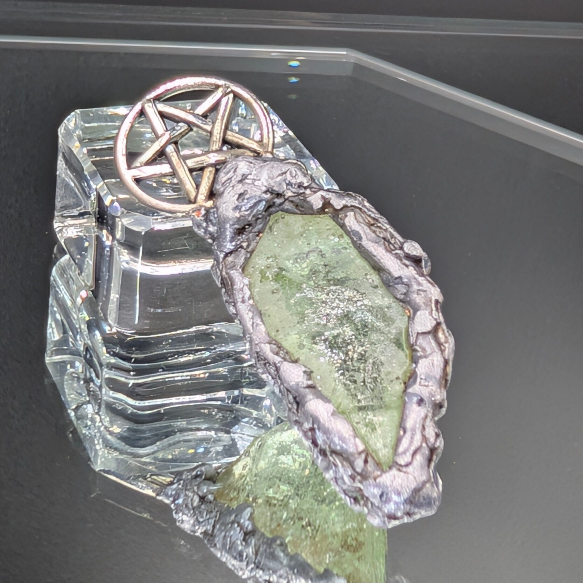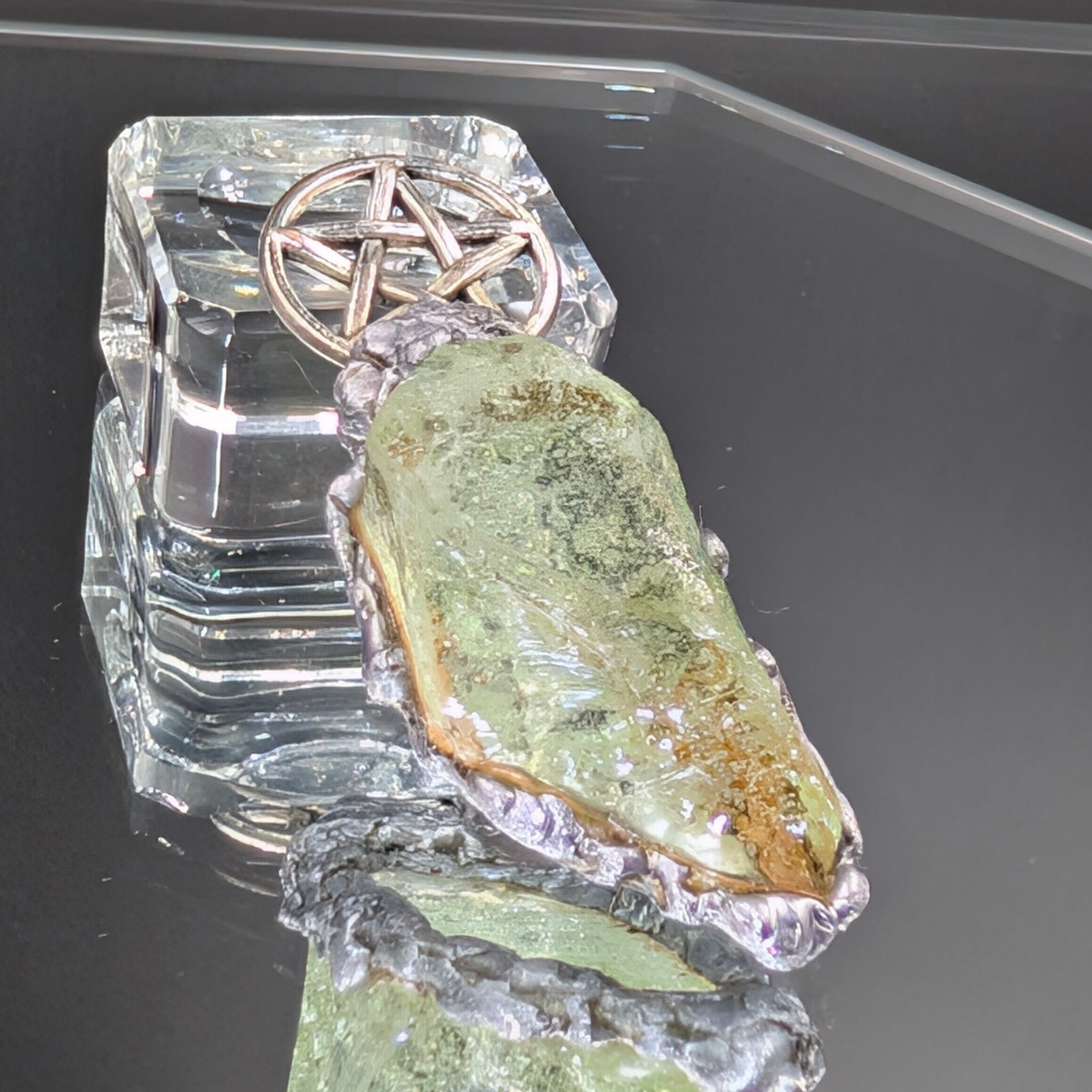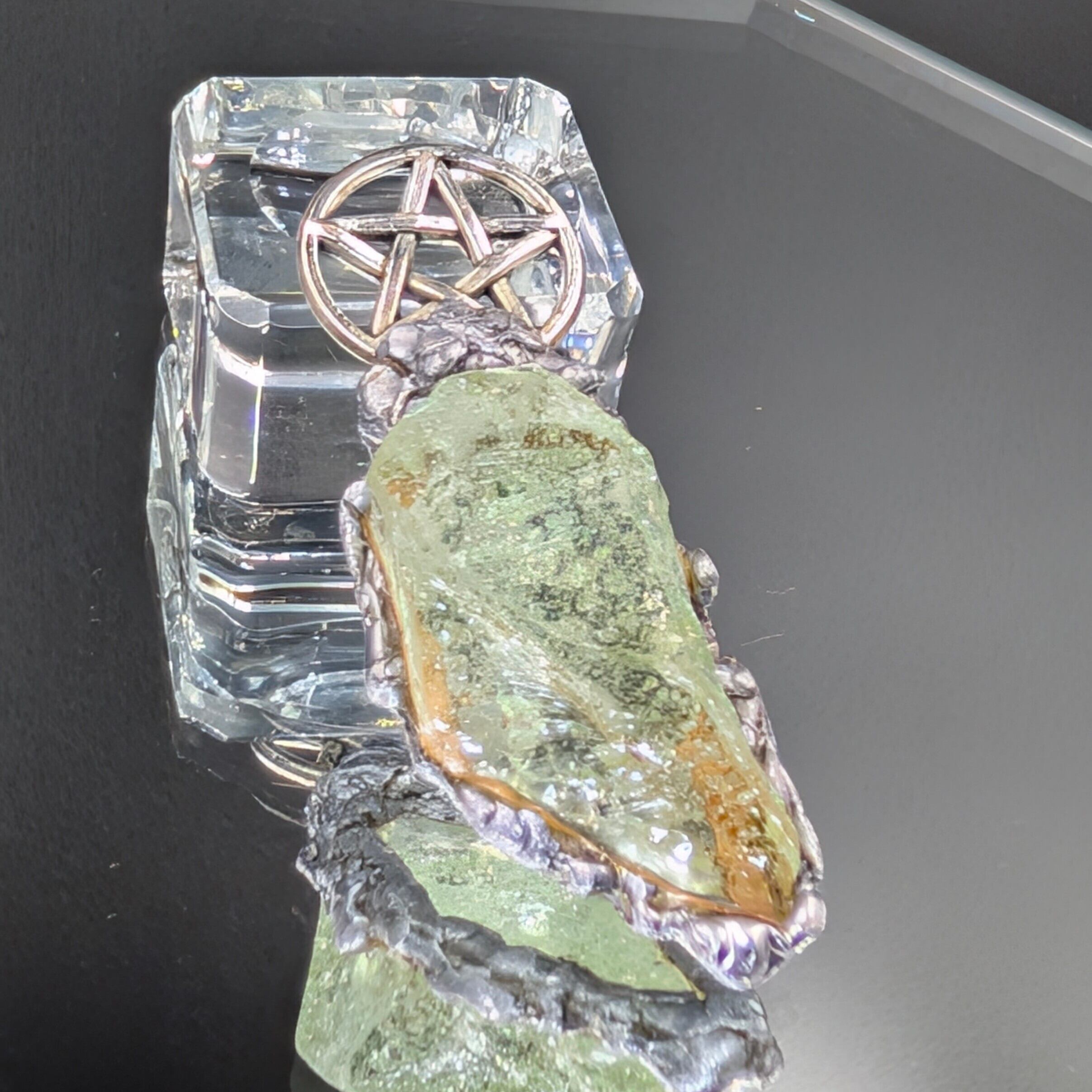 金具には銅・錫・アルミニウムを組み合わせ、アンダラクリスタルを古代錬金術における**形態形成場の導電性「金属の魔力循環」**で包みます。