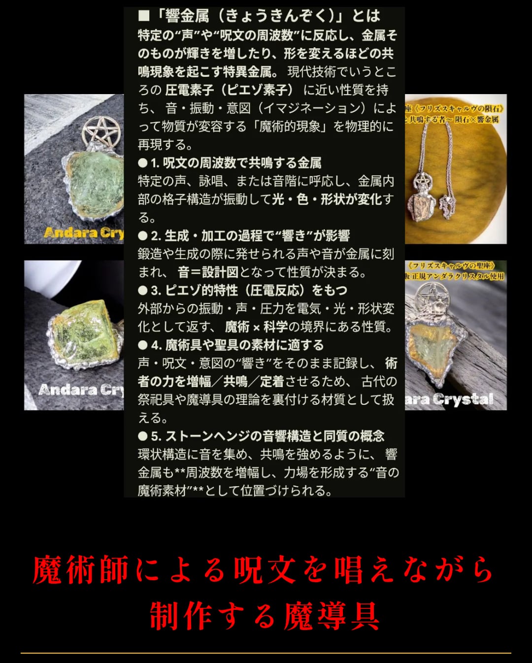 これは特定の周波数、すなわち“呪文の声”に共鳴し、生成時に輝きを増したり形状を変えたりする神秘の金属で、圧電素子(ピエゾ素子)の性質を持つ
