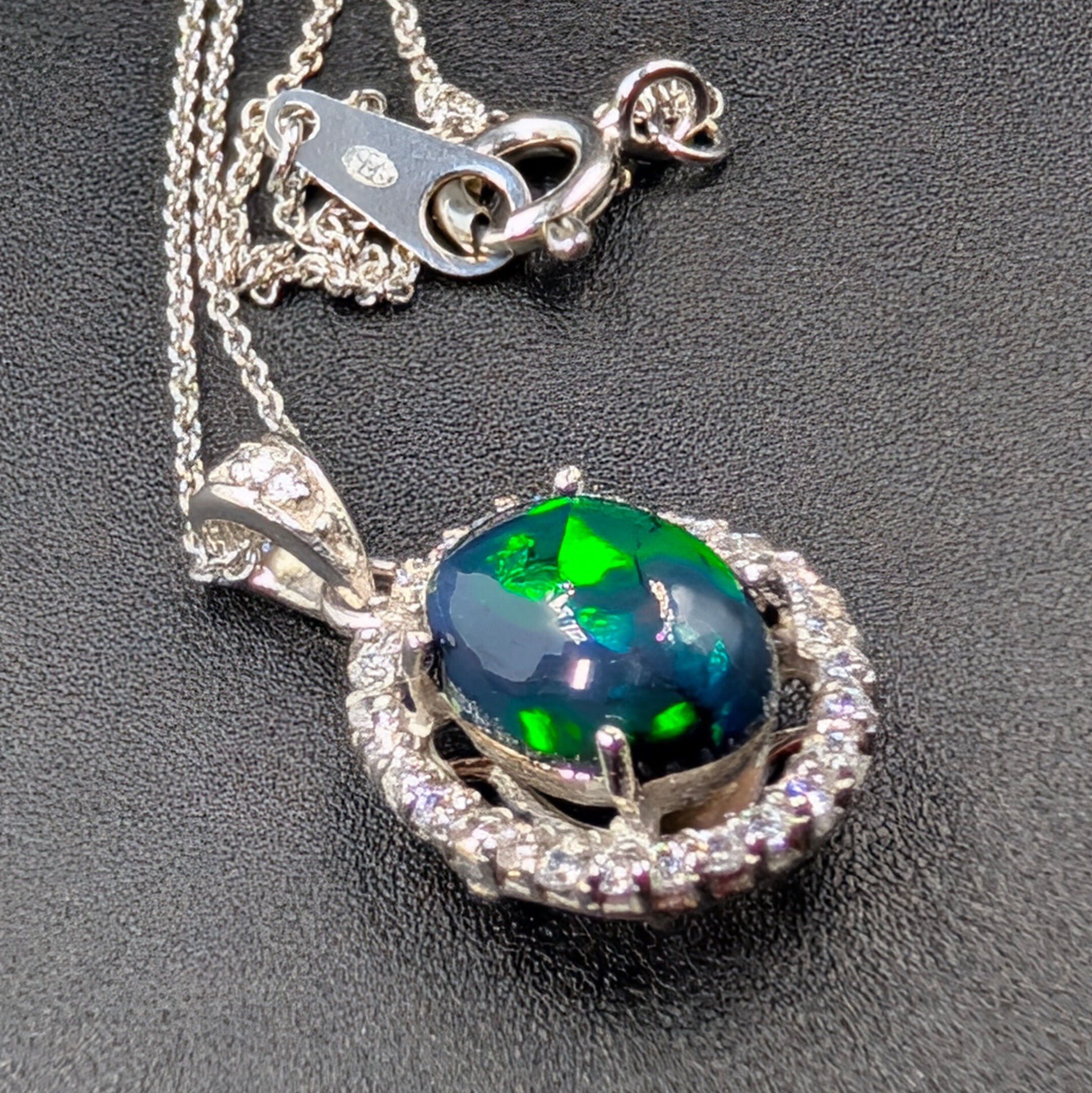 宝石の王とも称されるオーストラリア・ライトニングリッジ産の「ブラックプレシャスオパール」を主役にした、最高級のペンダントネックレスです。