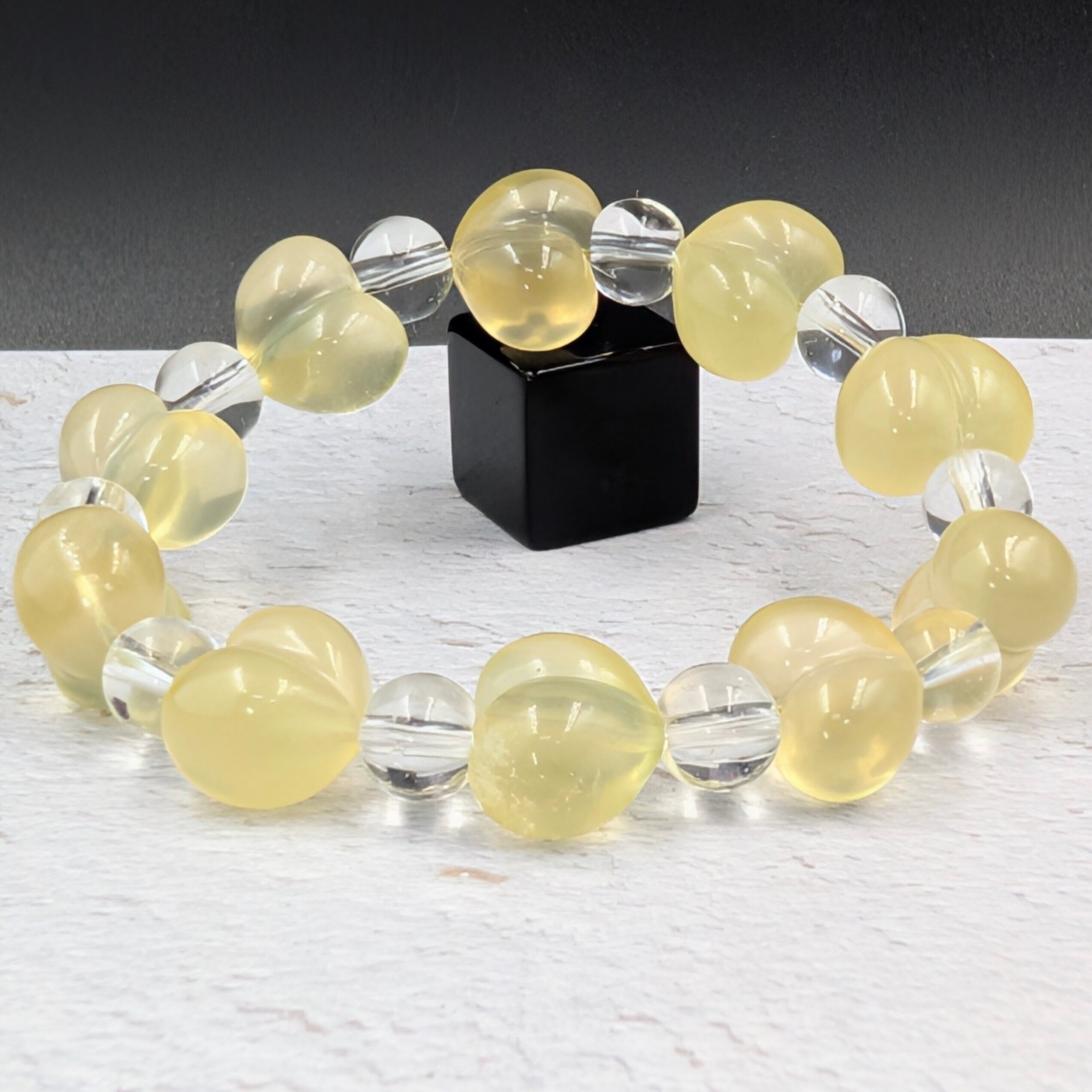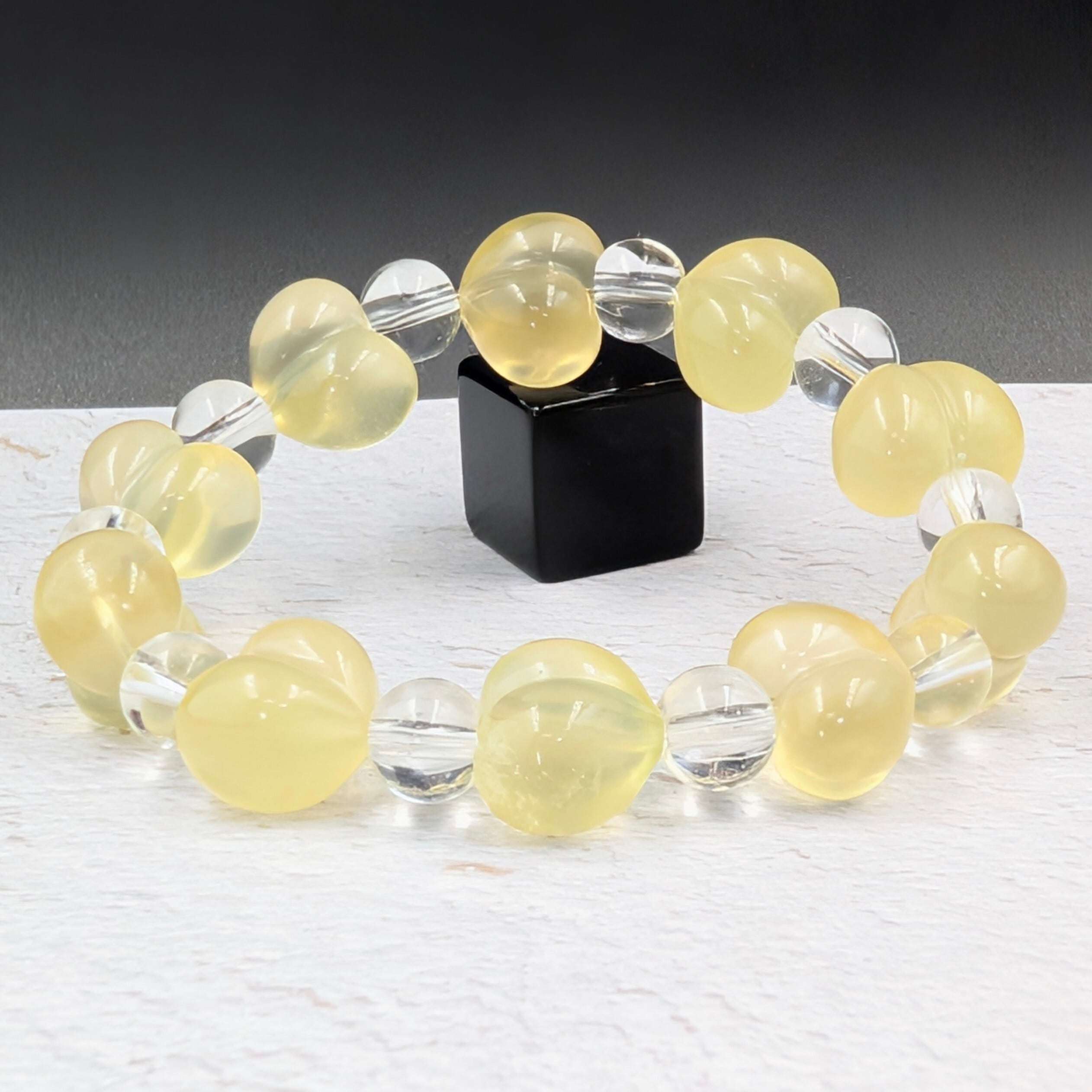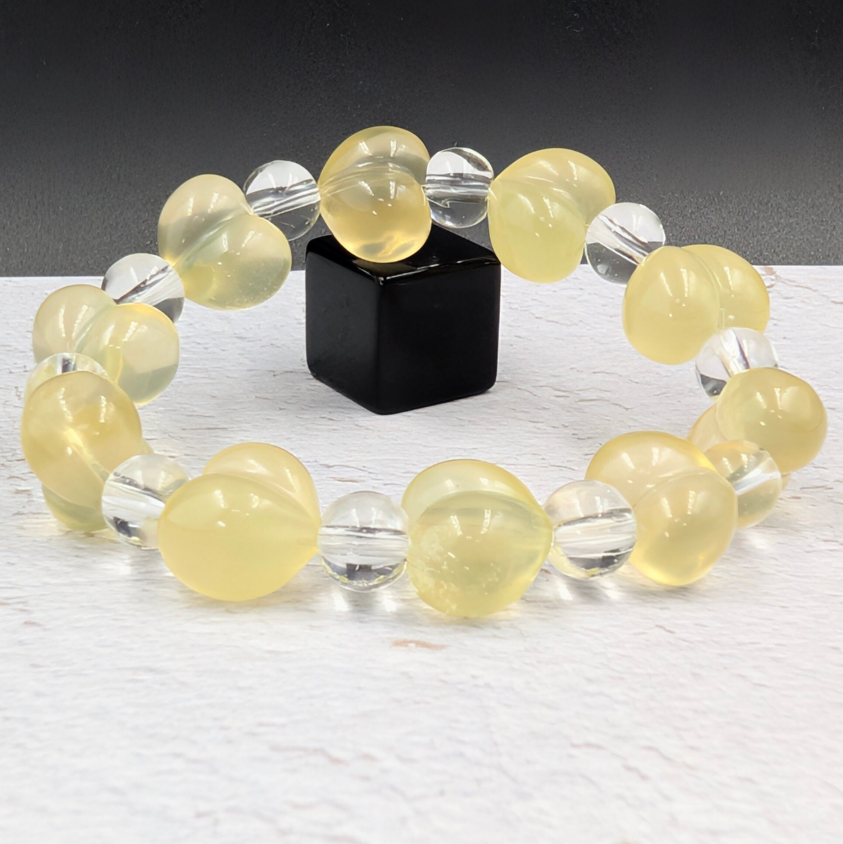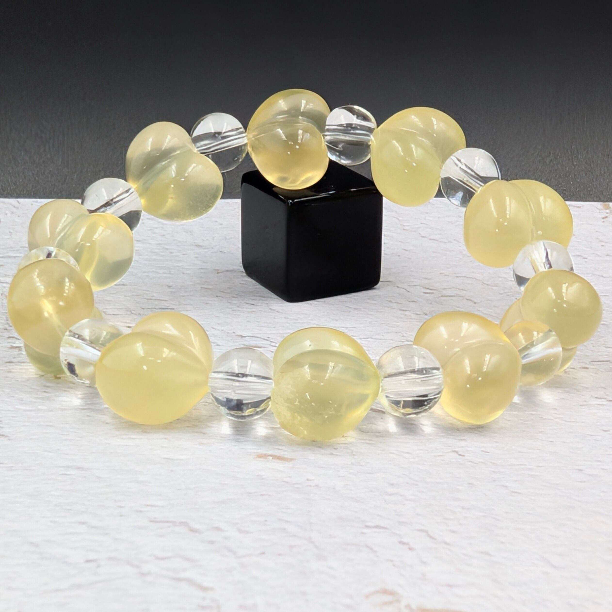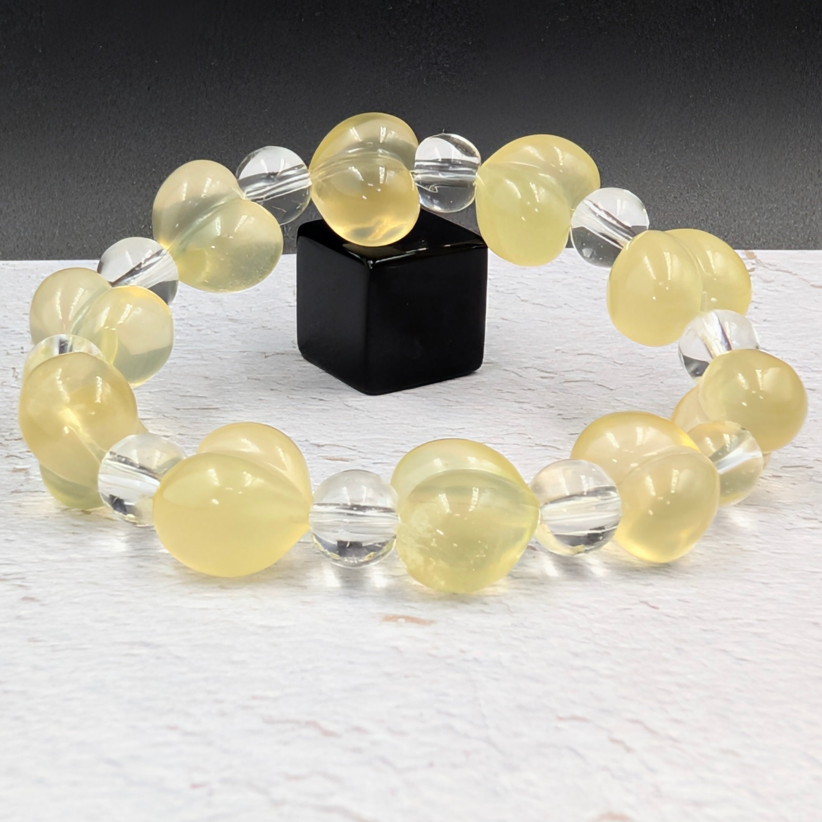 可憐なハートシェイプが目を惹く、イエローフローライトと水晶丸玉を組み合わせた特別なブレスレットです。
