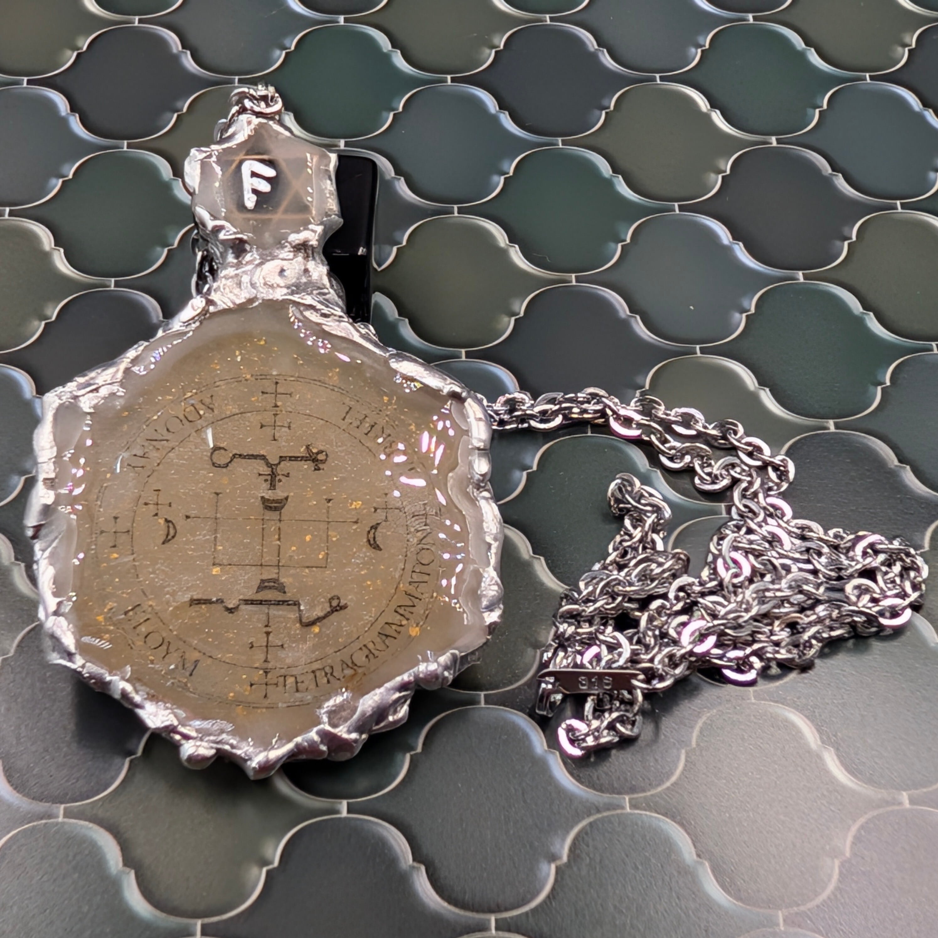 中心には創造神メタトロンの聖印「太陽の第一魔法円」を刻印。これはすべての願いを現実化する“至高の法”と伝えられ、ソロモン王がこの印で悪魔ベリアルを支配し、富と繁栄を得たという伝説を持つ。すなわち本品は「富・成功・守護・霊的覚醒」を統べる全能の象徴