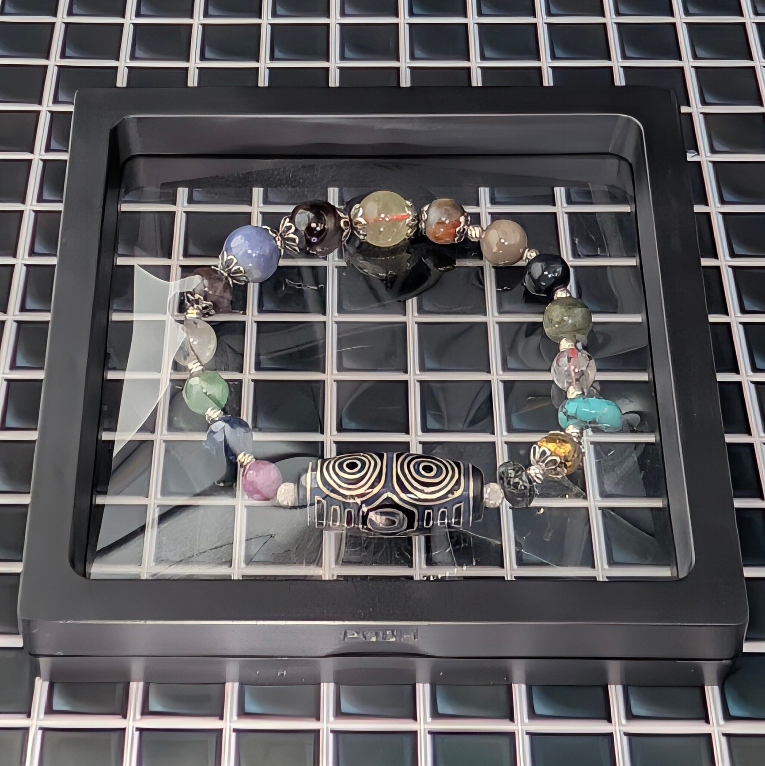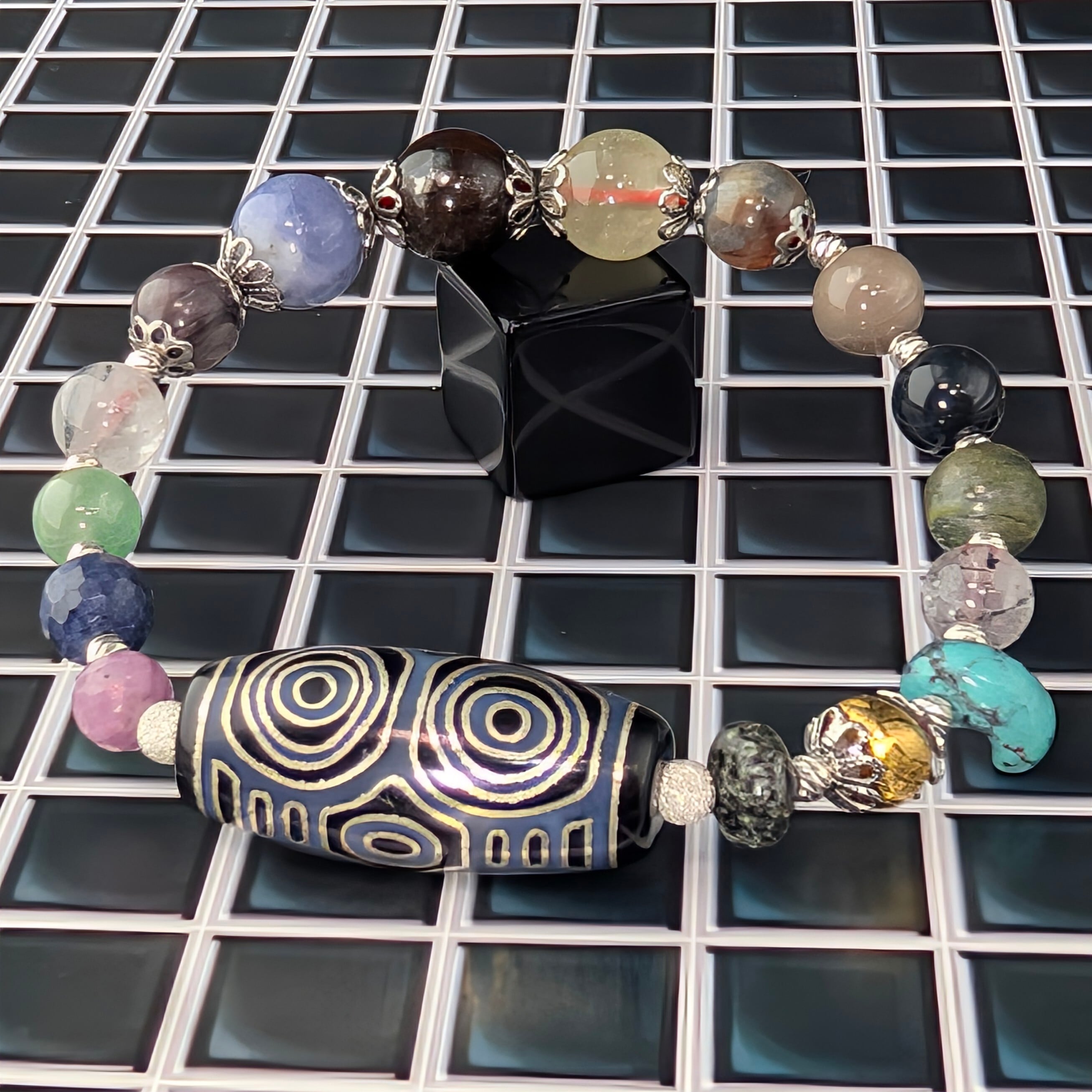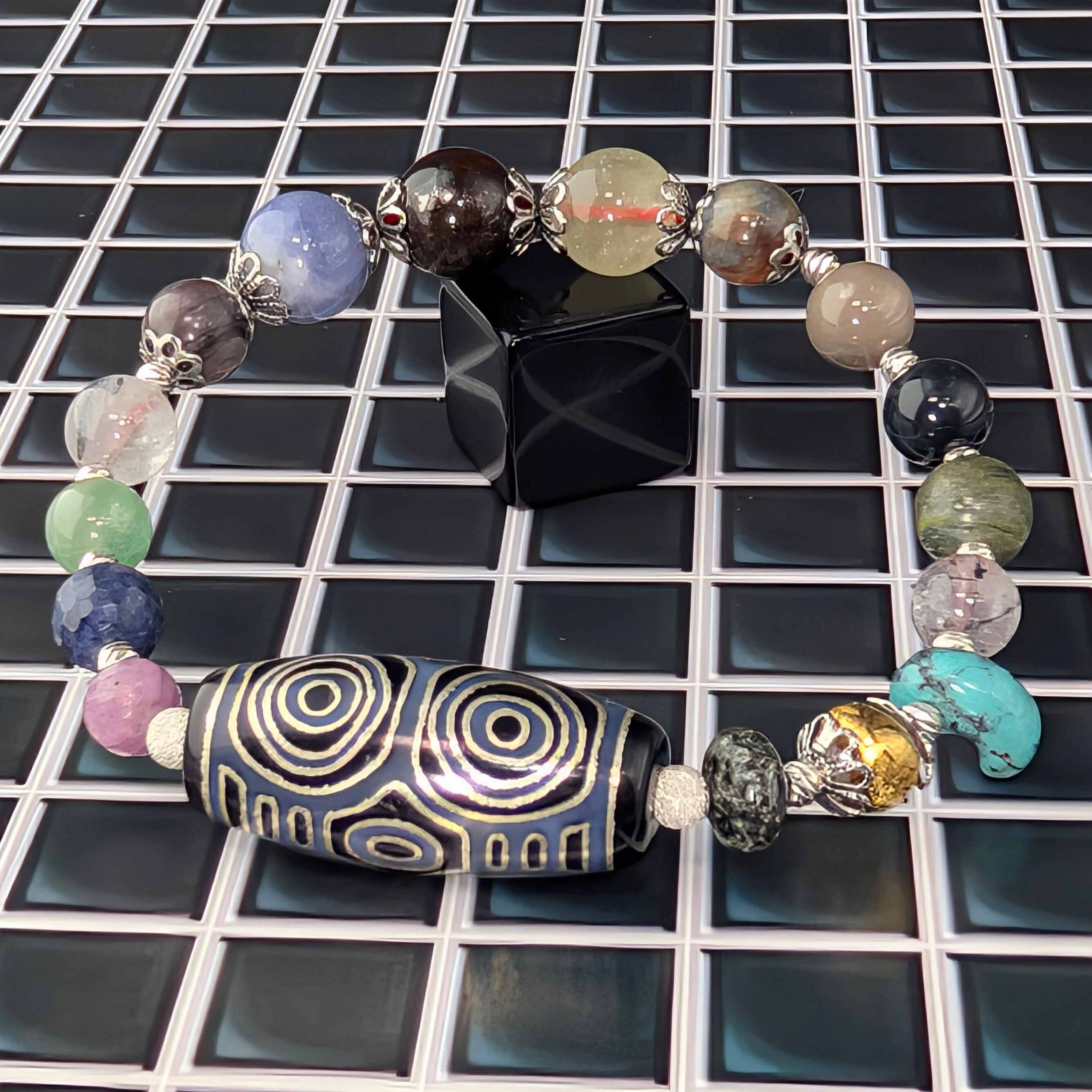 数あるチベット天珠の中でも、ひときわ強い威厳を持ち「天珠の王様」と称される龍眼(りゅうがん)天珠。本作はその中でも希少な「銀線」を施した特別限定版を用いた一点物の創作ブレスレットです。