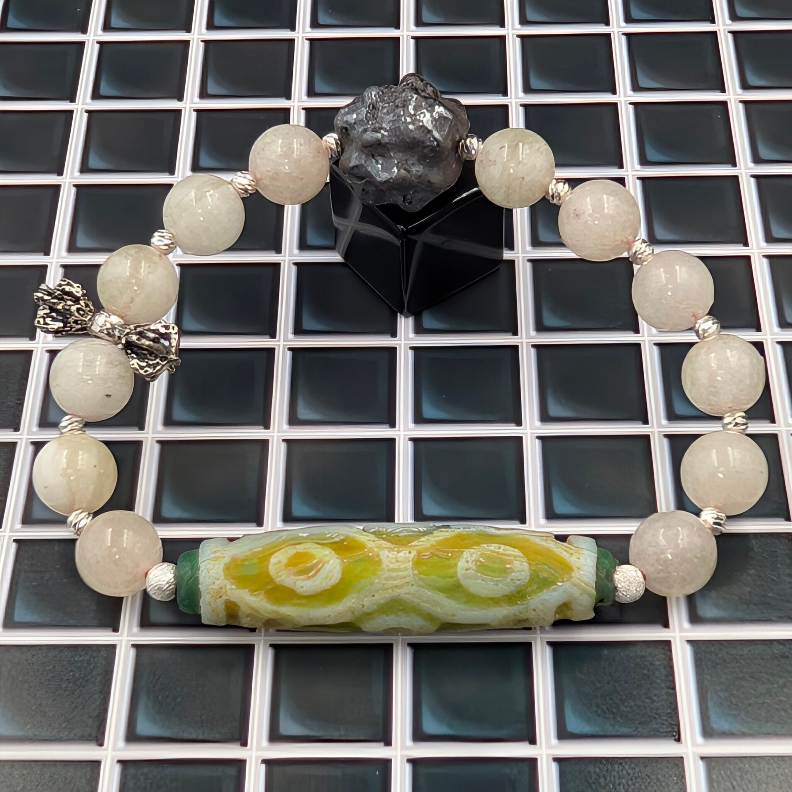 中核に据えたチベット天珠は、かつて飛行機事故から奇跡的に生還者が身に着けていたという逸話を持つ“生還と再生”の象徴。天より降る霊虫が化したとも伝えられ、「空より来た神の印」と畏敬されてきました。稀少龍眼手彫りの意匠は、財の巡りや富、縁の結束を象徴すると語り継がれています。