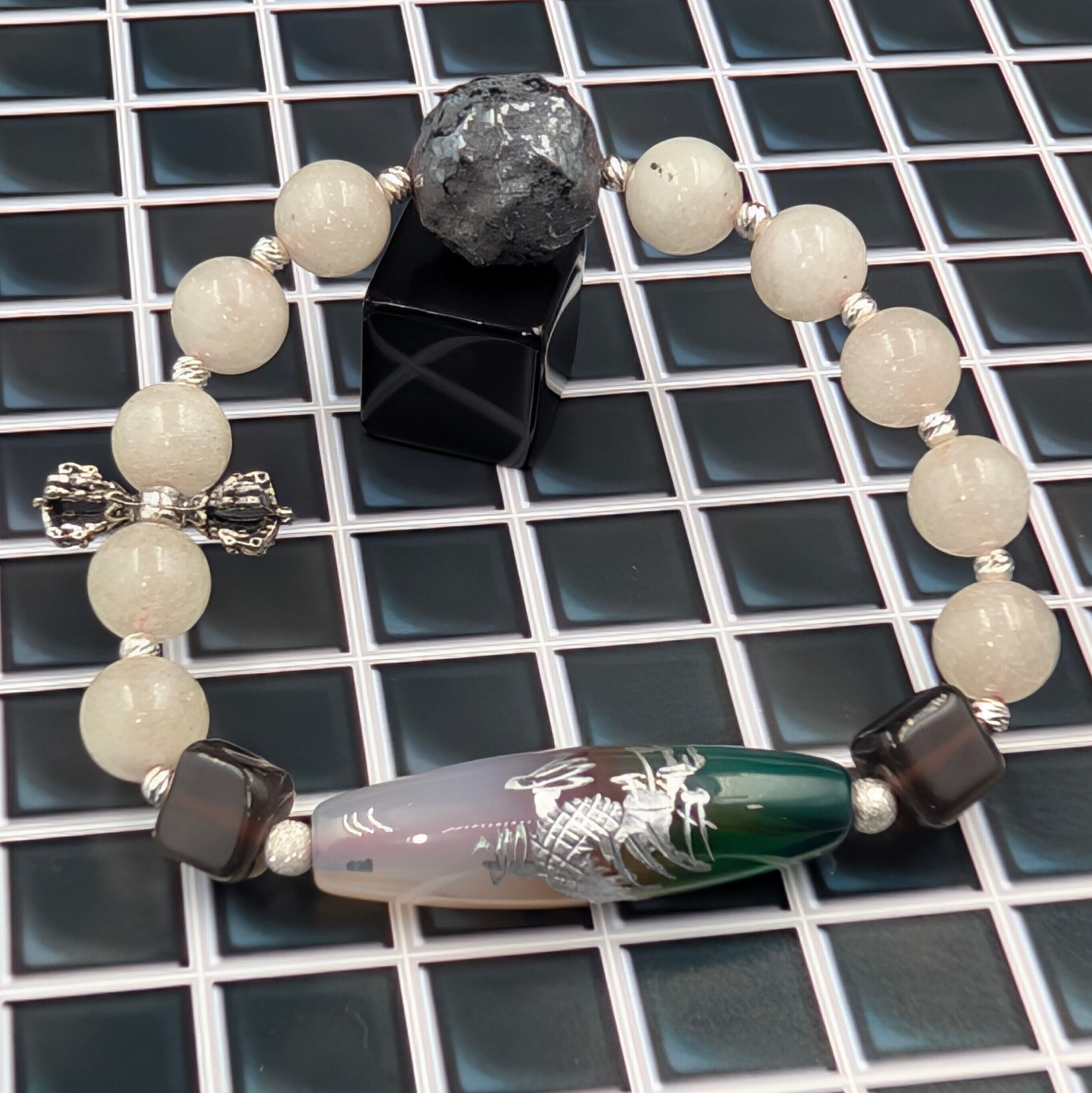 魔術師タリカム制作による、希少な鉱物を組み合わせ、物語性と意匠性を極めた一点物ブレスレット。いにしえより呪禁導師は、天象・鉱霊・言霊を重ね、願望を象徴として編み上げてきました。本作はその古式製法を踏まえ、装身具としての美しさと意図の具現力を重視した創作作品