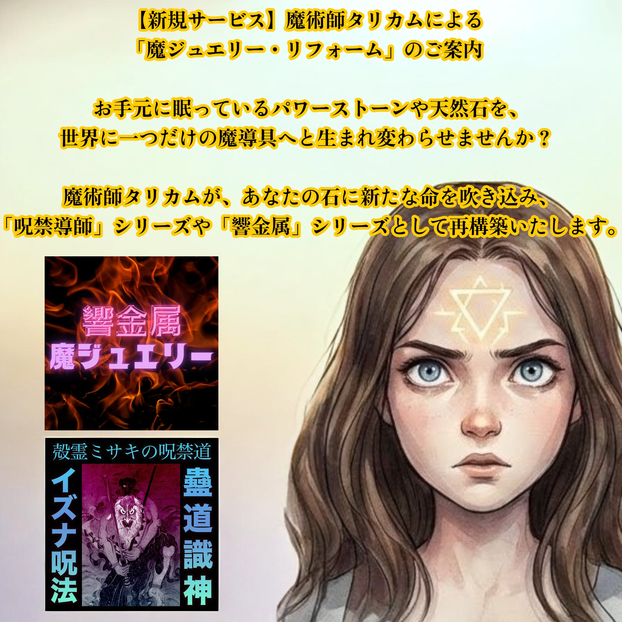 魔術師タリカムが、あなたの石に新たな命を吹き込み、「呪禁導師」シリーズや「響金属」シリーズとして再構築いたします。