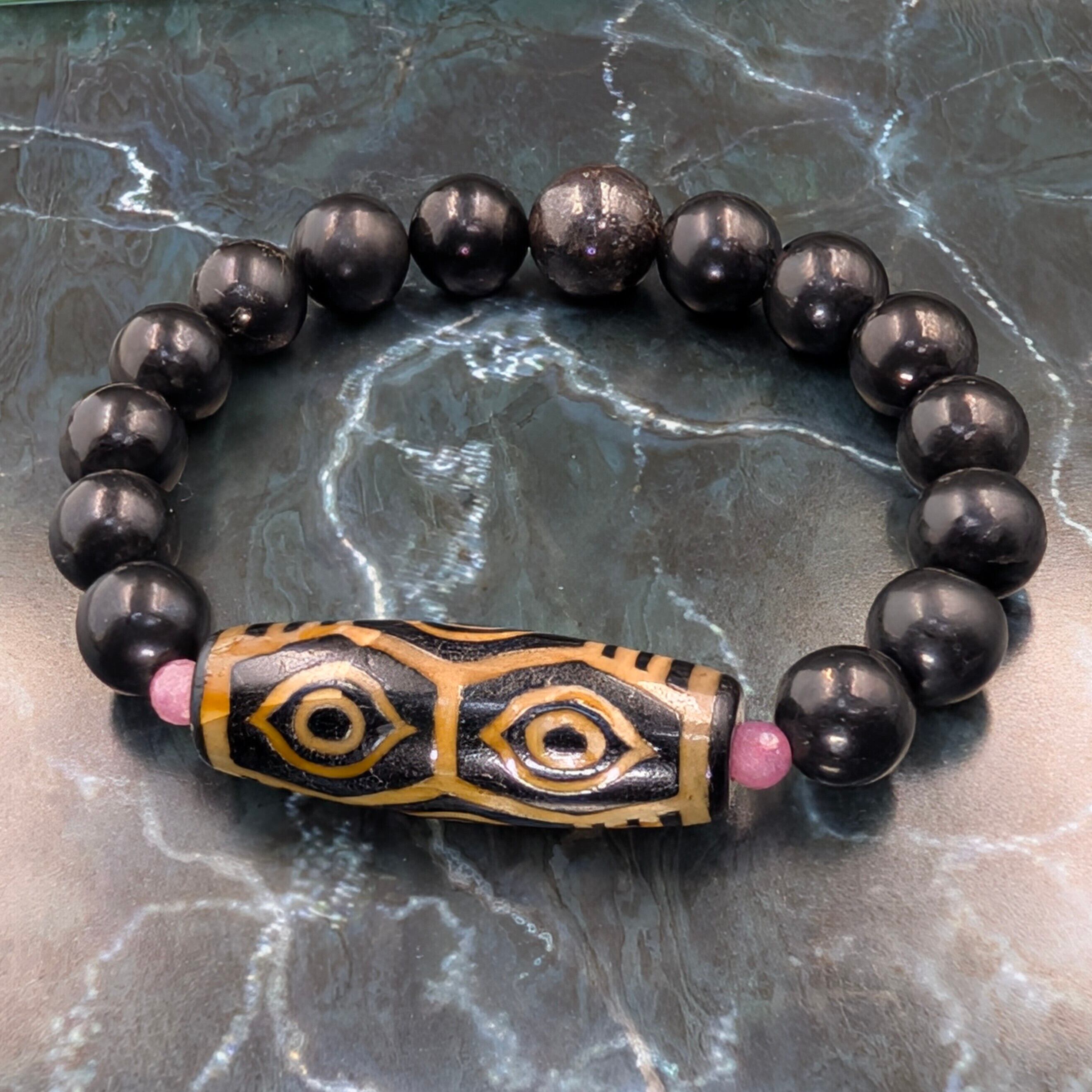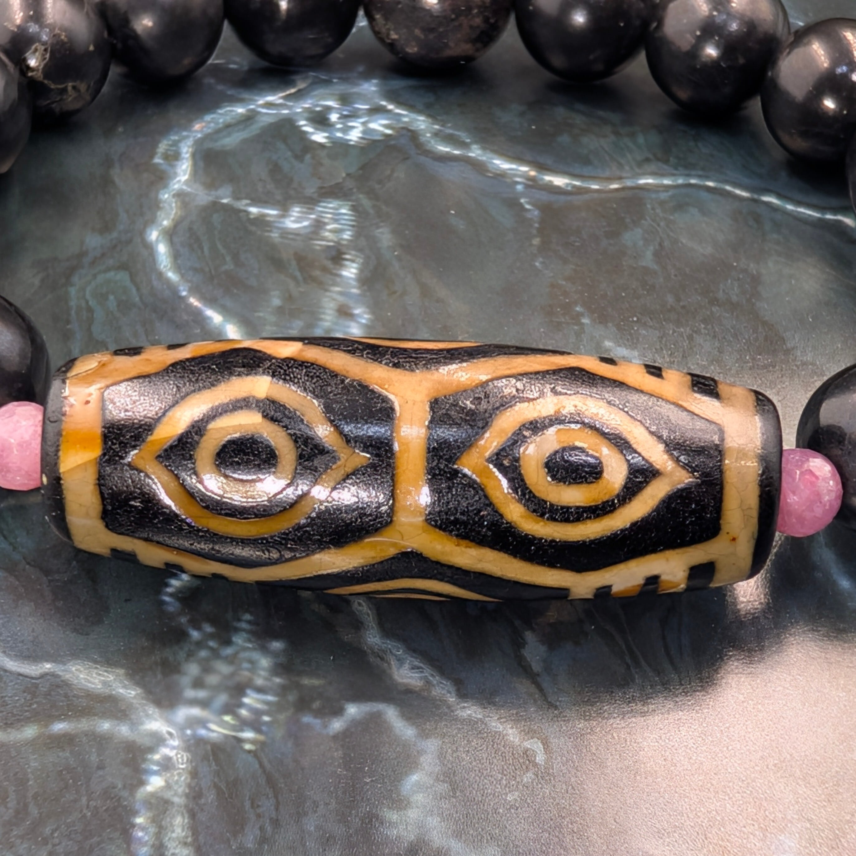 核となるのは、皇帝の象徴たる「龍」の眼を宿した龍眼天珠。香煙と炎で限界まで焼き込んだ「火供」の荒々しい質感は、龍の鱗を想起させます。飛行機事故から奇跡的に生還した僧侶の逸話を持つこの紋様は、権力・富・絶対守護を司り、龍脈を呼び込む究極の護符。ソロモンの赤紐を象徴する紅の糸で結び、金運と繁栄の結界を張ります。