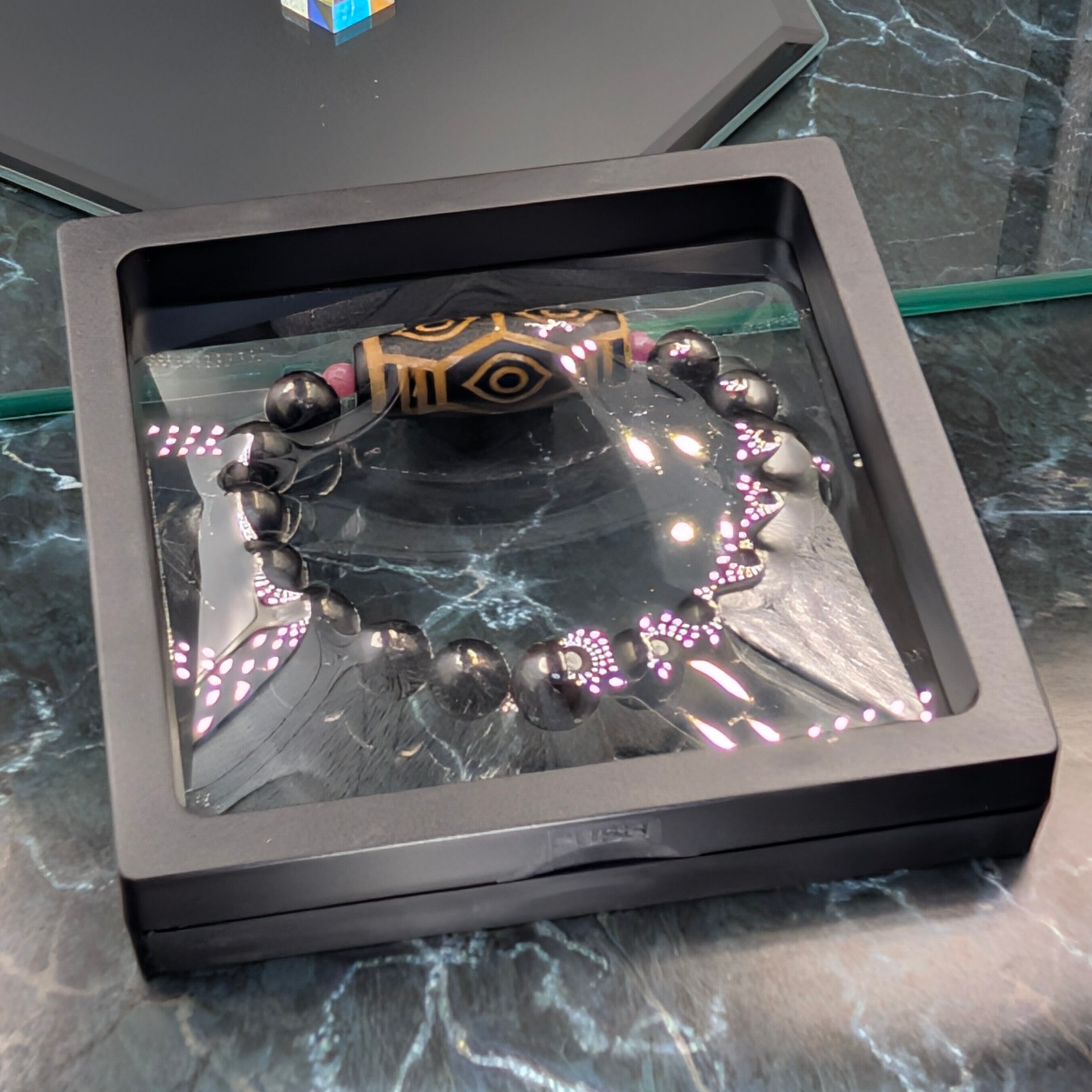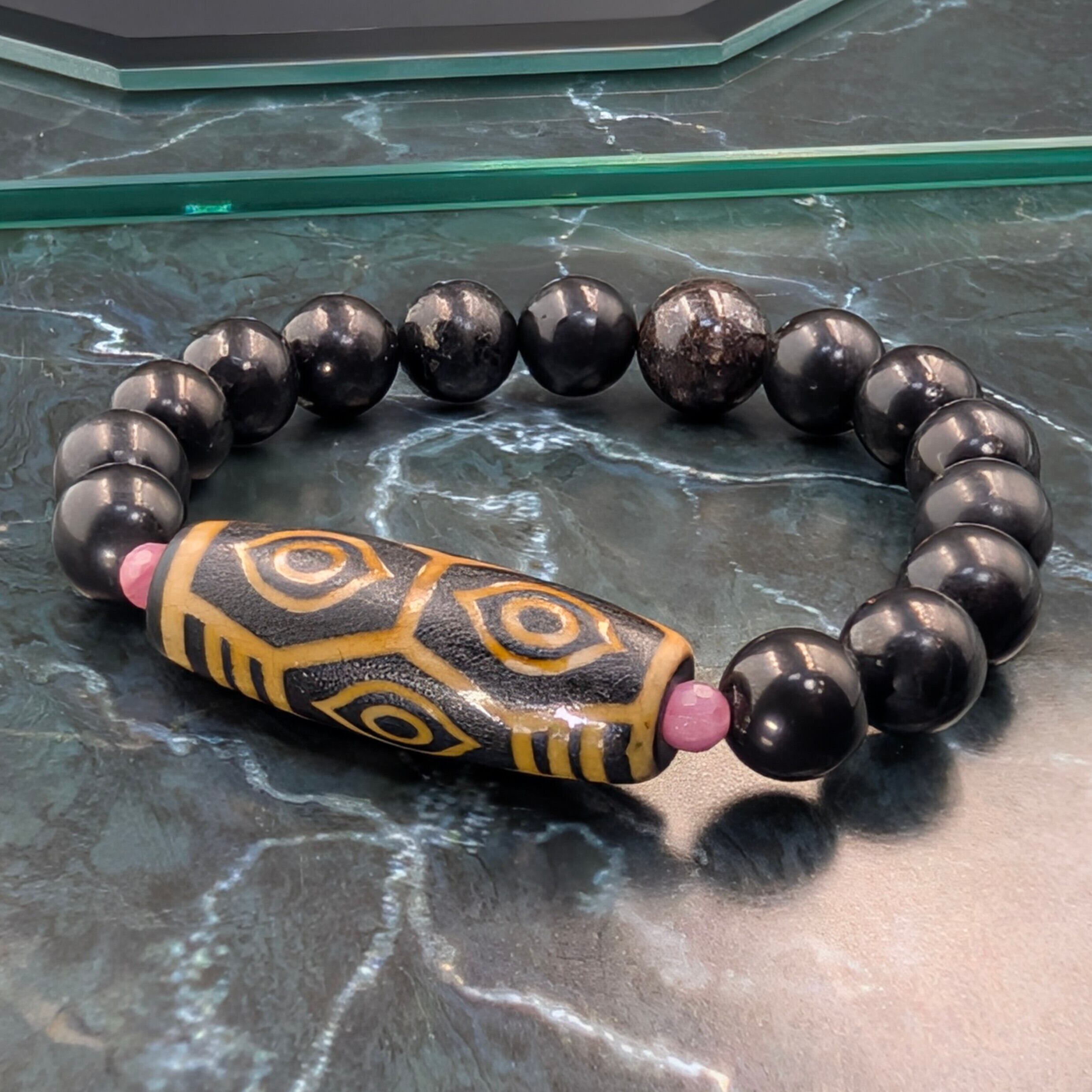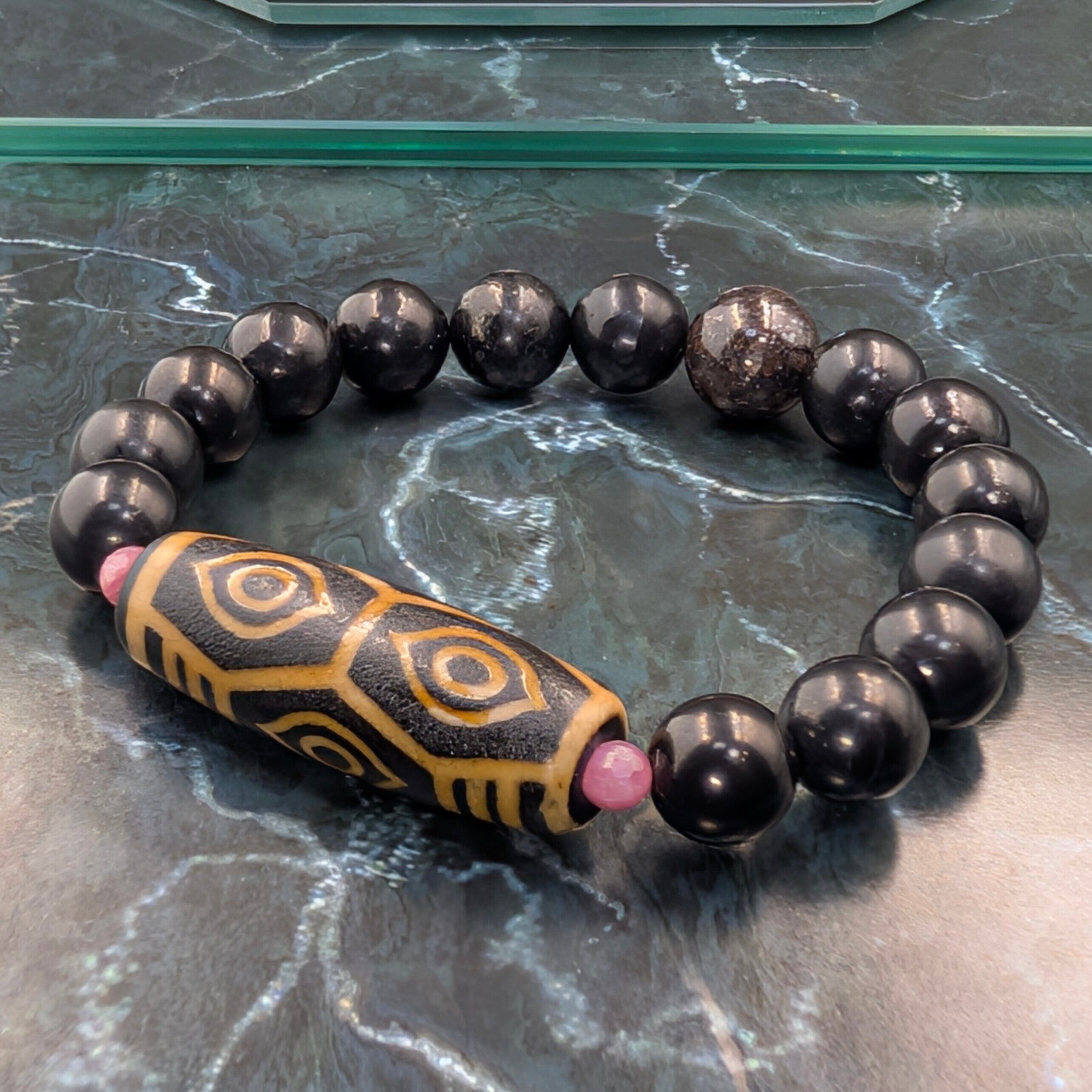 核となるのは、皇帝の象徴たる「龍」の眼を宿した龍眼天珠。香煙と炎で限界まで焼き込んだ「火供」の荒々しい質感は、龍の鱗を想起させます。飛行機事故から奇跡的に生還した僧侶の逸話を持つこの紋様は、権力・富・絶対守護を司り、龍脈を呼び込む究極の護符。ソロモンの赤紐を象徴する紅の糸で結び、金運と繁栄の結界を張ります。