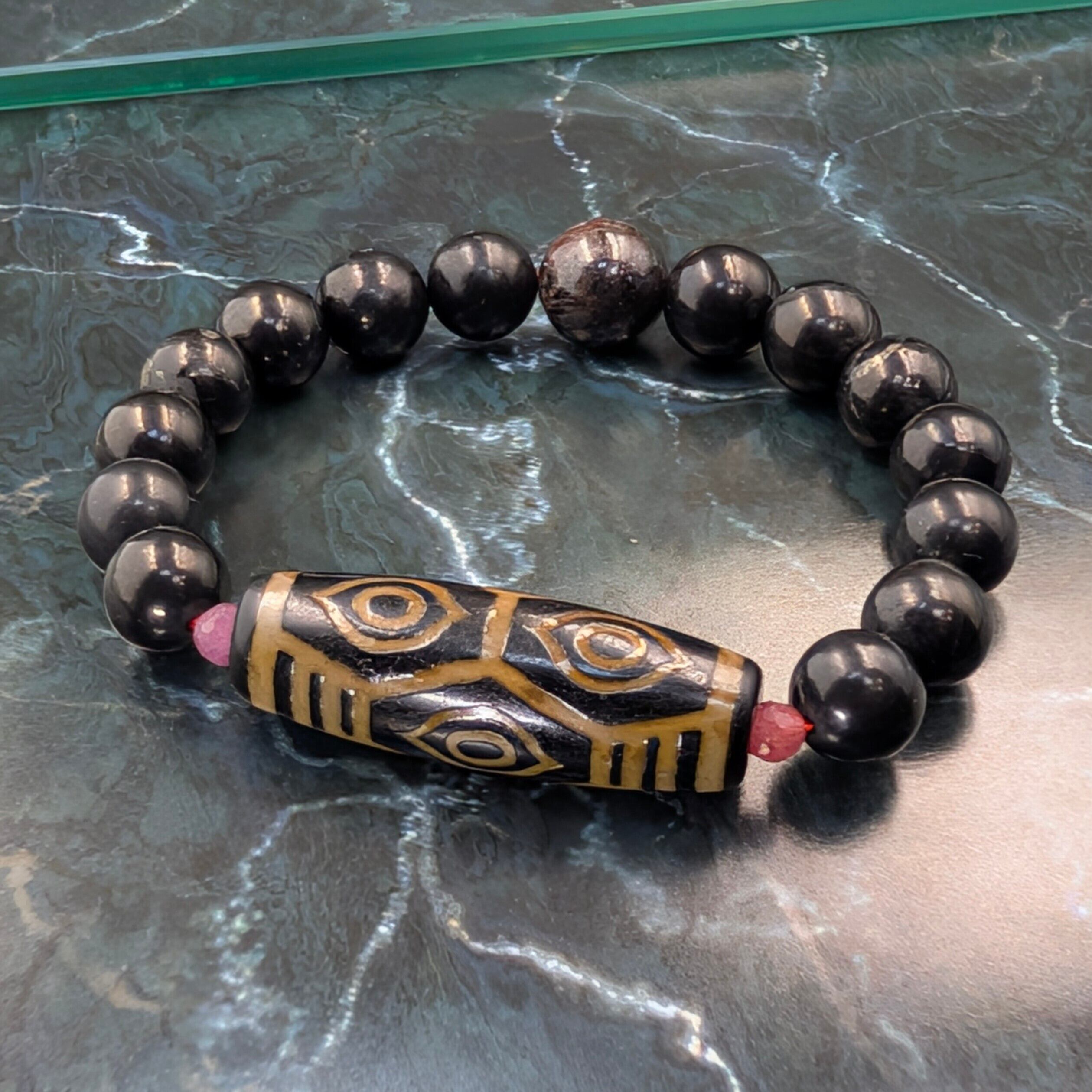核となるのは、皇帝の象徴たる「龍」の眼を宿した龍眼天珠。香煙と炎で限界まで焼き込んだ「火供」の荒々しい質感は、龍の鱗を想起させます。飛行機事故から奇跡的に生還した僧侶の逸話を持つこの紋様は、権力・富・絶対守護を司り、龍脈を呼び込む究極の護符。ソロモンの赤紐を象徴する紅の糸で結び、金運と繁栄の結界を張ります。