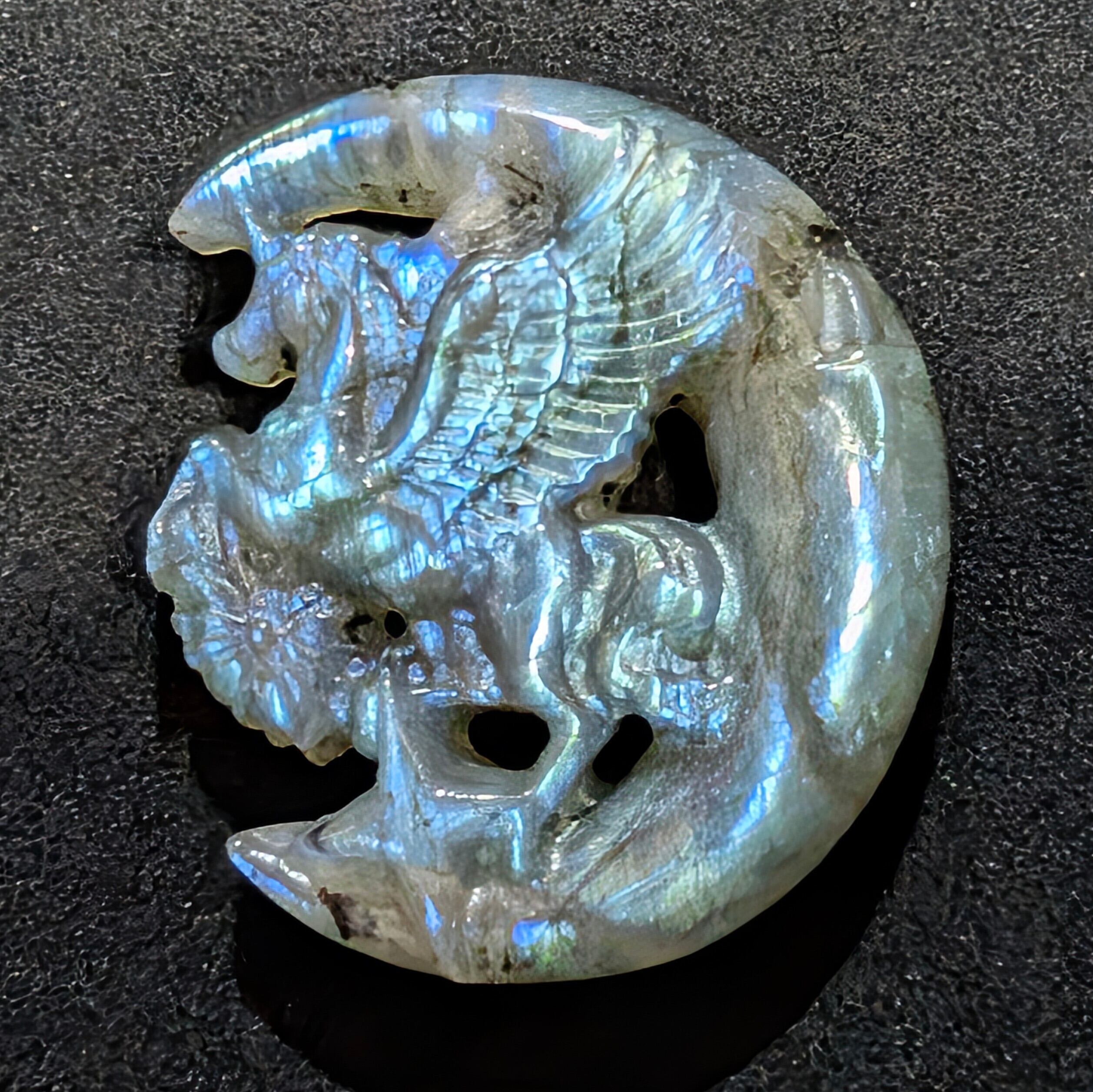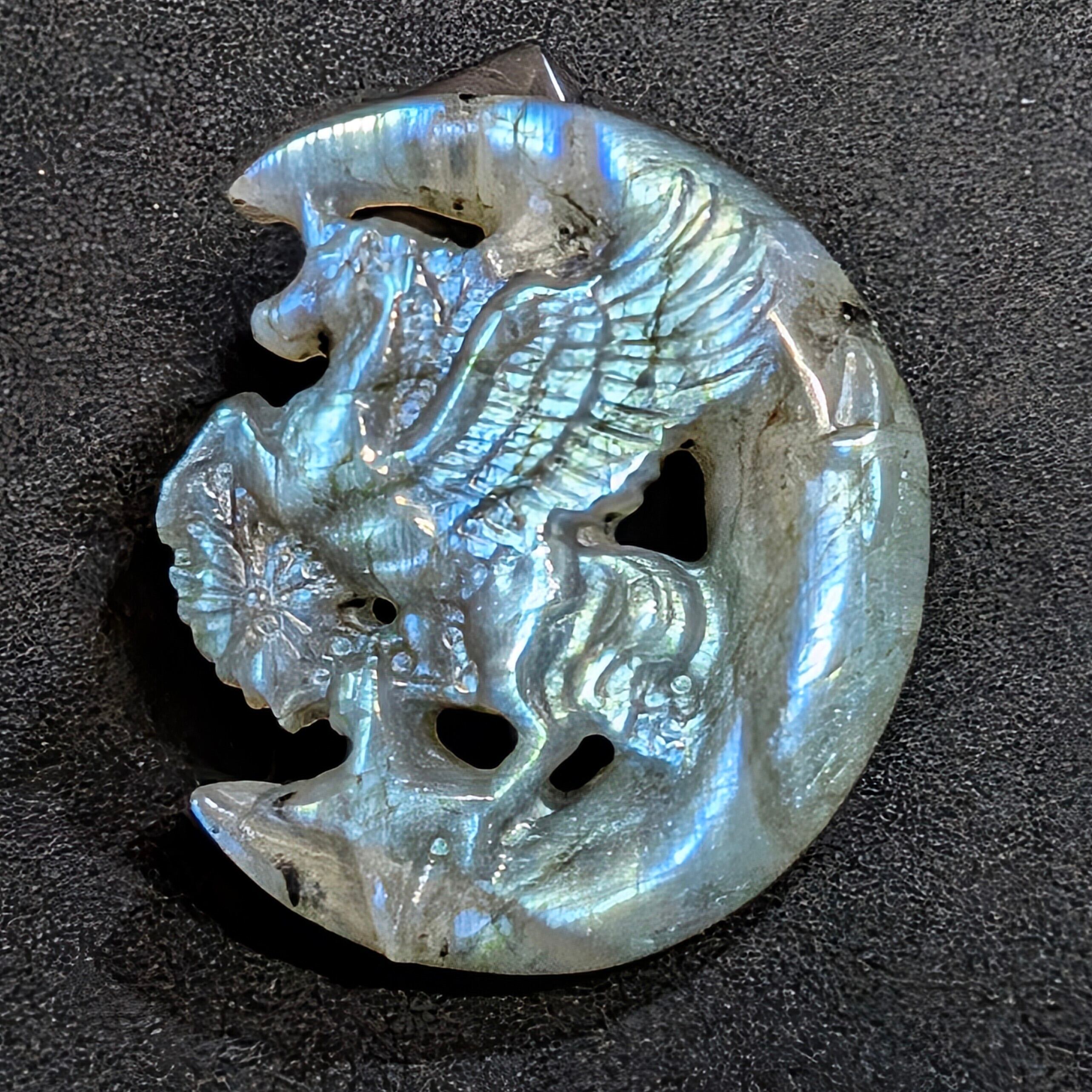 本品は、ただのペガサス彫刻ではありません。ラブラドライトの神秘的なラブラドレッセンスが角度を変えるたびに青・緑・金色の光を放ち、まるで天空を駆ける天馬グルファクシの鬣が煌めく瞬間を再現します。細部まで丹念に彫られた造形美は職人技の極致。紐を通せばペンダントトップとしても使え、持ち主の胸元に常に天馬の力を宿せます。