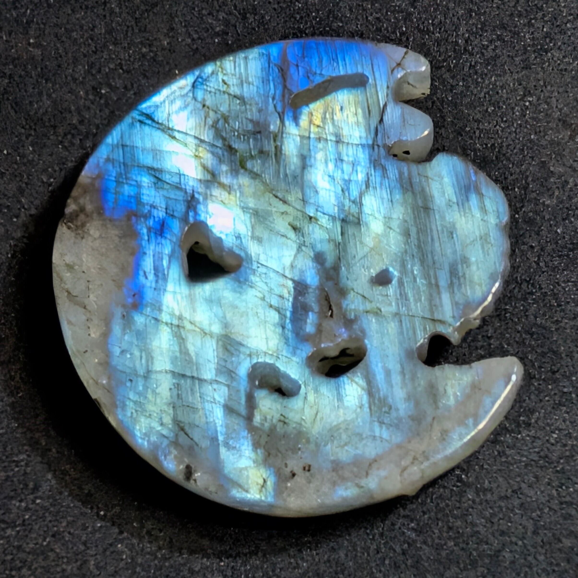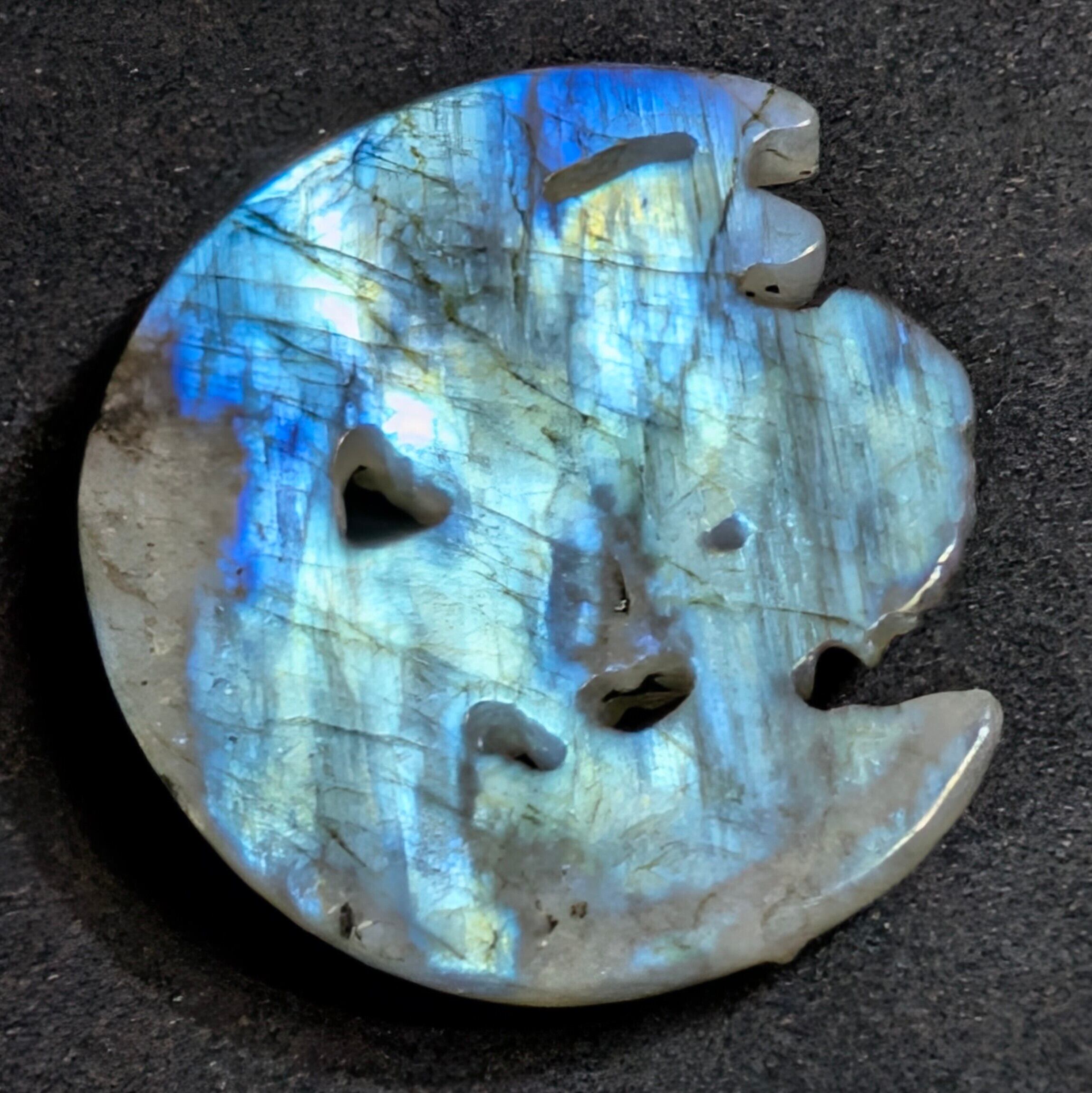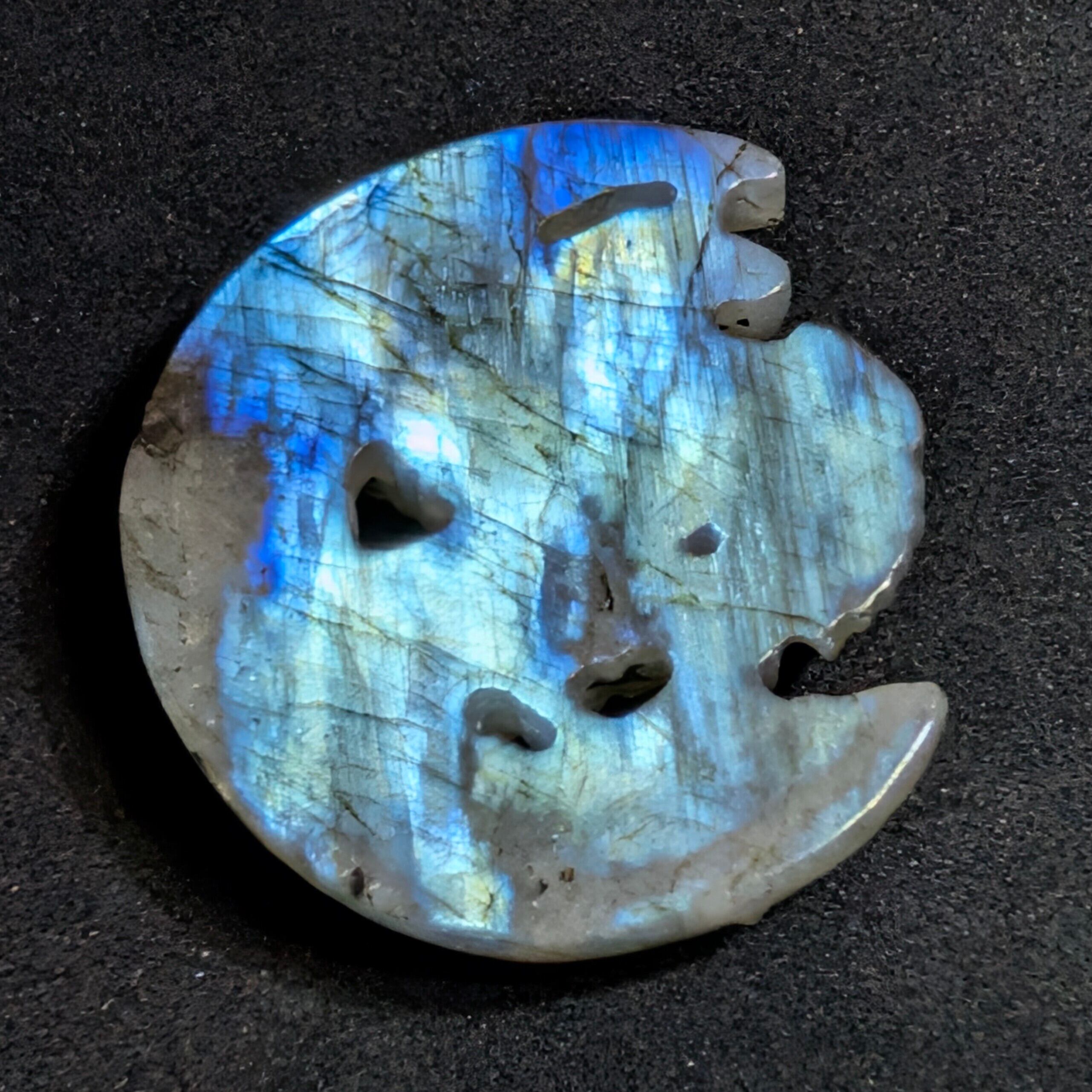 さらにアフリカ民話「アヨングの魔法石」の霊力も宿ります。幼くして父を亡くした少年アヨングが、精霊の化身である妖婆から授かった小石は、願うだけで富を授けるとされました。彼は石の導きで成人し、最後には妖婆の教えに従い渓流へ返しました。禁忌を守った者にこそ真の幸福が訪れるという象徴であり、ラブラドライトの輝きに重なって今ここに蘇ります。