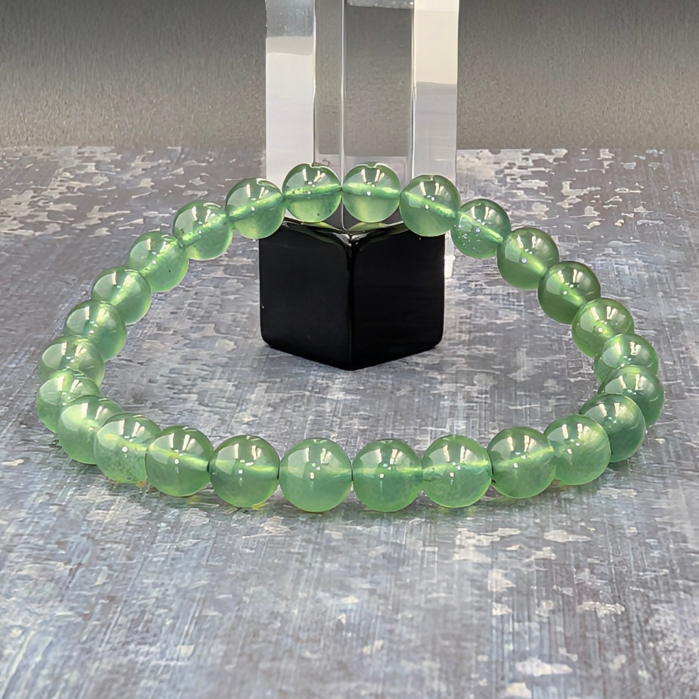 今回入荷分は微細な黒点を含みつつも、澄んだ爽やかさを保った上質な表情が魅力です。玉サイズは約6.8mm、腕周り約15cm、伸縮性があり軽量約10gで、日常使いにも瞑想時にも自然に寄り添います。