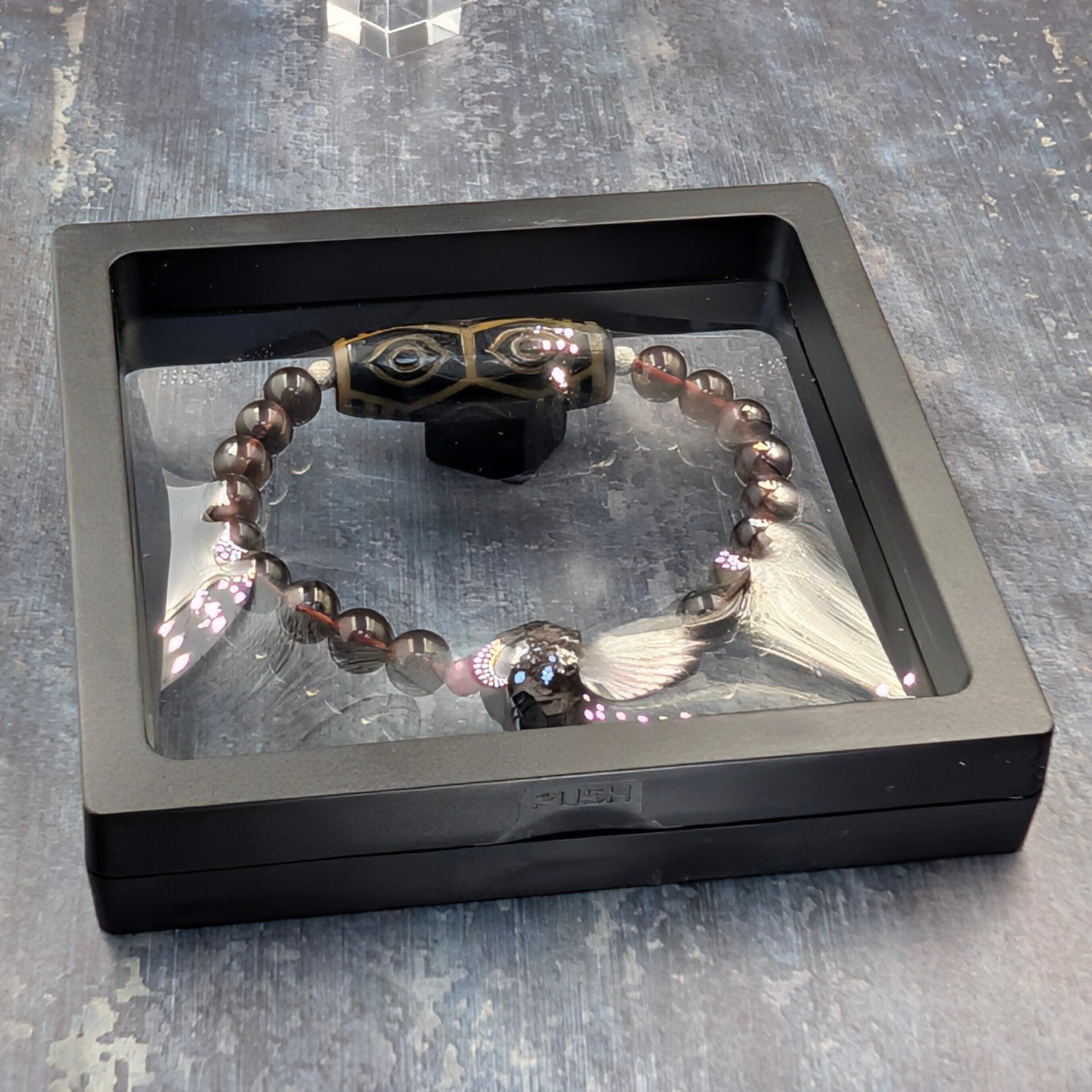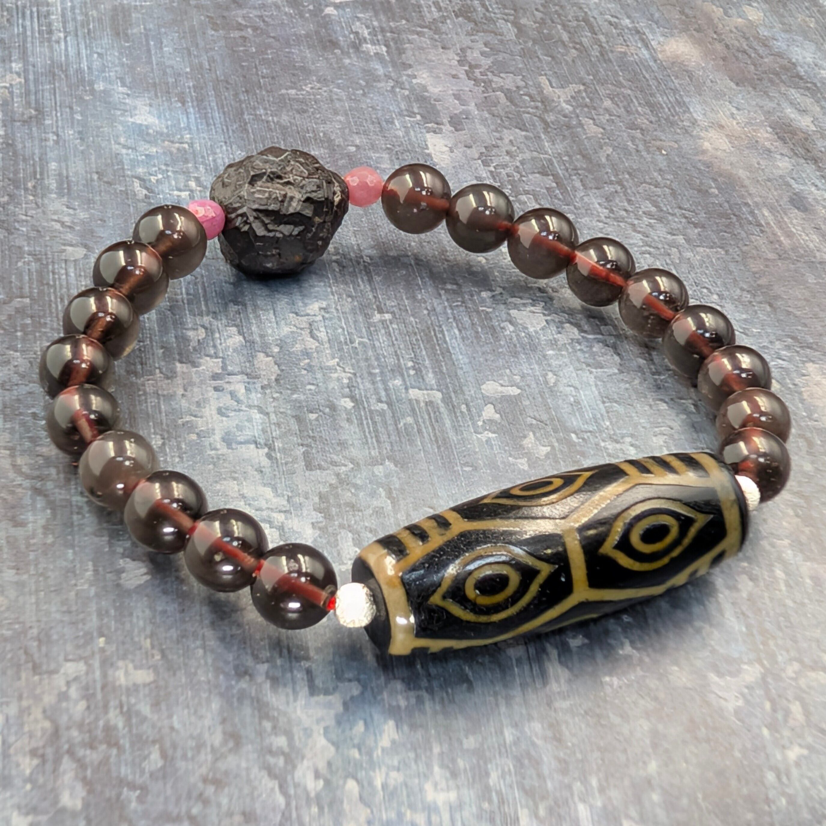 核に据えたのは、香煙と炎で焼き締めた火供龍眼天珠。飛行機事故から奇跡的に生還した僧侶の逸話を持ち、「再生・絶対守護・財運循環」の象徴として畏敬されてきた天珠の王です。荒々しい質感は龍の鱗を想起させ、富・権威・縁の結束を呼び込むと語り継がれています。