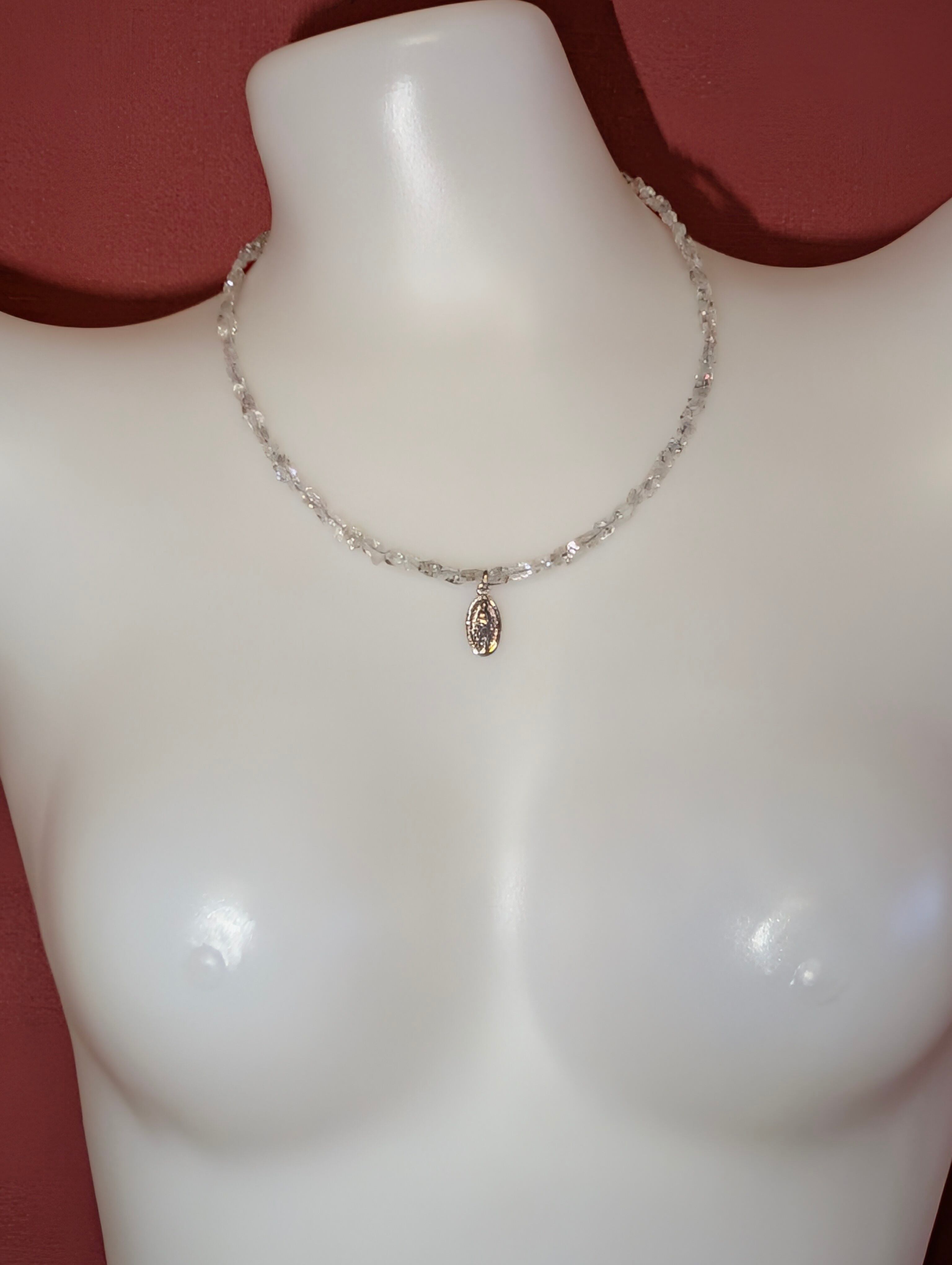 【仕様】内径約44cm/極太ステンレスナイロンコートワイヤ0.5mm使用タフショック仕様、金具ALLシルバー925。ハーキマーダイヤモンド原石サイズ約5〜6mm、重さ約13g。不思議のメダイ(シルバー925)サイズ最大値約1.5×9.0mm、全長約20.5mm(バチカン含む)。