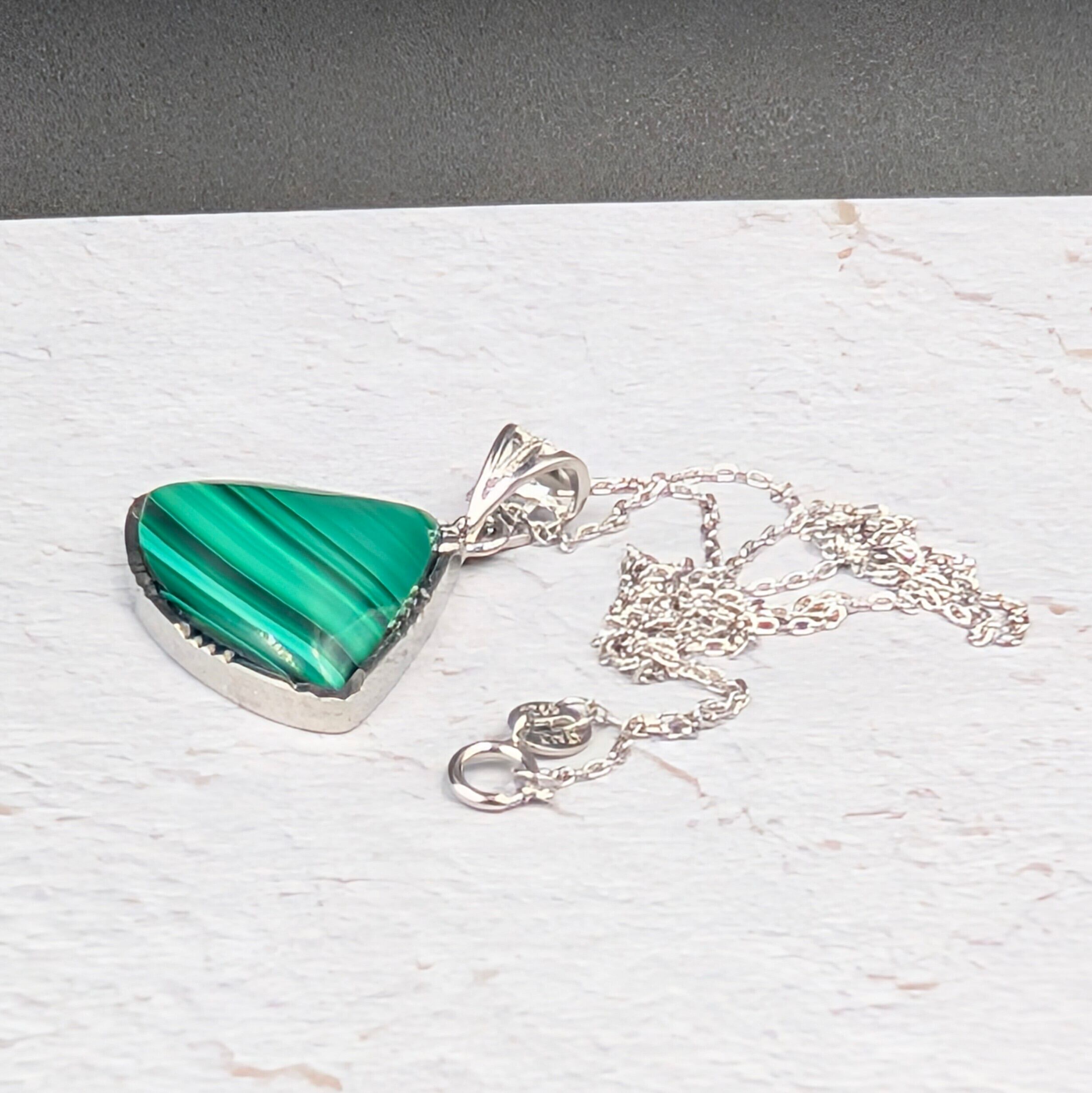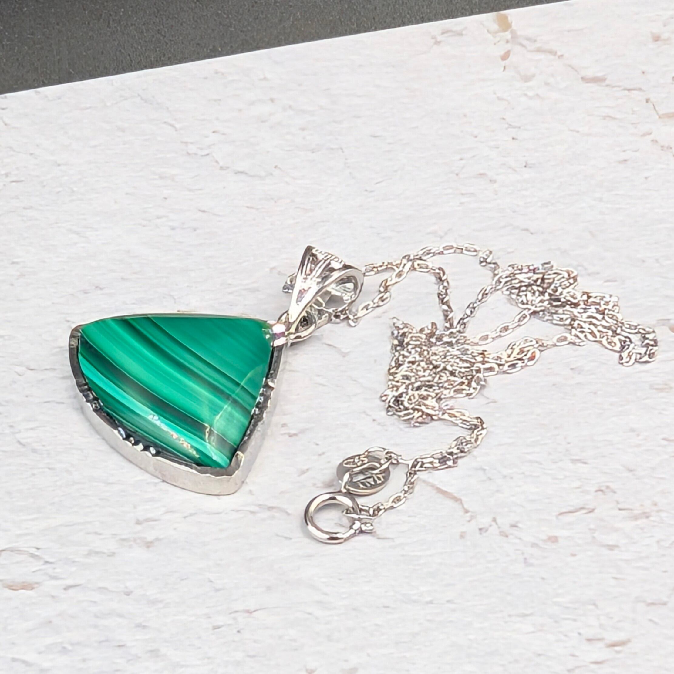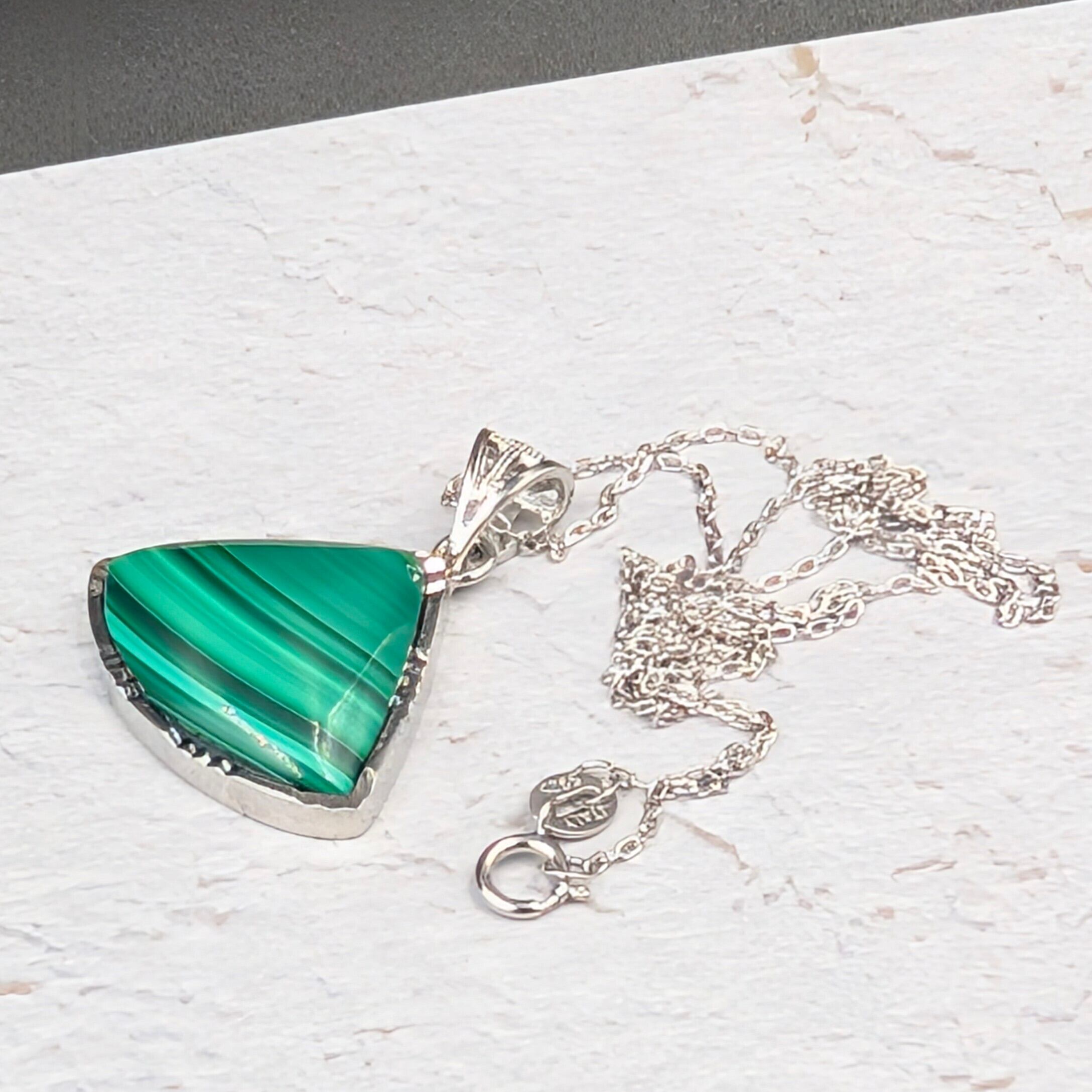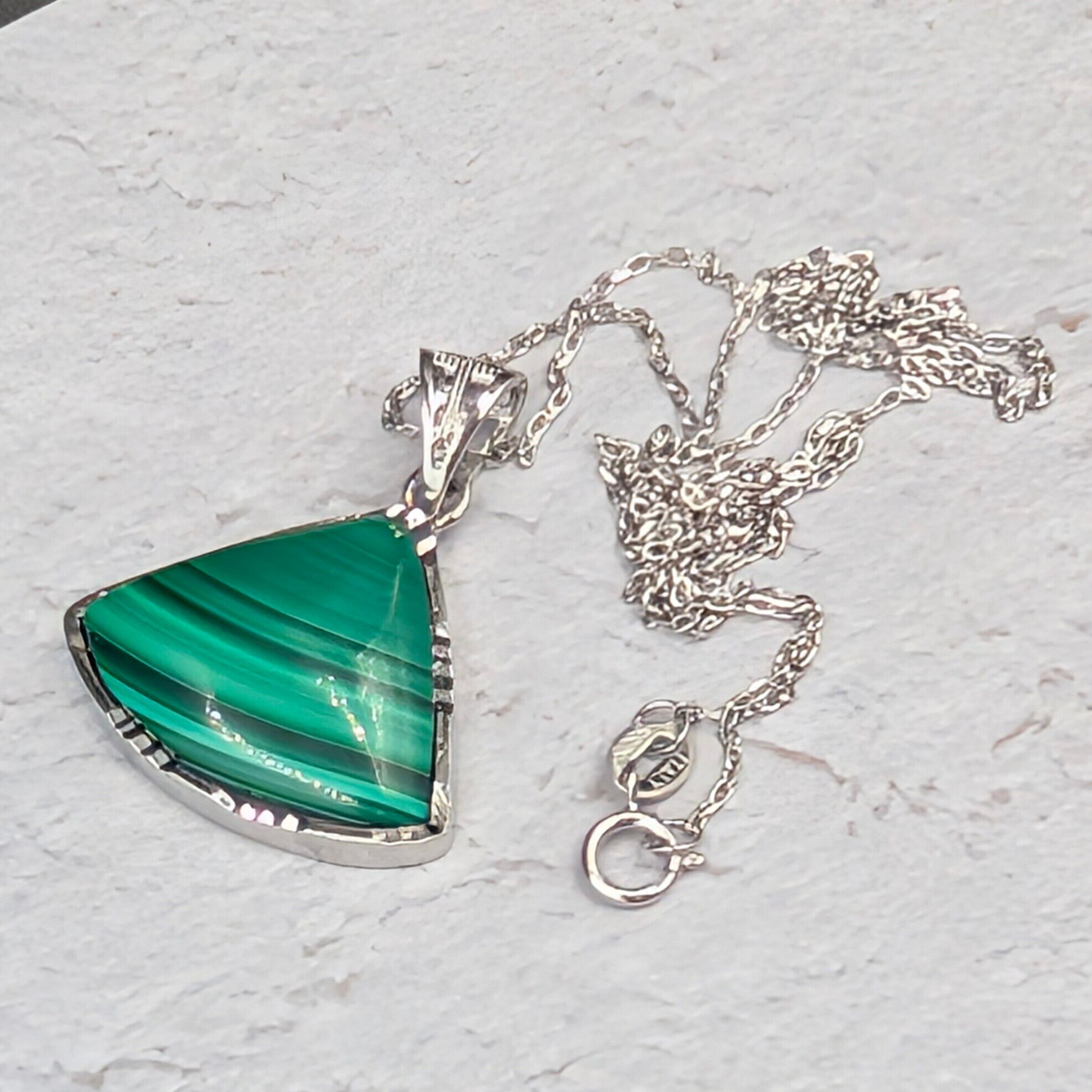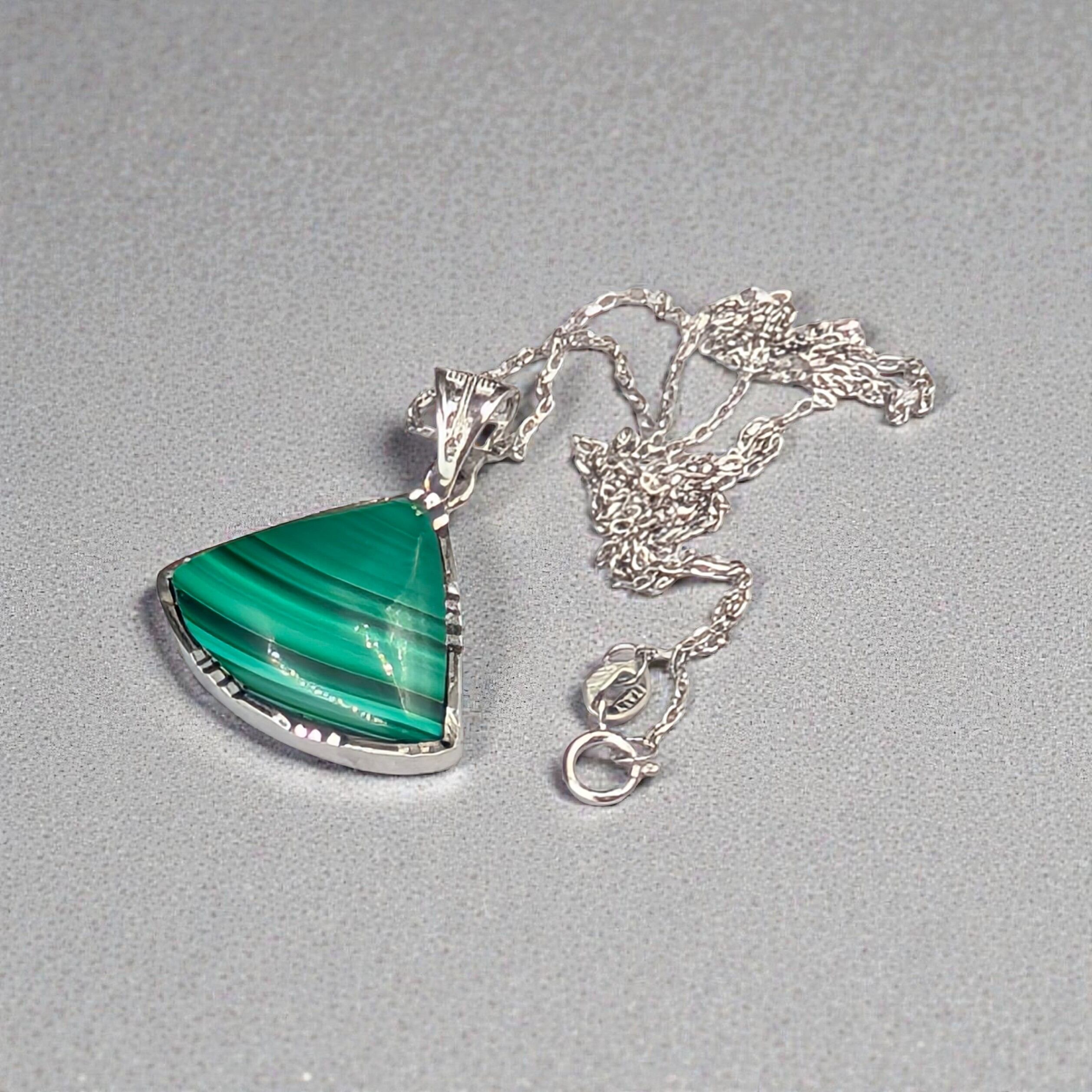 ※限定1【魂を守り導く最強の護符】Silver925マラカイト(孔雀石)扇形ペンダント18-21×14-17mm×45cmアズキチェーン付|コンゴ産・啓発された指導力と自信を授ける守護の聖石 箱つき