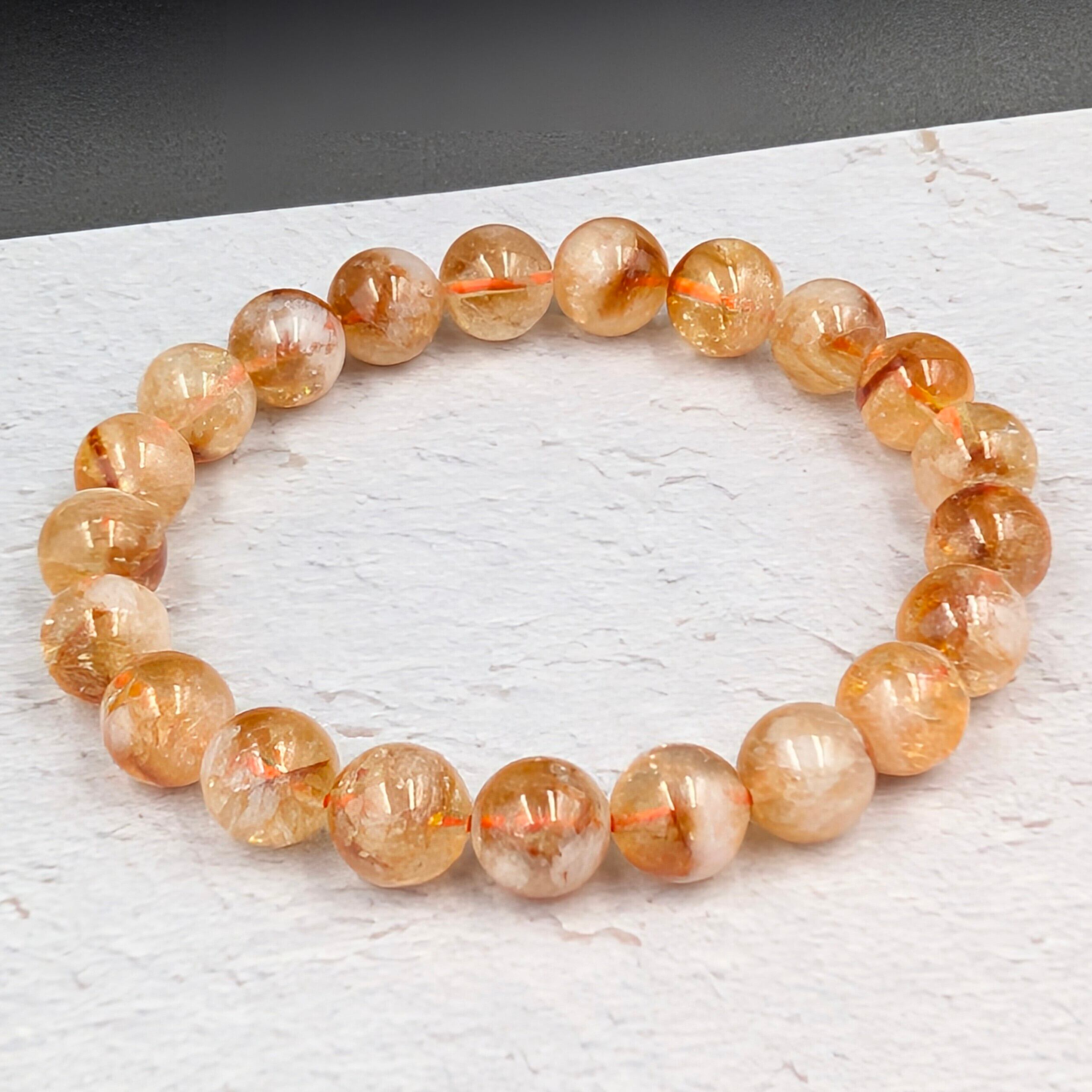 本品はブラジル産の高品質エンジェルフェザーシトリンを使用し、直径約9.5mmの珠が腕周り約17cmの伸縮性ブレスとして仕上げられ、重さ約25gと日常に馴染みやすい快適な着け心地。