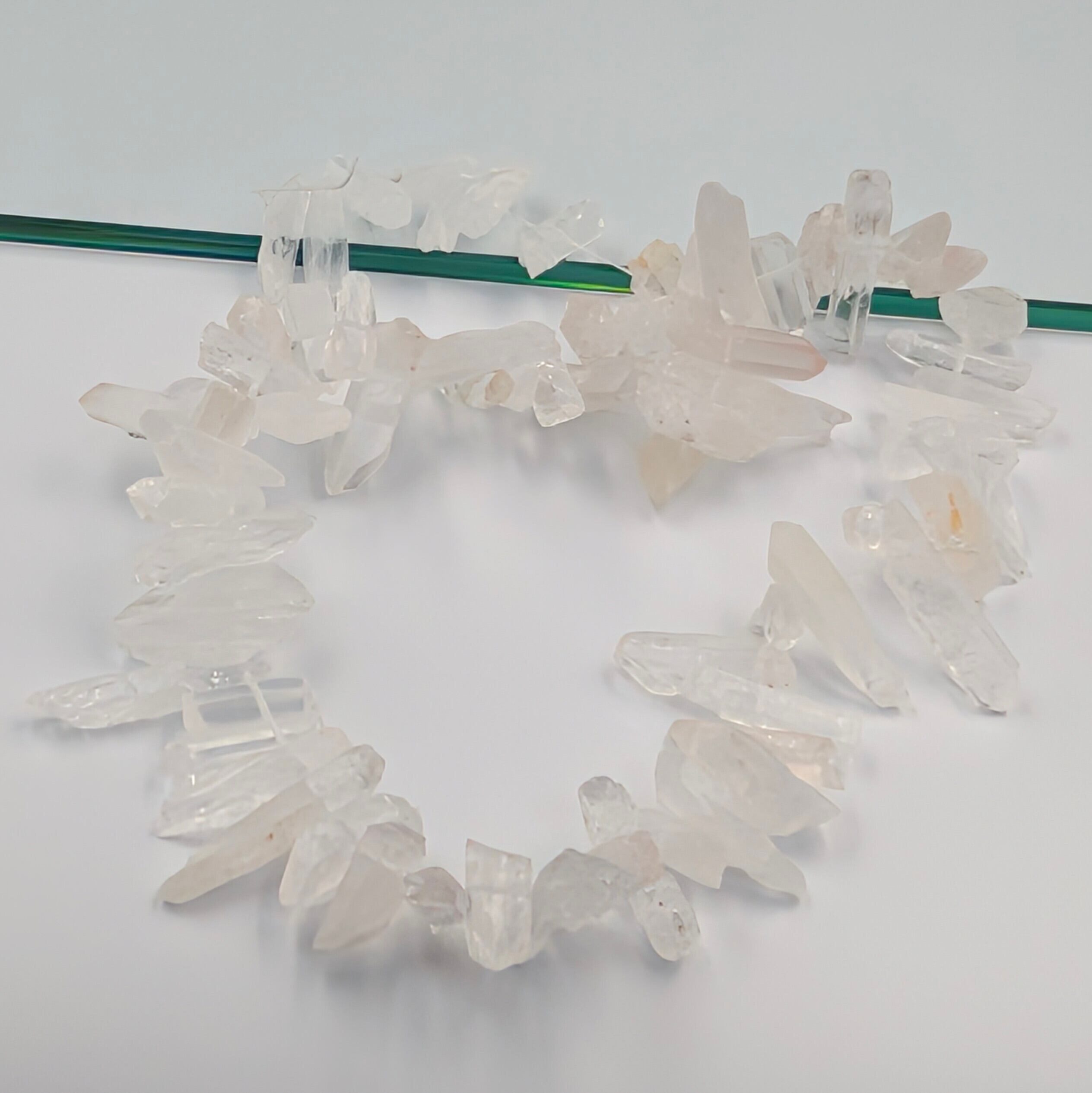 結晶の自然なフォルムをそのまま活かした氷柱形状は、一粒ごとに異なる唯一無二の表情。太さや長さにばらつきがある天然石ならではの魅力をお楽しみいただけます。水晶は六方晶系、硬度7の二酸化ケイ素結晶で、世界中で最も代表的な鉱物のひとつ。無色透明なクリアクォーツは、エネルギー増幅・浄化・記憶の力を併せ持つ万能ストーンとして知られています。他の天然石のパワーを高めるブースターとしても優秀。瞑想やヒーリング、アクセサリー制作、エネルギーグリッド用素材にも最適です。すべてのチャクラに対応し、持つ人の意図を増幅し、空間と心身をクリアに整えます。ワンドやテンプレート、オリジナル作品の制作にもおすすめの一連。今だけのお買い得価格で、高波動クリスタルをぜひお迎えください。※本品は天然素材のため、内包物や微細な欠け等が見られる場合がございますが、品質に問題はありません。自然が生み出した造形美と透明感を存分にお楽しみいただける一品です。パーツ使用はもちろん、ブレスレットやネックレス、ピアスなど幅広いハンドメイド作品に対応。透き通る光のきらめきが作品全体の品格をぐっと引き上げます。初めての方からプロ作家まで満足度の高い定番水晶連材です。在庫限りの特別放出品のため、気になった方はお早めにご検討ください。あなたの制作と浄化ワークを力強くサポートする万能クリスタル連を、この機会にぜひお試しください。心地よい輝きが、あなたの創造力をさらに呼び覚まします。数量限定のため売り切れ次第終了となります。透明感と高純度のクリスタルをお探しの方に最適な一連です。エネルギーツール制作にも、コレクション用にもおすすめの逸品。今すぐ手に入れて、その澄んだ光を体感してください。高波動のクリアクォーツが、あなたの意図と共鳴し、望む現実を力強く後押しします。日々の浄化と創造にお役立てください。ご注文はお早めにどうぞお願い致します。最高の一連を今すぐ手にしてください。ありがとうございます。!