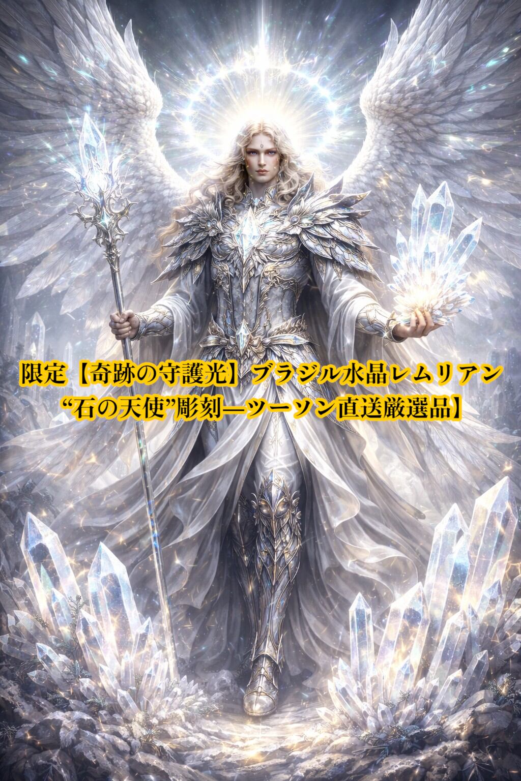 ブラジル産の高透明天然水晶に、古代の叡智を宿すとされるレムリアンシードのエネルギーを込め、神聖な天使の姿を精緻に彫り上げた特別なクリスタルオブジェです。