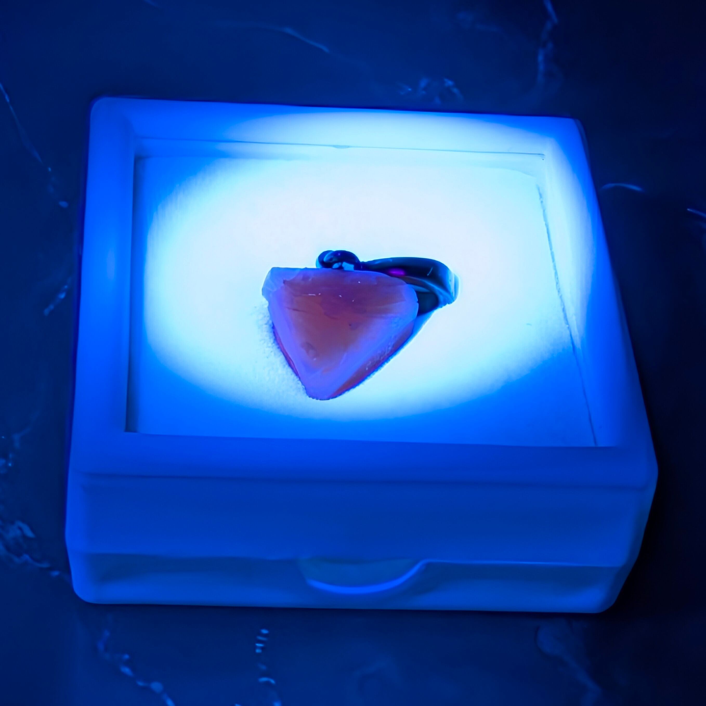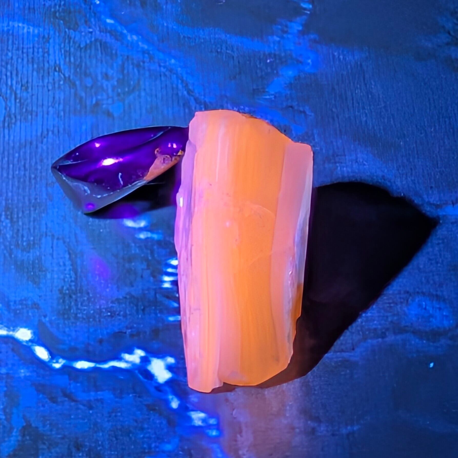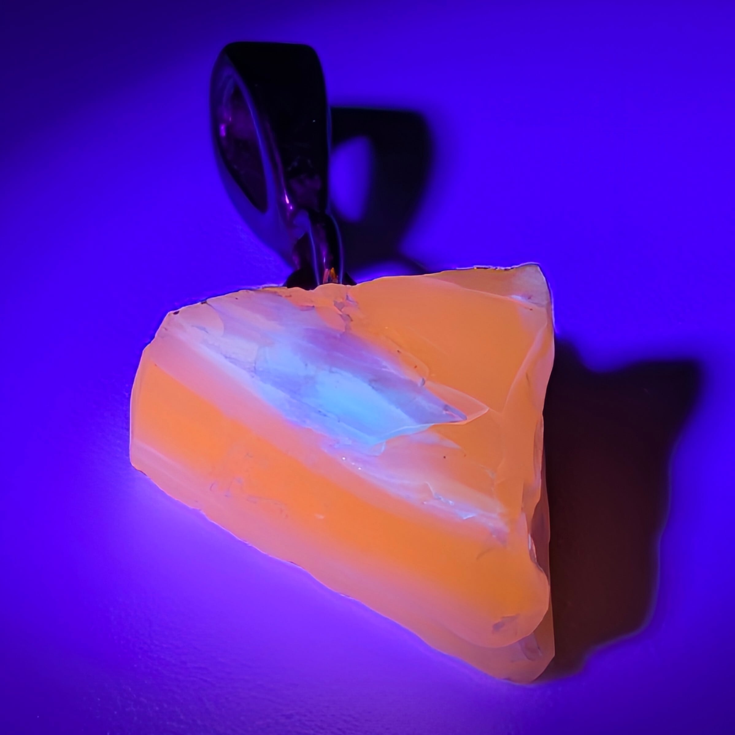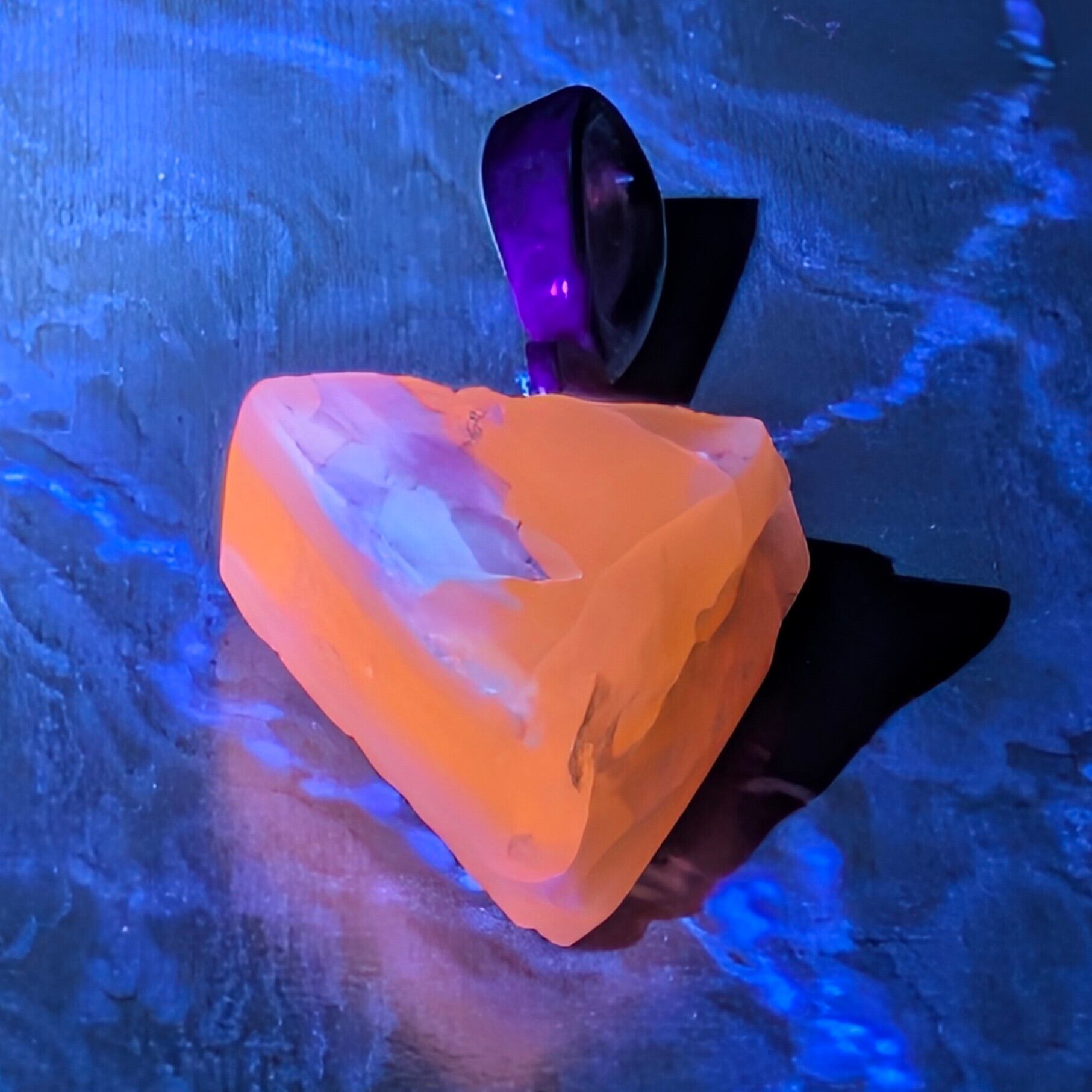 紫外線を当てると赤・緑・青・黄など多彩なネオンカラーを瞬時に放つ蛍光性を持ち、可視光では見えない色までも光として引き出す神秘の天然石