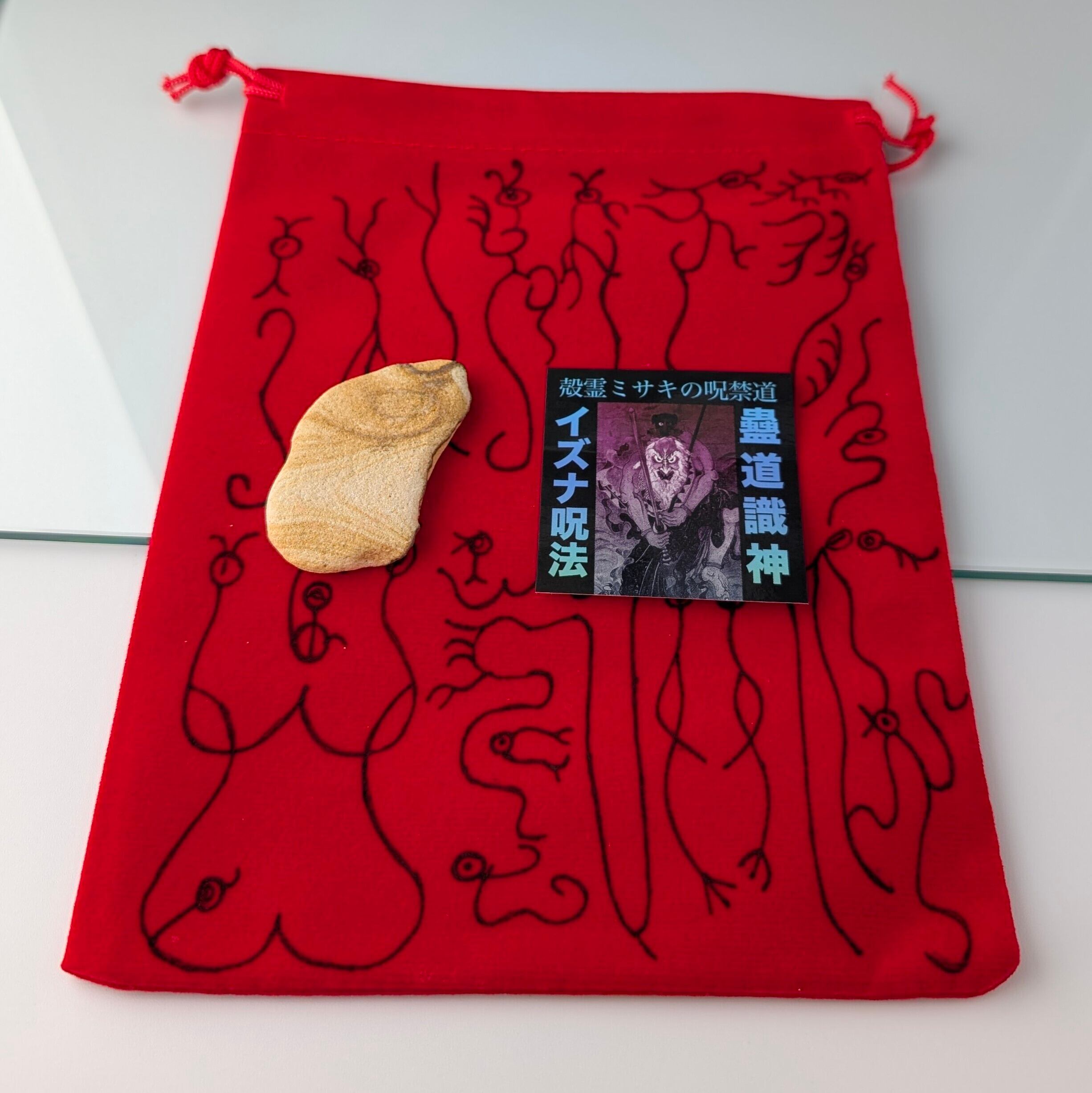 古来より魔除けと幸運招来の象徴とされるレッドフランネルバッグには、呪禁導師の末裔だけに許されると伝わる「絵図呪法」の神秘図を手描きで表現。赤布は世界中の民間呪術において守護と運気上昇を象徴する色とされ、願いを宿す器として古くから用いられてきました。