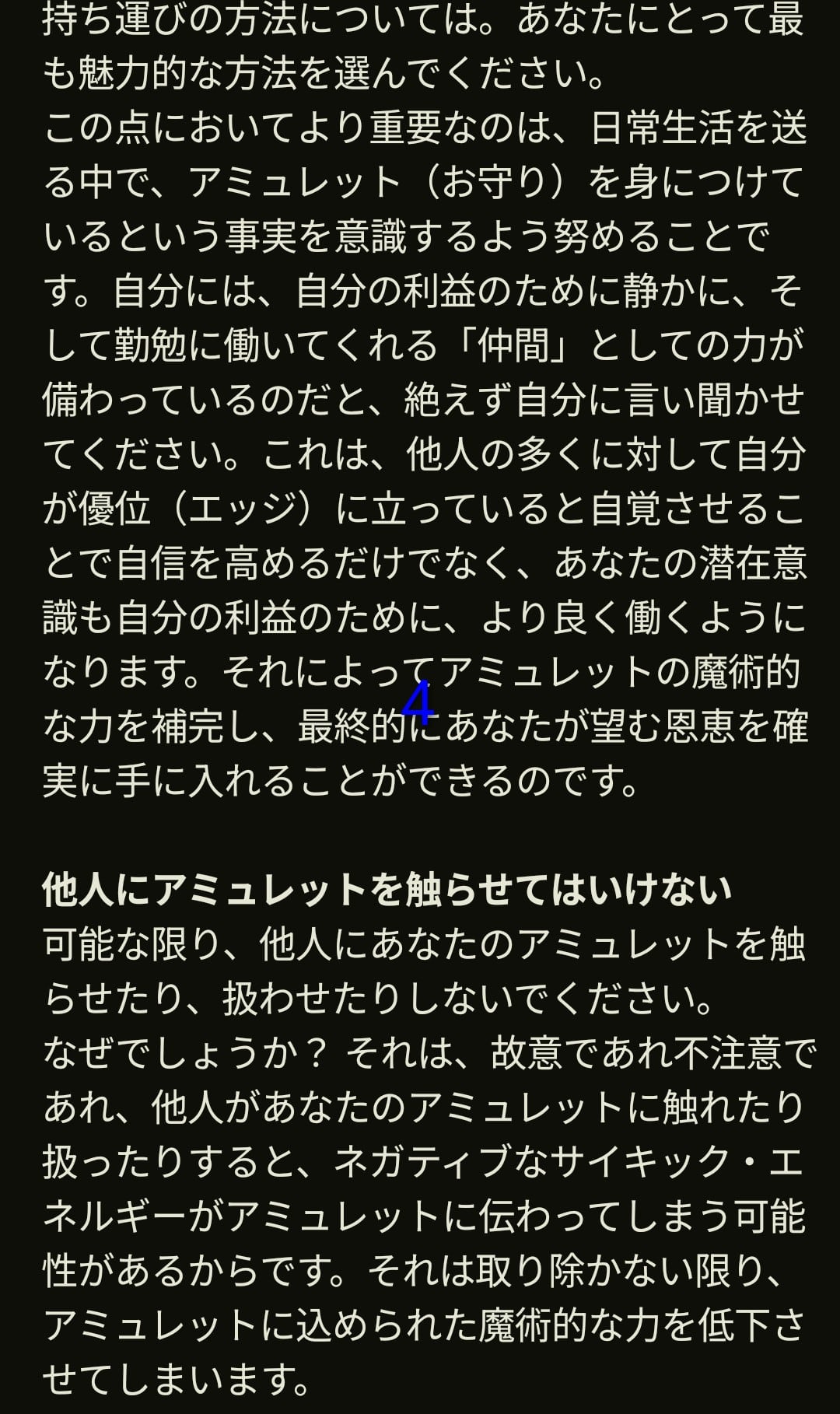 日常で常に身につけ、自分を助ける静かな力が働いていると意識することで潜在意識も働き、効果が高まる。他人に触れさせたり見せたりせず、触れられた場合は塩を用いた浄化と再ロードを行う。また魔術やアミュレットのことは軽々しく他人に語らず、疑いの心を持たないことが重要。信念は魔術の力を強めも弱めもする。ただしアミュレットは努力の代わりではなく、行動と併せて用いることで正しい機会や出会いを引き寄せ、人生の成功と幸福を助けると結ばれている。適切に準備し、願いをロードしたアミュレットは持ち主の意志と潜在意識を結び、良い着想や人との縁、思いがけない好機を導く。完全な盲信ではなく、偏見のない心で実践し、静かに使い続けることが成功の鍵である。努力、信念、沈黙、そして適切な儀式を守ることで、アミュレットは人生をより良い方向へ導く助けとなる。