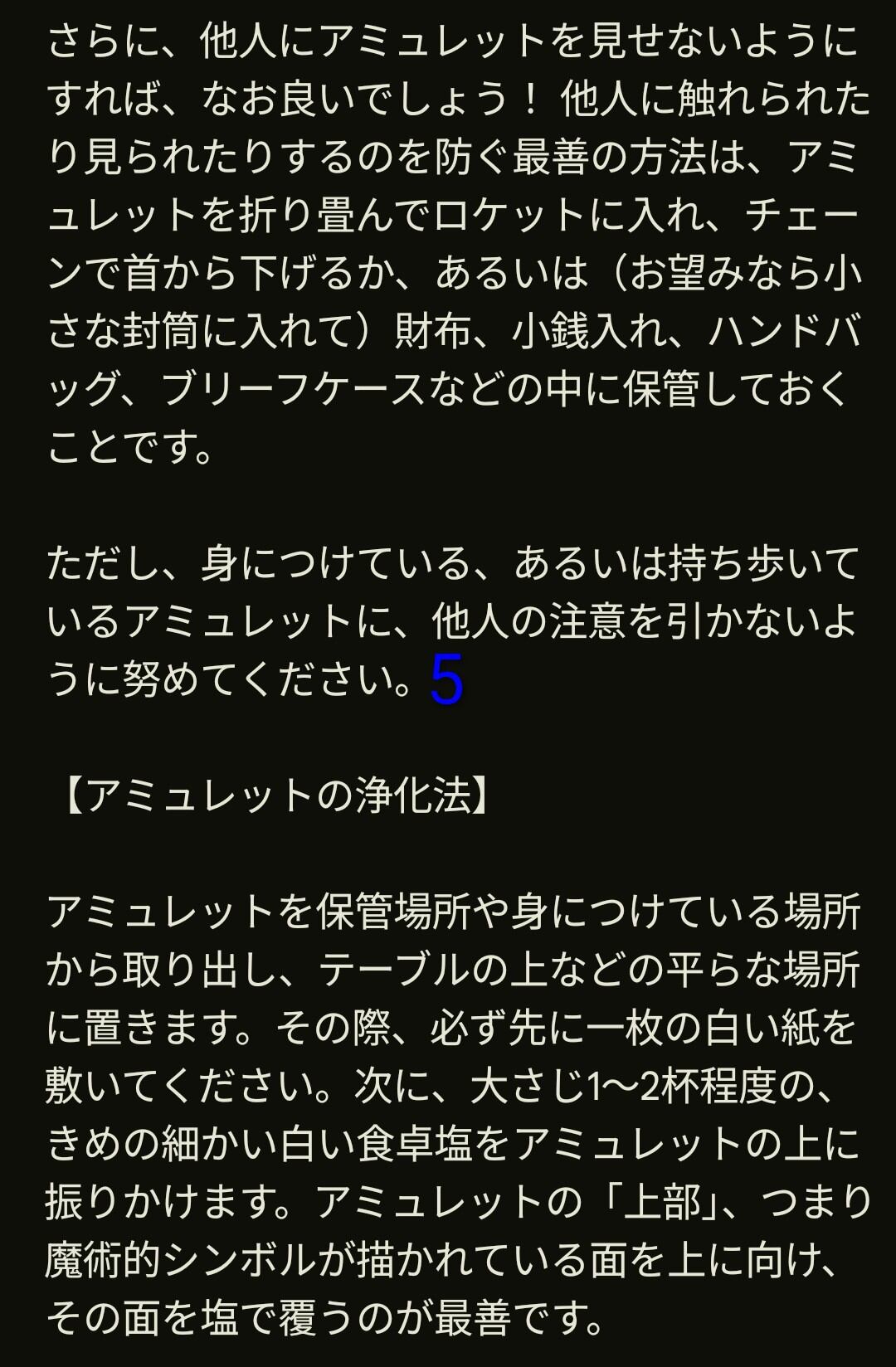 日常で常に身につけ、自分を助ける静かな力が働いていると意識することで潜在意識も働き、効果が高まる。他人に触れさせたり見せたりせず、触れられた場合は塩を用いた浄化と再ロードを行う。また魔術やアミュレットのことは軽々しく他人に語らず、疑いの心を持たないことが重要。信念は魔術の力を強めも弱めもする。ただしアミュレットは努力の代わりではなく、行動と併せて用いることで正しい機会や出会いを引き寄せ、人生の成功と幸福を助けると結ばれている。適切に準備し、願いをロードしたアミュレットは持ち主の意志と潜在意識を結び、良い着想や人との縁、思いがけない好機を導く。完全な盲信ではなく、偏見のない心で実践し、静かに使い続けることが成功の鍵である。努力、信念、沈黙、そして適切な儀式を守ることで、アミュレットは人生をより良い方向へ導く助けとなる。