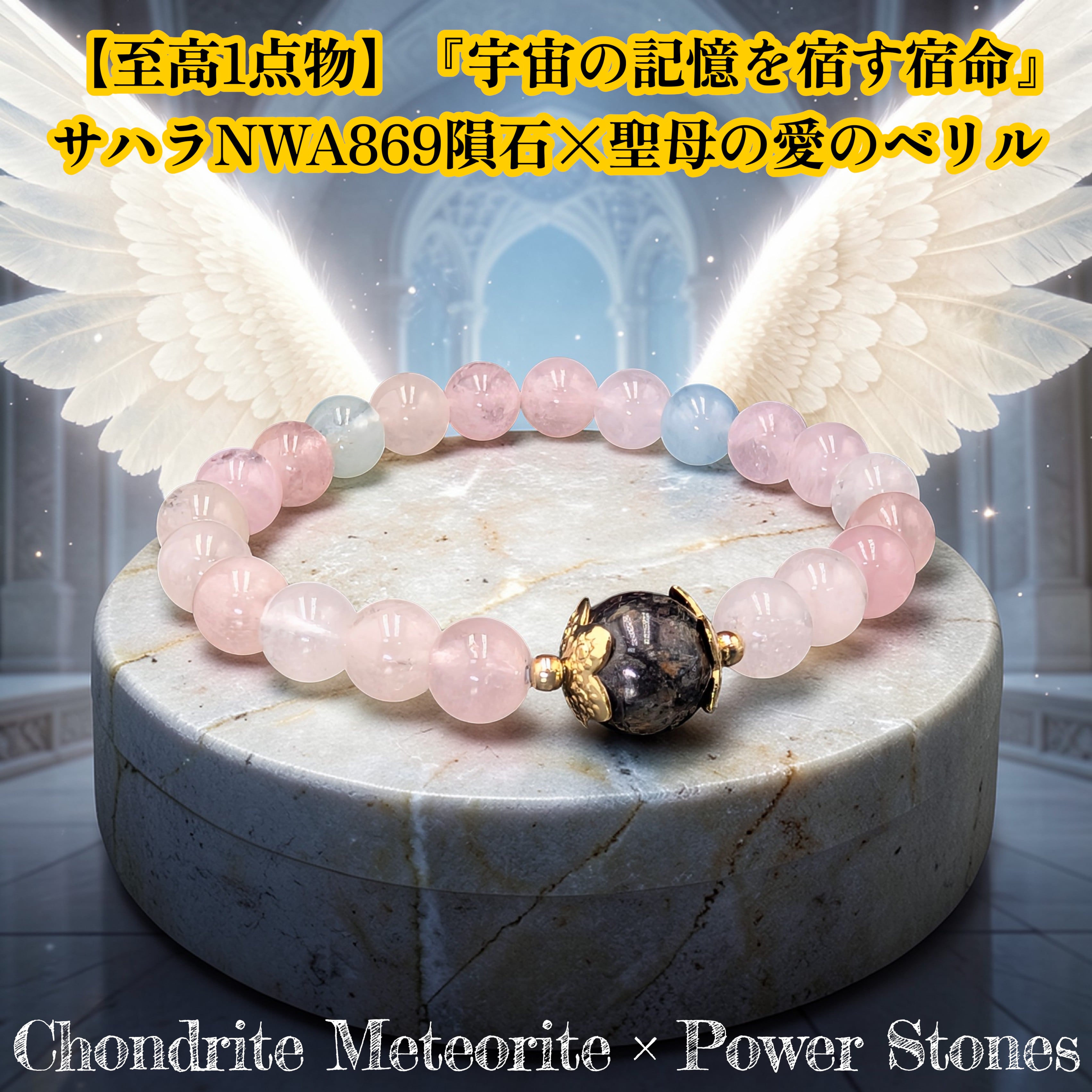 数多の星々を巡り、13億年の時を経て地球へと舞い降りた「サハラNWA869隕石(コンドライト)」。そして、神の愛の周波数を放つ「パステルミックスベリル」。この二つが奇跡の邂逅を果たした、世界に一つだけの限定ブレスレットが誕生しました。
