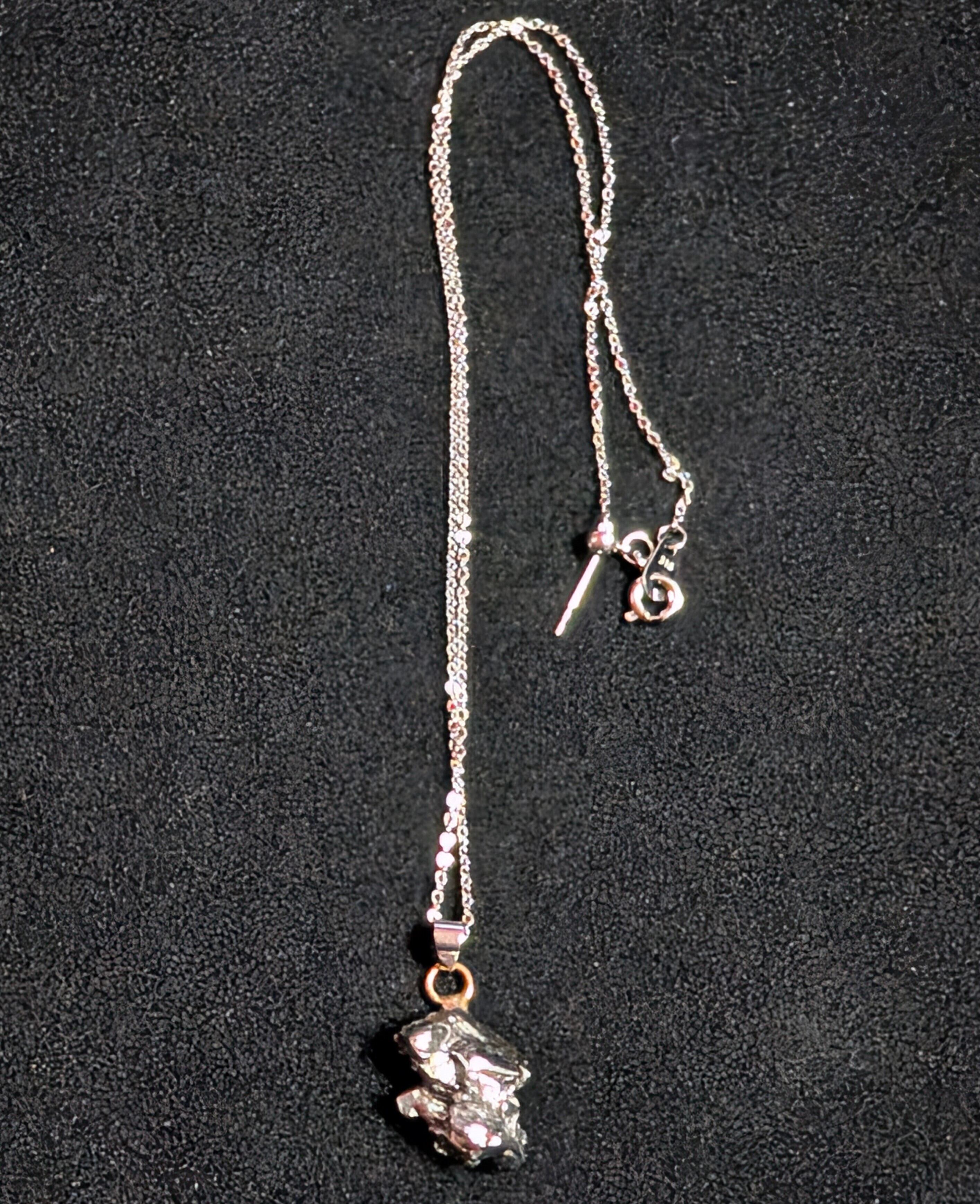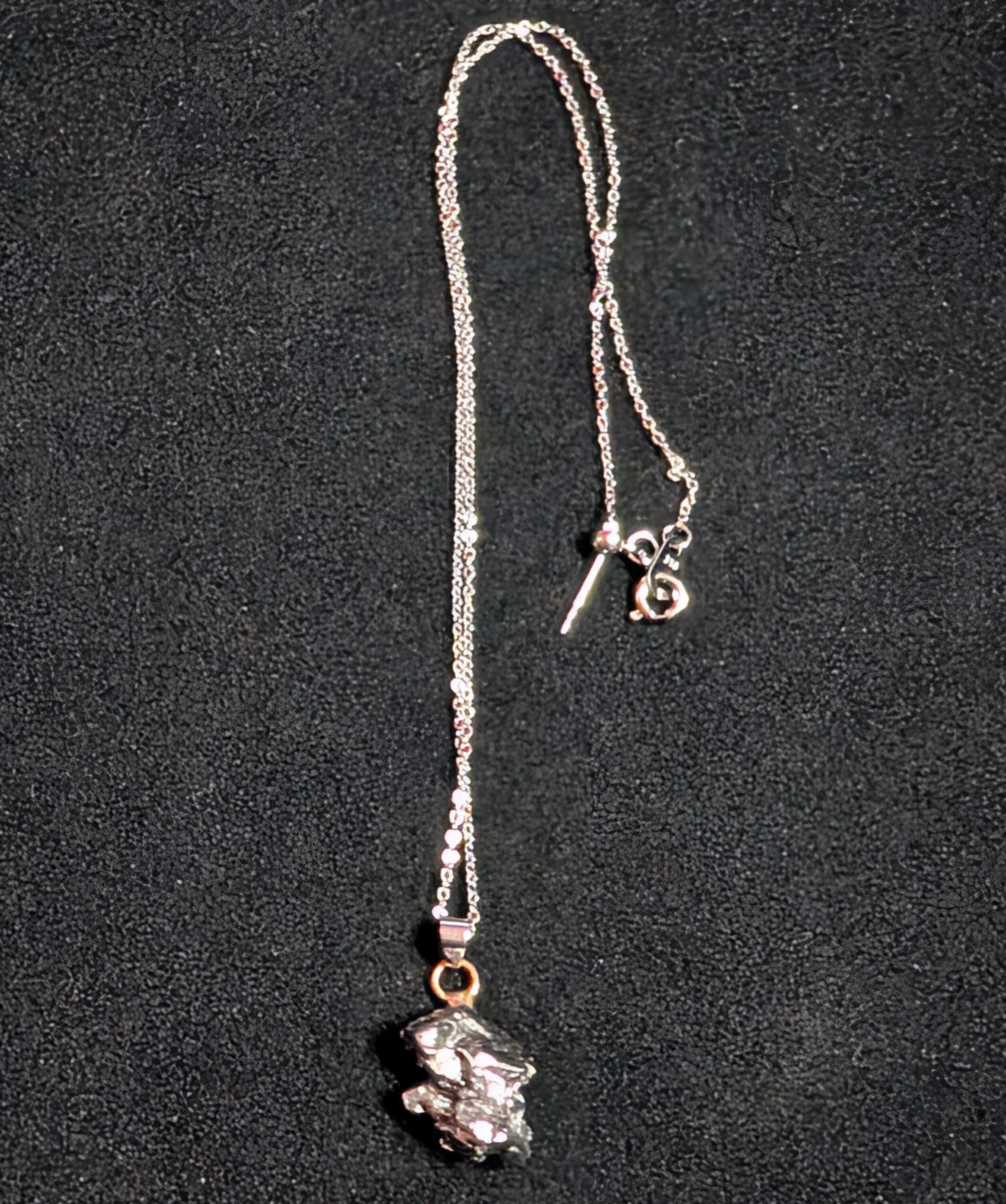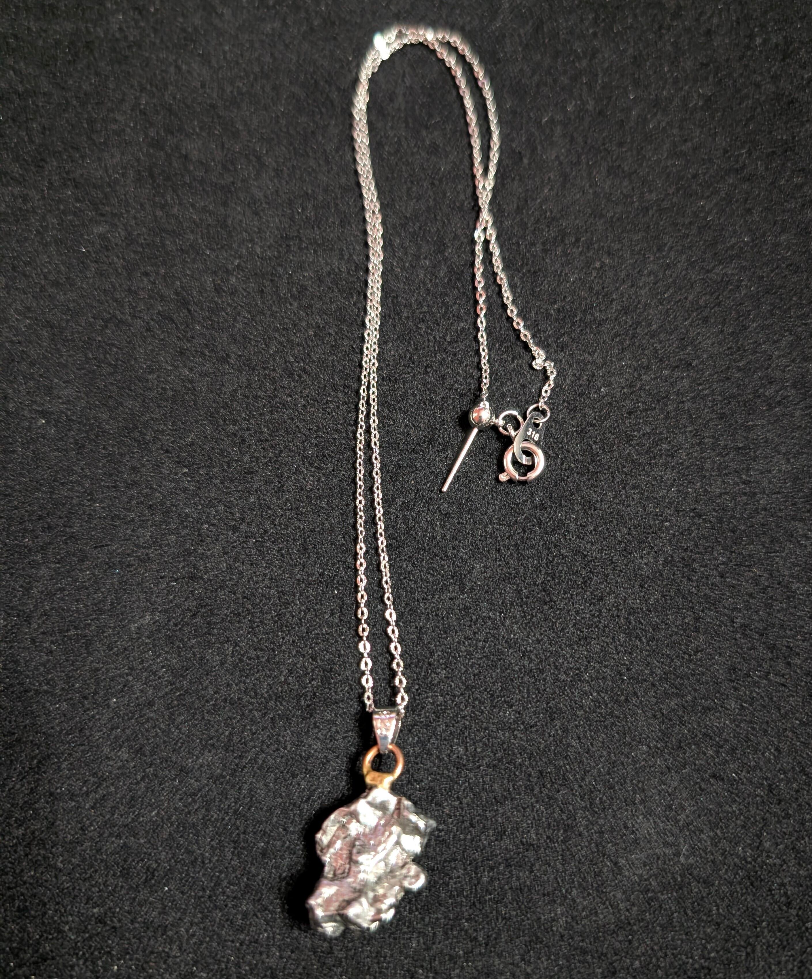 古代より「星の鉄」と呼ばれ、天空の火が大地へ降り注いだ証として崇められてきた神秘の隕石です。本品はその希少な隕鉄を使用した一点物のネックレス。メテオライト特有の金属光沢をそのまま残し、宇宙の鼓動を閉じ込めたかのような輝きを放つ