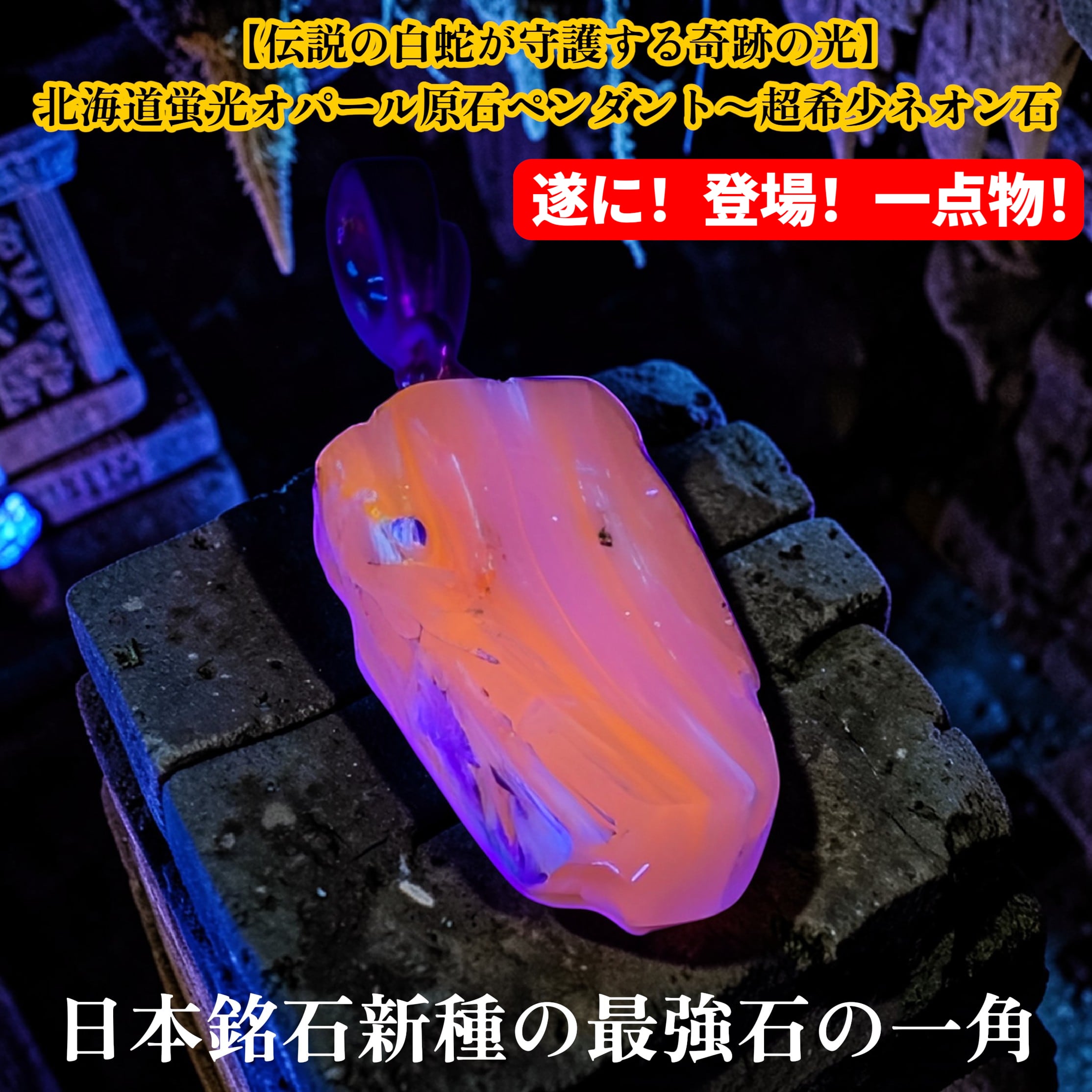 【伝説の白蛇が守護する奇跡の光】北海道蛍光オパール原石ペンダント〜超希少ネオン石