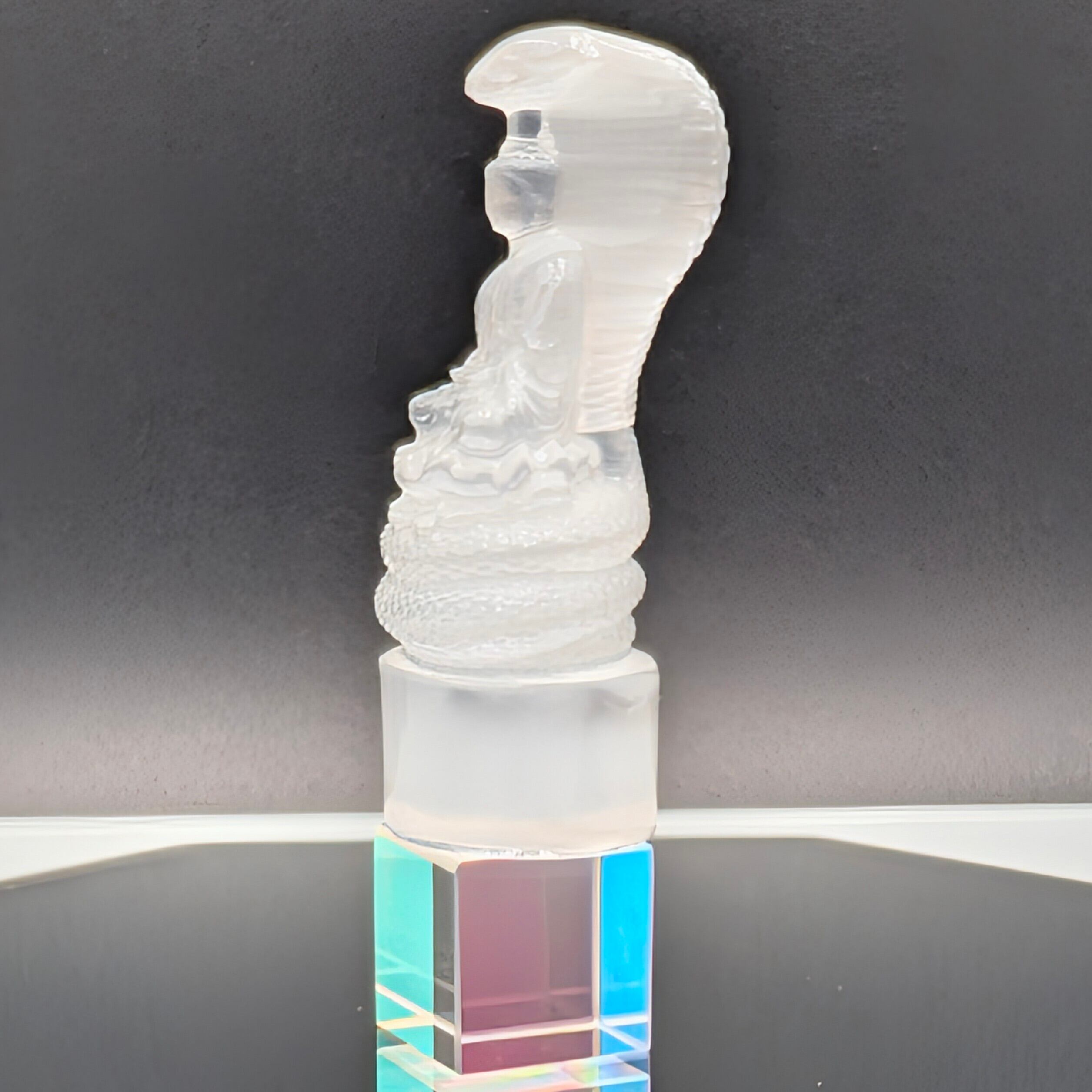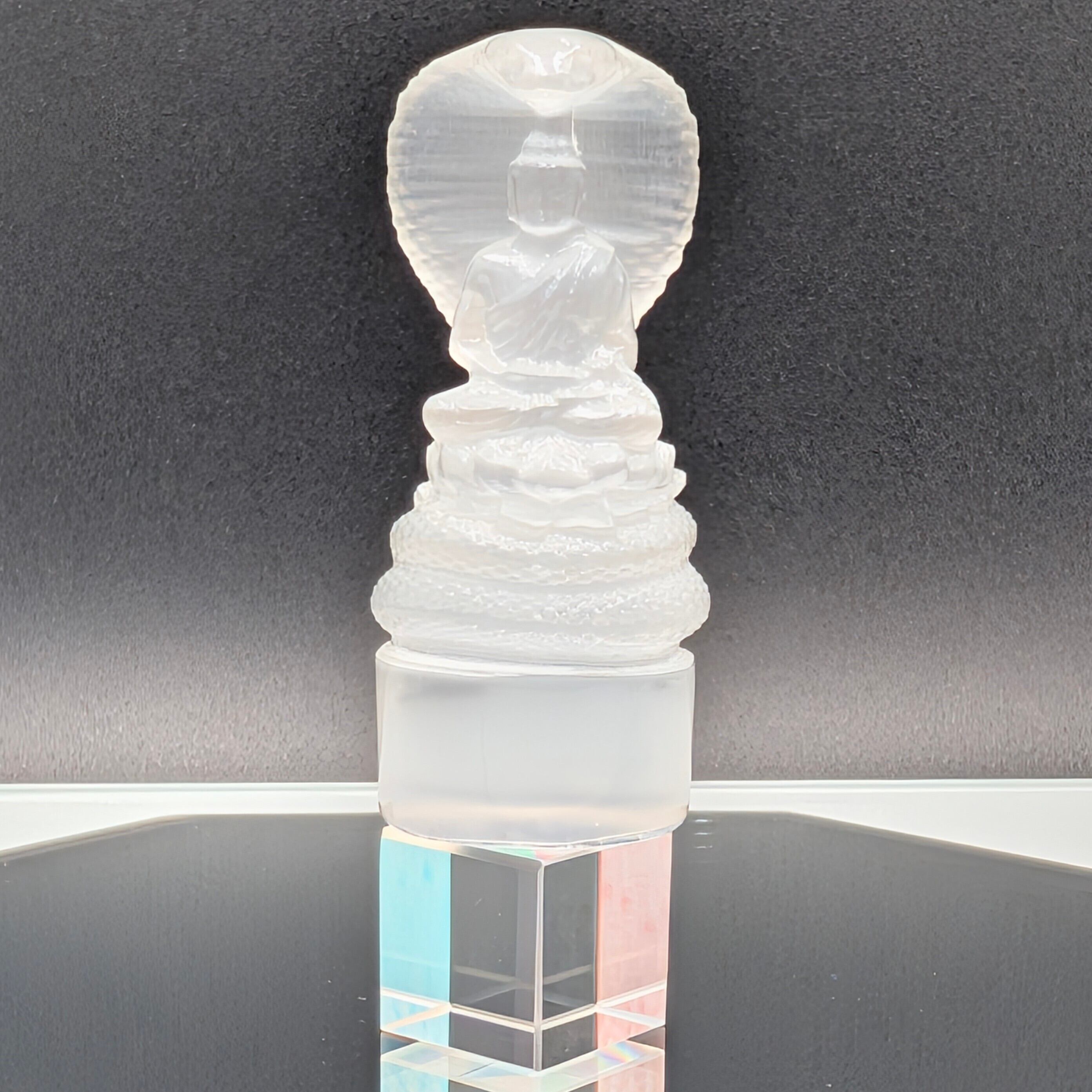 本像はその恩寵を宿す「仏陀と蛇神の融合」像。セレナイト特有の透光が仏陀の背後に柔らかく拡がり、まるで天上の光が降り注ぐよう。