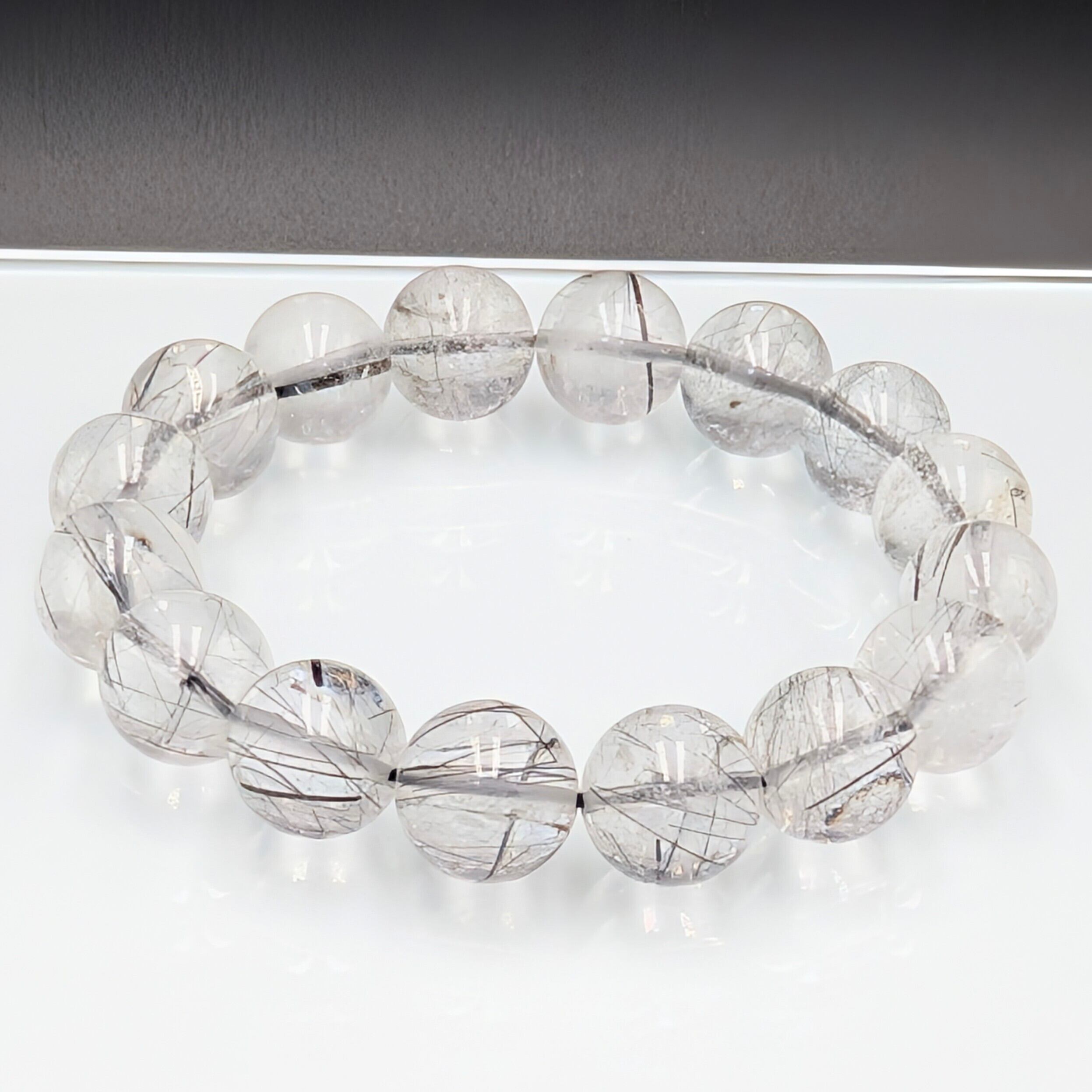 特徴: 透明度の高い水晶に、全粒トルマリン針を内包。中には力強い太針を含む珠もあり、一粒一粒が異なる表情を見せる一点