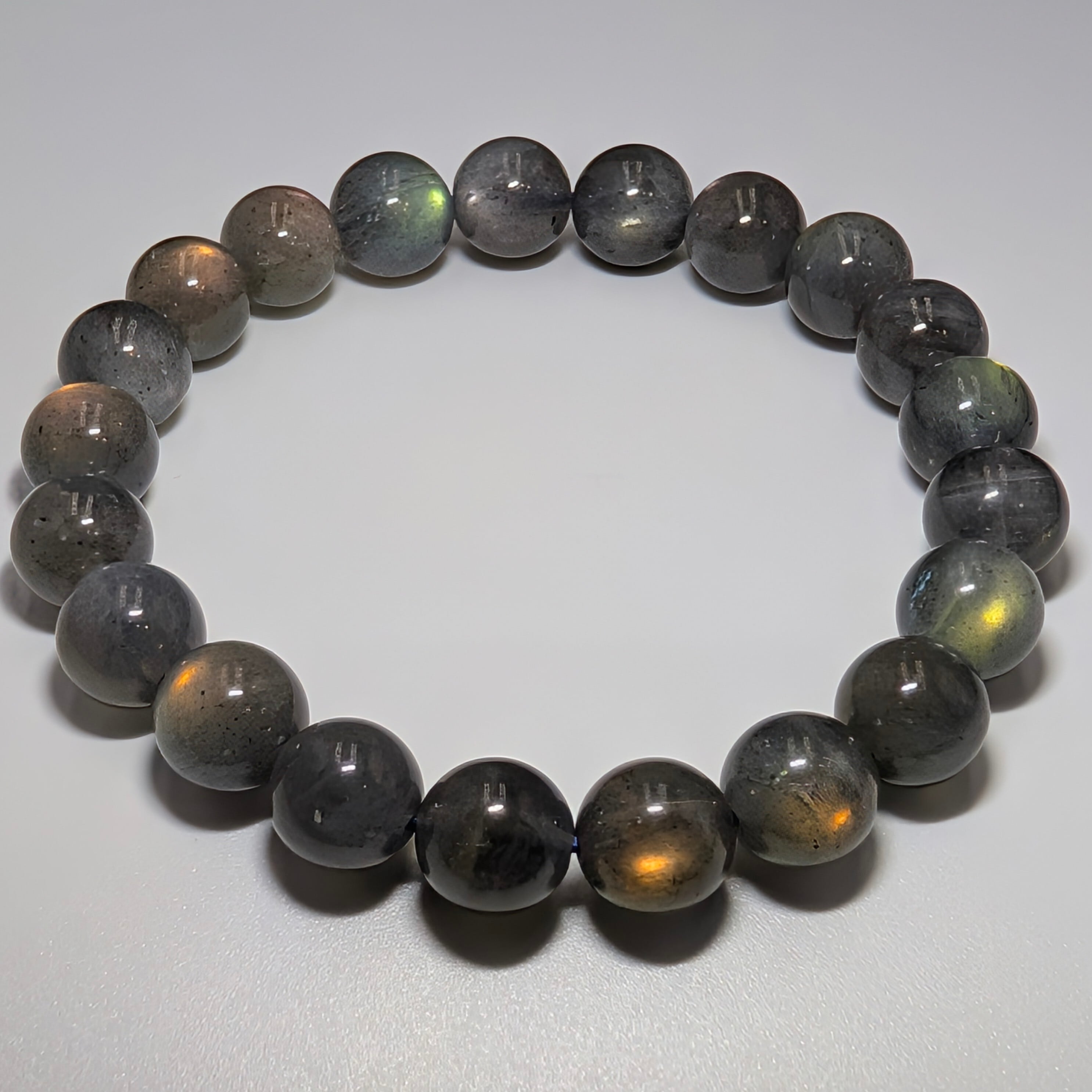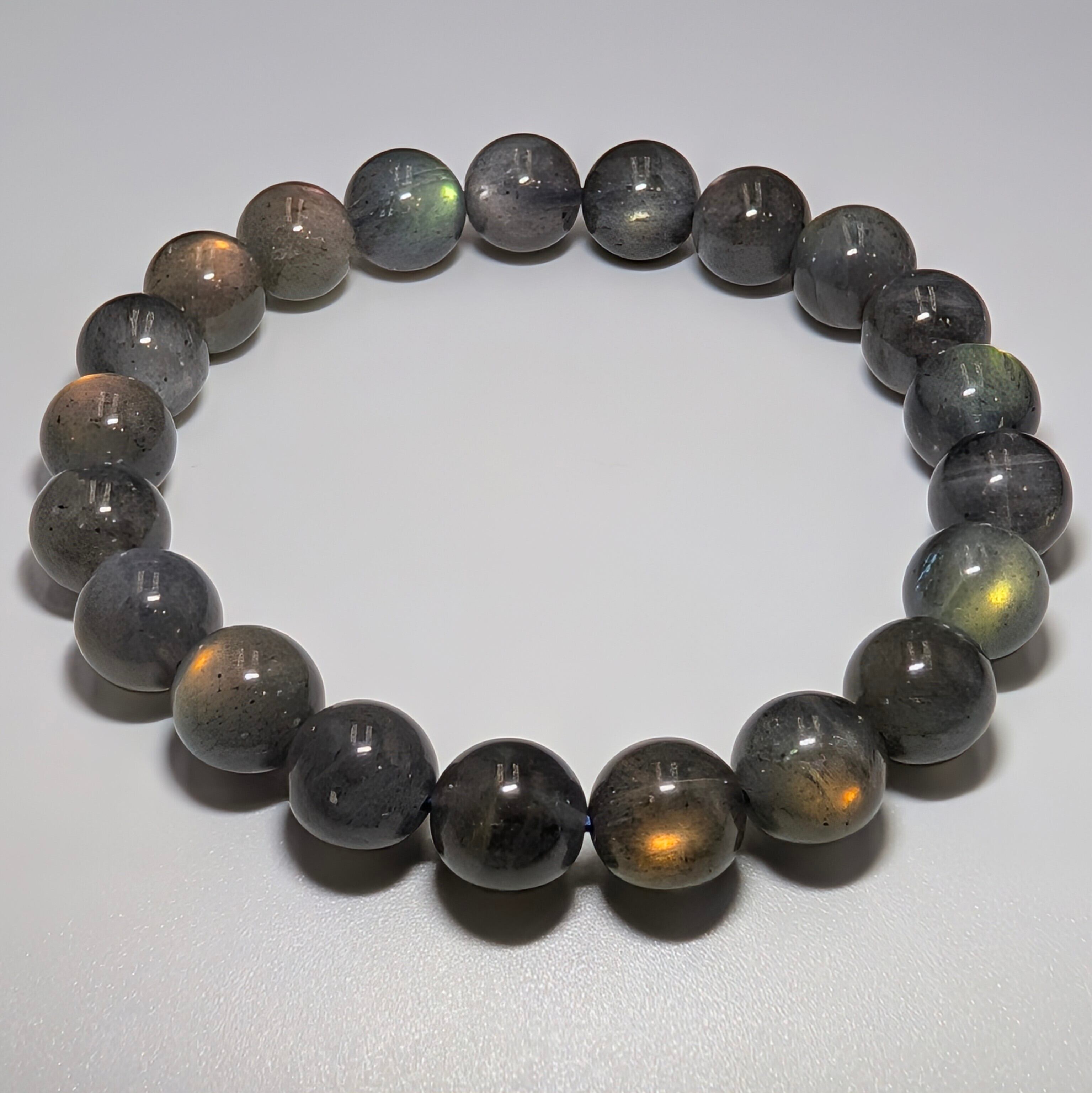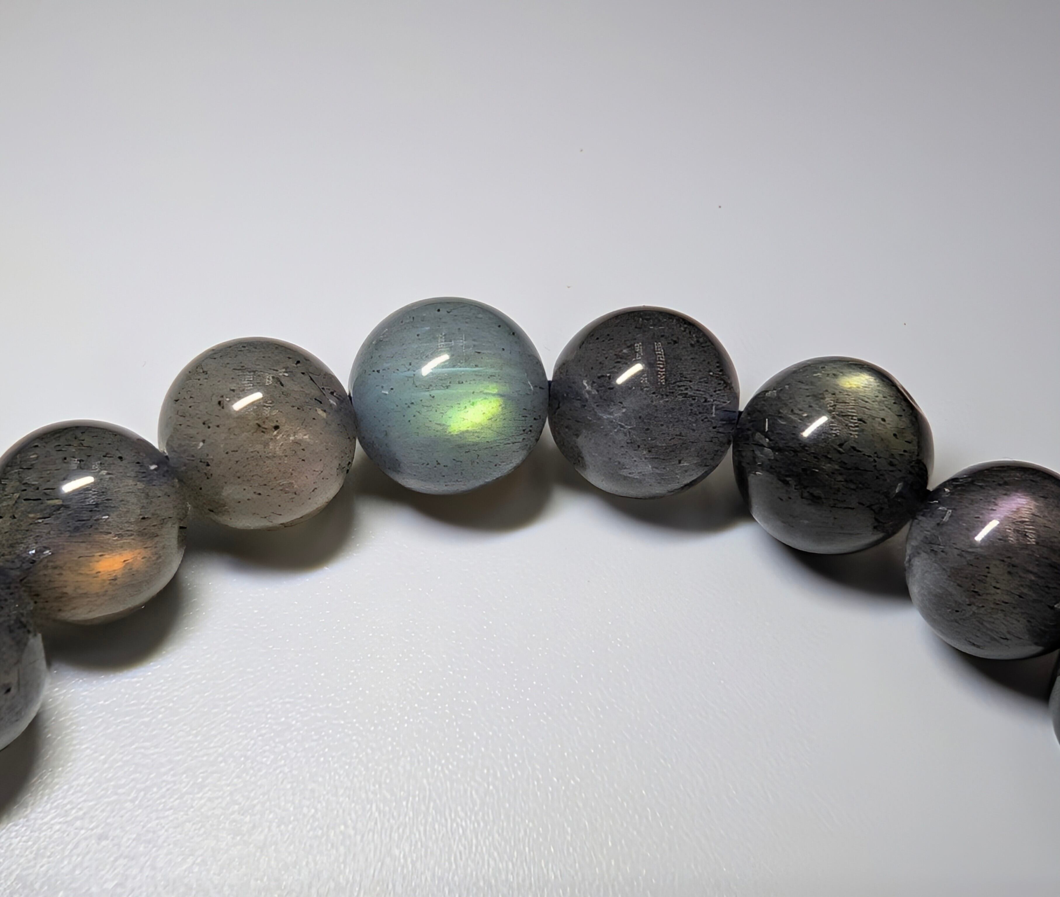 全珠に美しいラブラドレッセンス(遊色効果)を確認できる高品質ブレスレットです。透明感のある珠も含まれ、青や緑、金、オレンジ、時に紫を帯びた、幻のラブラドライトとも云われるピンクゴールドの閃光が角度によって幻想的に輝きます。