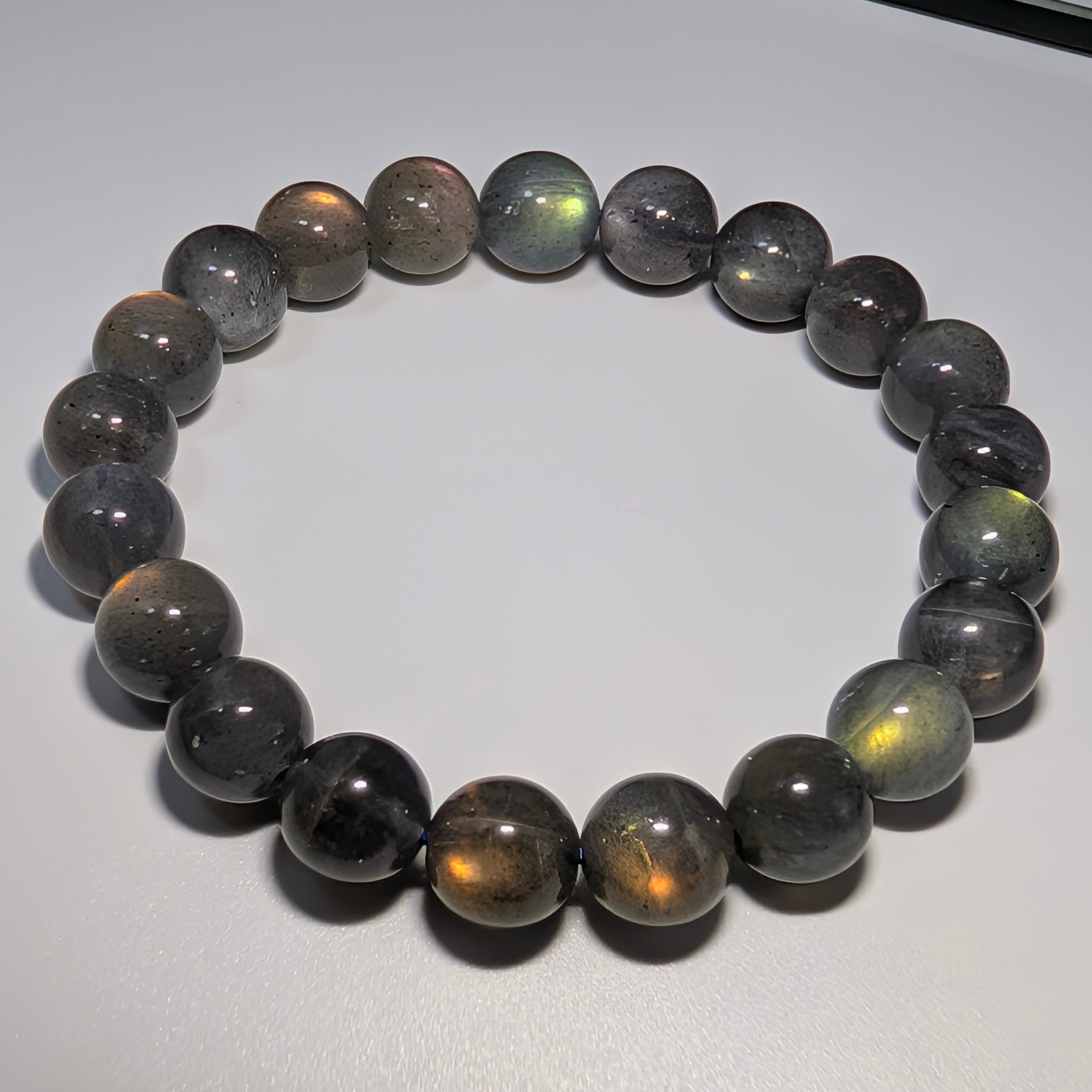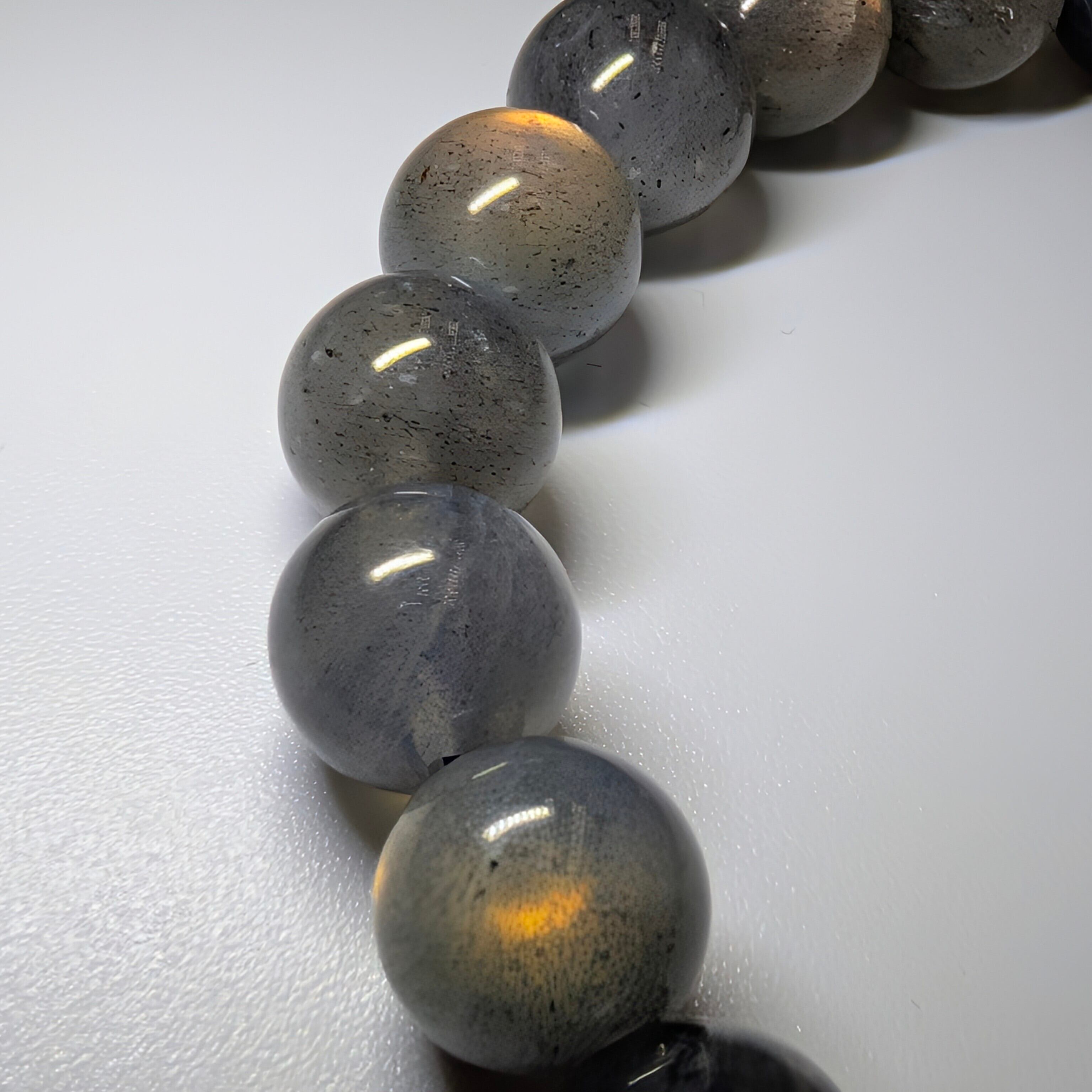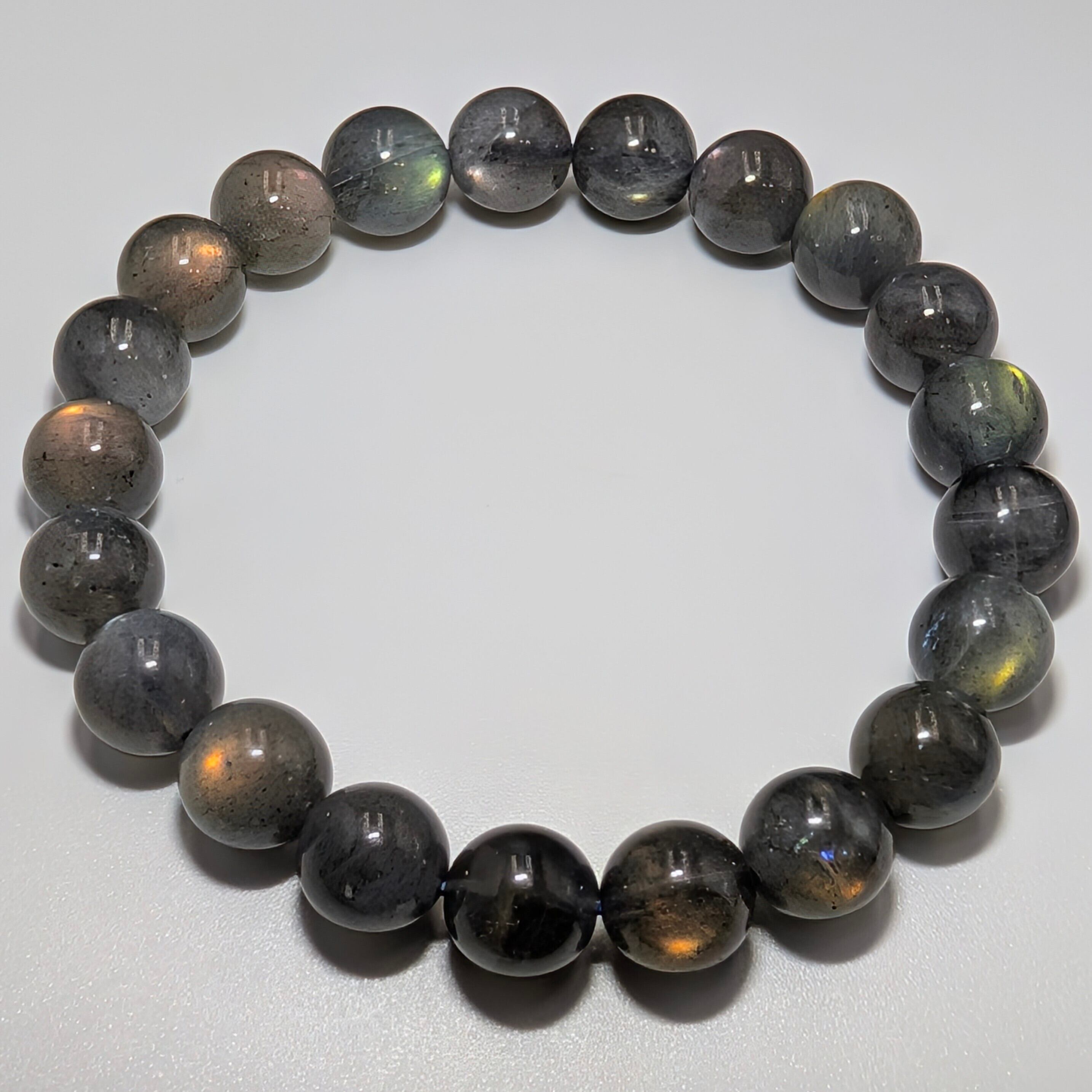 全珠に美しいラブラドレッセンス(遊色効果)を確認できる高品質ブレスレットです。透明感のある珠も含まれ、青や緑、金、オレンジ、時に紫を帯びた、幻のラブラドライトとも云われるピンクゴールドの閃光が角度によって幻想的に輝きます。