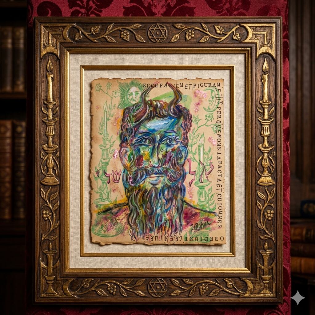 ※ソロモン王の鍵 シャダイの代理人であり象徴でもある大天使メタトロンの顔、エルシャダイ。太陽の1の護符のペンタクルの周りに書かれている、ラテン語で「あらゆるものの創造主であり、すべての生き物が従う あのお方の顔とお姿を心に抱け」 の文字と、ヘブライ語のエル・シャダイを加えてあります。